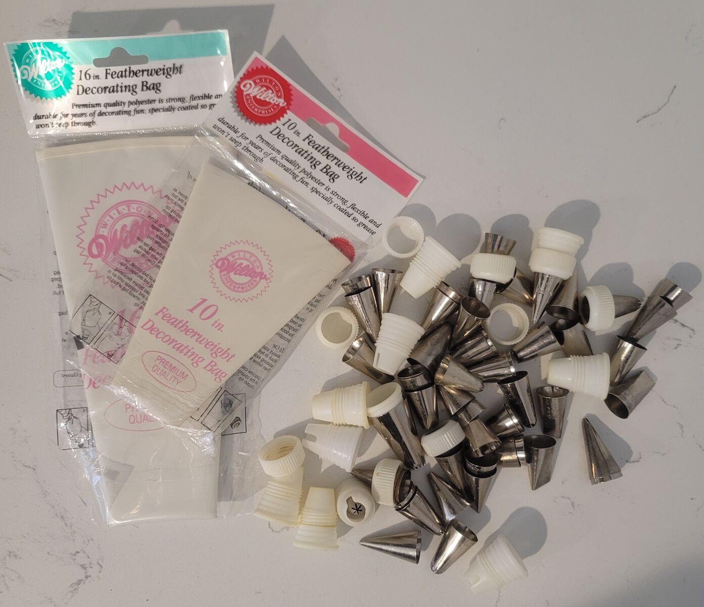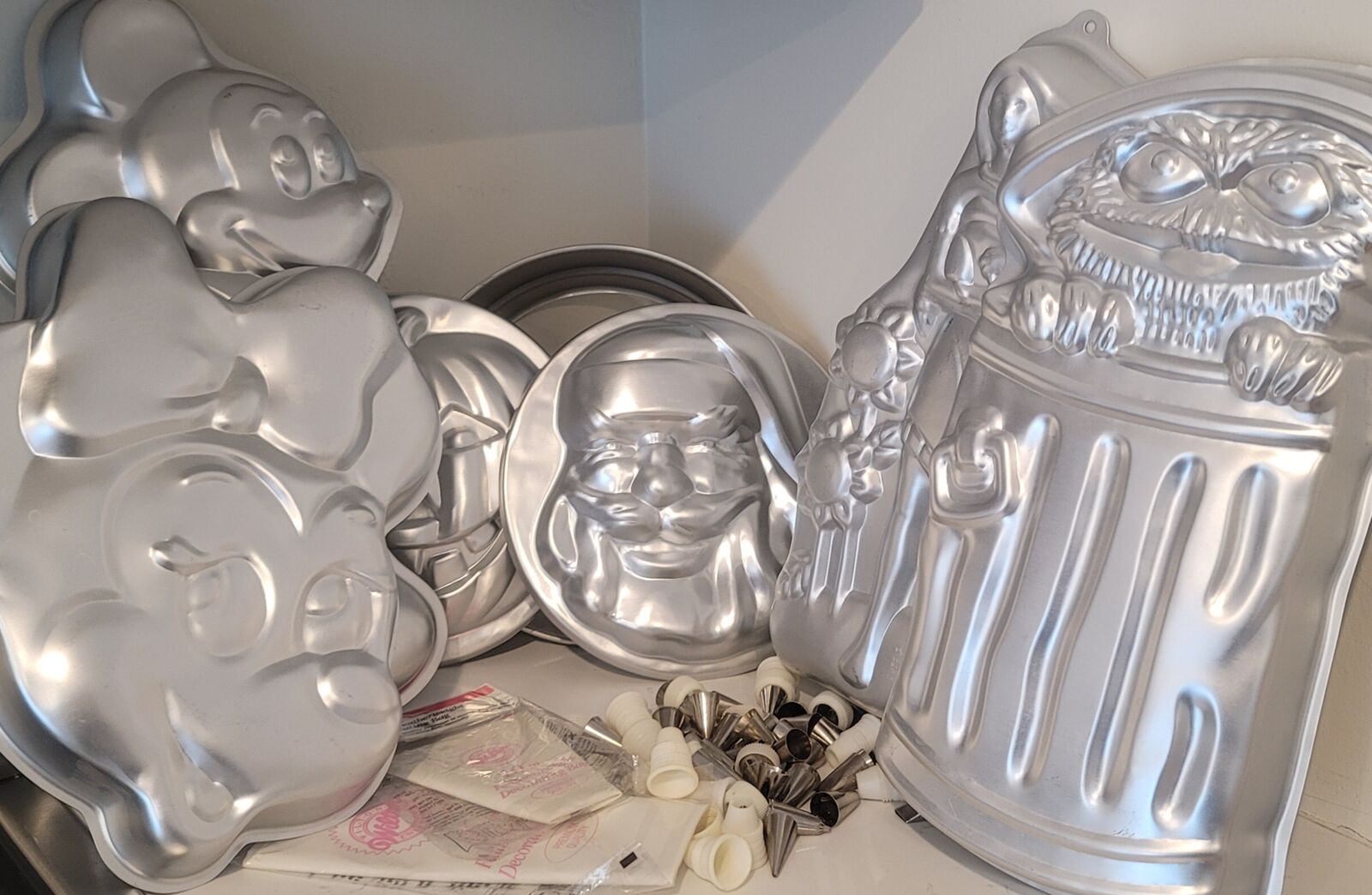 Vintage 1970's Wilton Baking Cake Pans plus decorating tips and bags. All in good condition. Includes Mickey Mouse, Minnie Mouse, Jack o lantern, Santa. Pocahontas, and Oscar the Grouch. Cash pick up in Magna or Salt Lake.