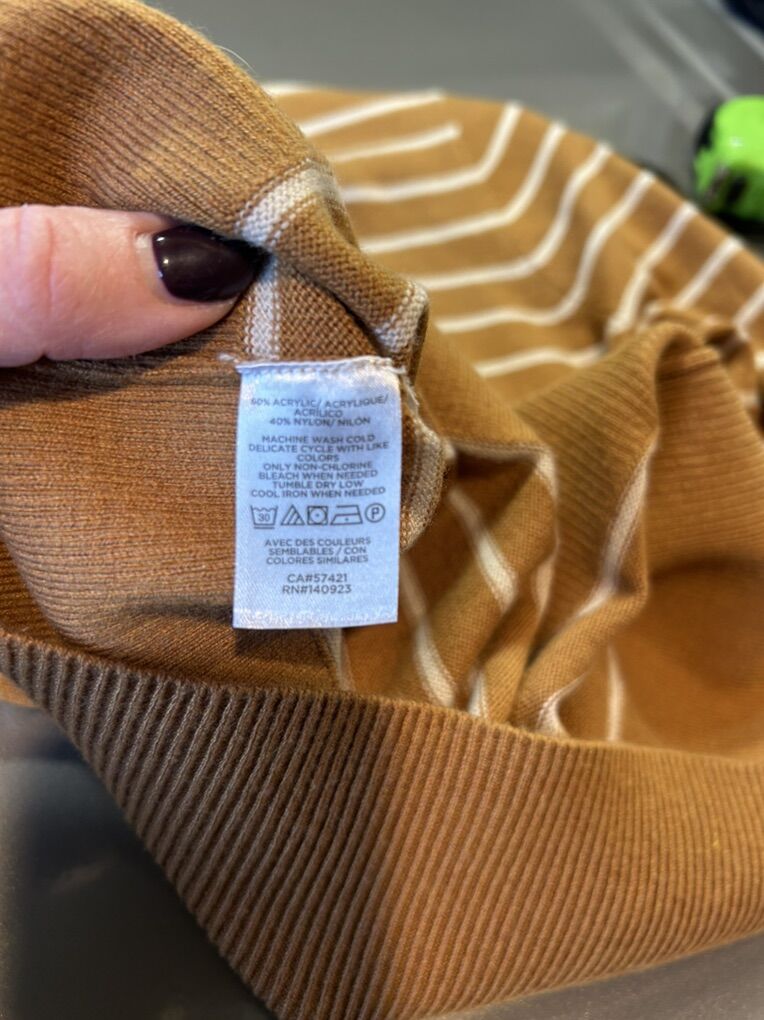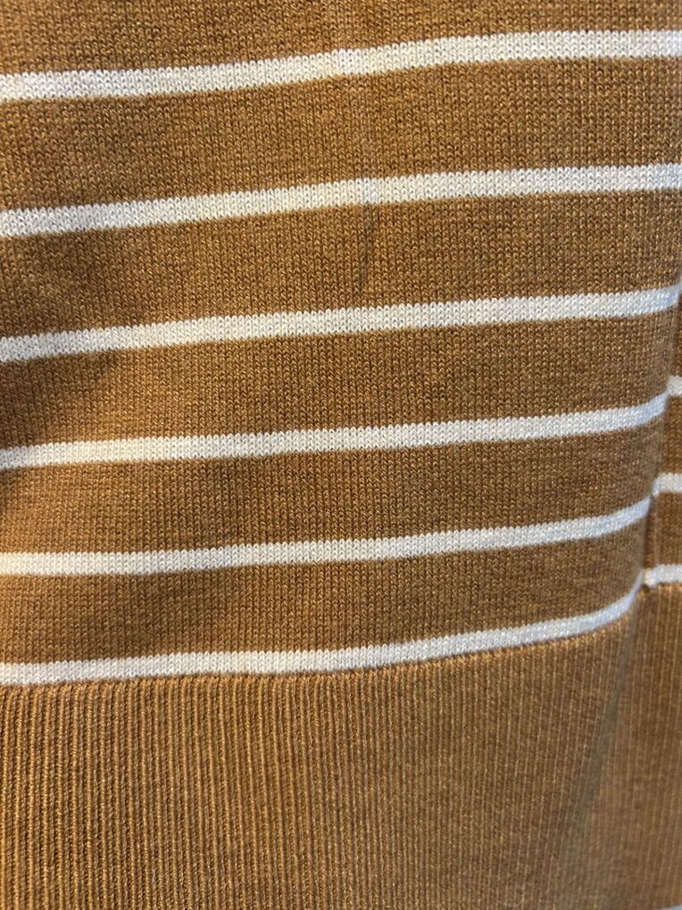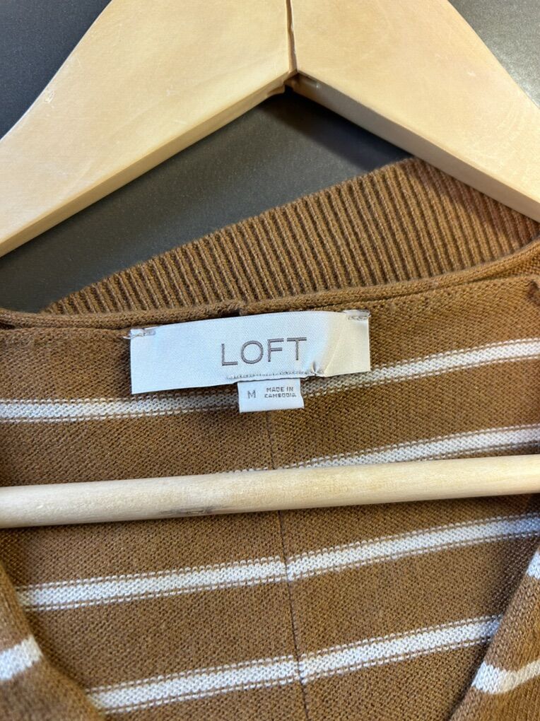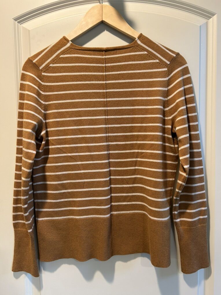 VenmoLike new women’s size medium Loft tan Carmel colored with creme stripes long sleeve v neck pull over sweater. No flaws or stains. Clean smoke free. Cash or Venmo. Pick up from alpine.