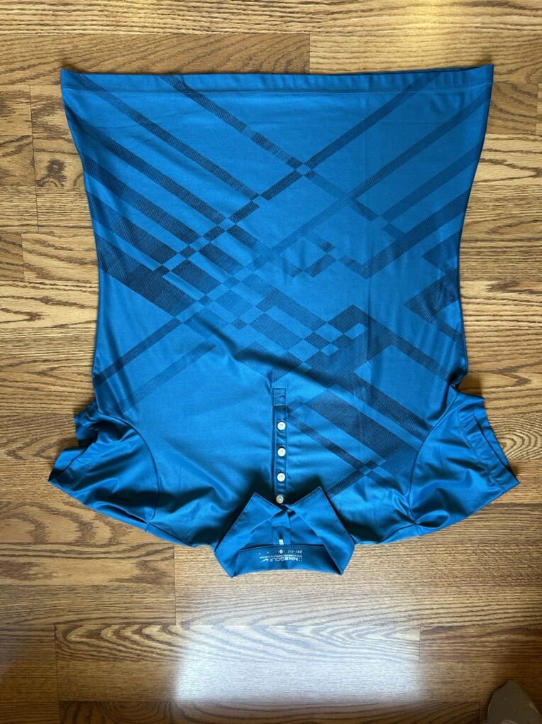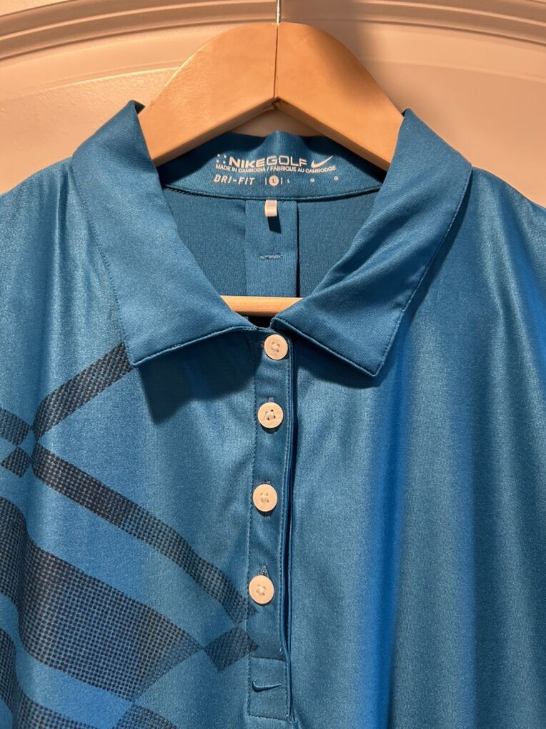VenmoLike new condition women’s size large Nike Golf polo in beautiful teal blue with black designs on the bottom front. Clean smoke free. No flaws. Figure flattering fit. Gathers on the sleeve for a nice feminine touch. Cash or Venmo. Pick up from Alpine.