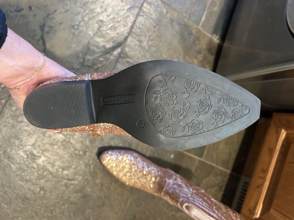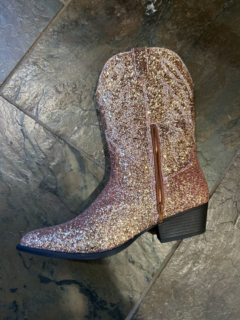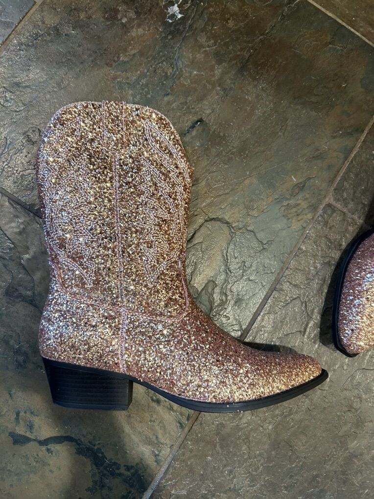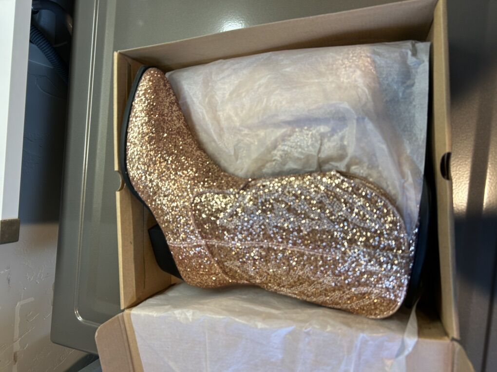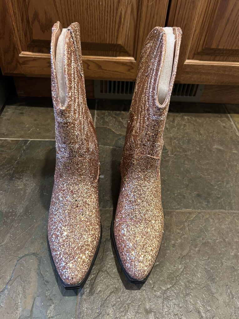 VenmoLike new worn once, too big for me, Portland glitter rose gold western cowboy boots size 9.5 9 1/2. Comfortable. Easy on easy off. Hard to find. Mid calf height. Clean smoke free. Cash or Venmo. Pick up from Alpine.