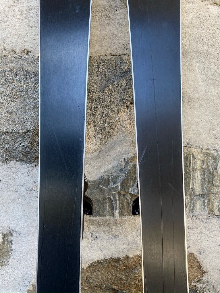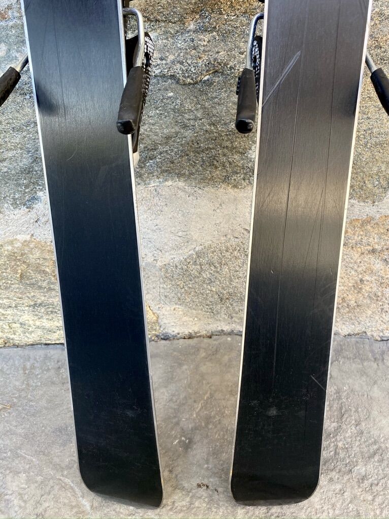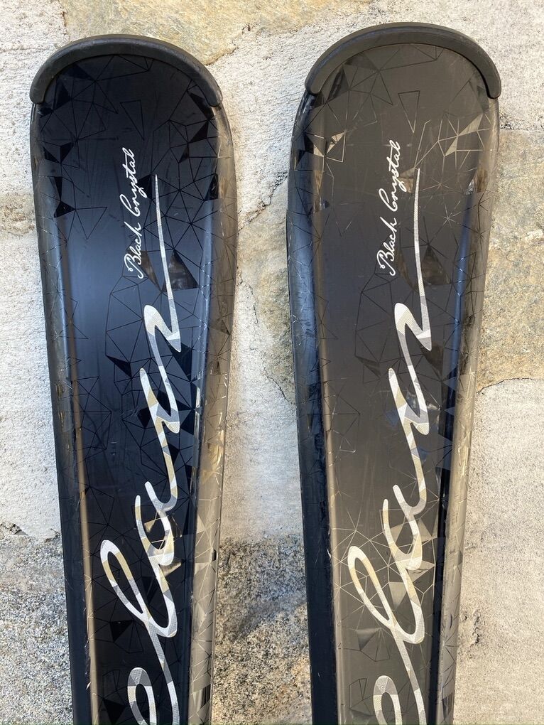 Elan 140 cm black crystal QT7.5 with bindings. In decent shape, with some scuffing and grooves; see pictures for more details