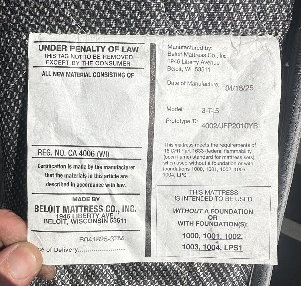 Size: 28” W x 73” L x 8” Thick Condition: Brand New (with small factory defect on one side) Manufacturer: Beloit Mattress Co., Beloit, Wisconsin Model: 3-T-5 (Manufactured April 2025)