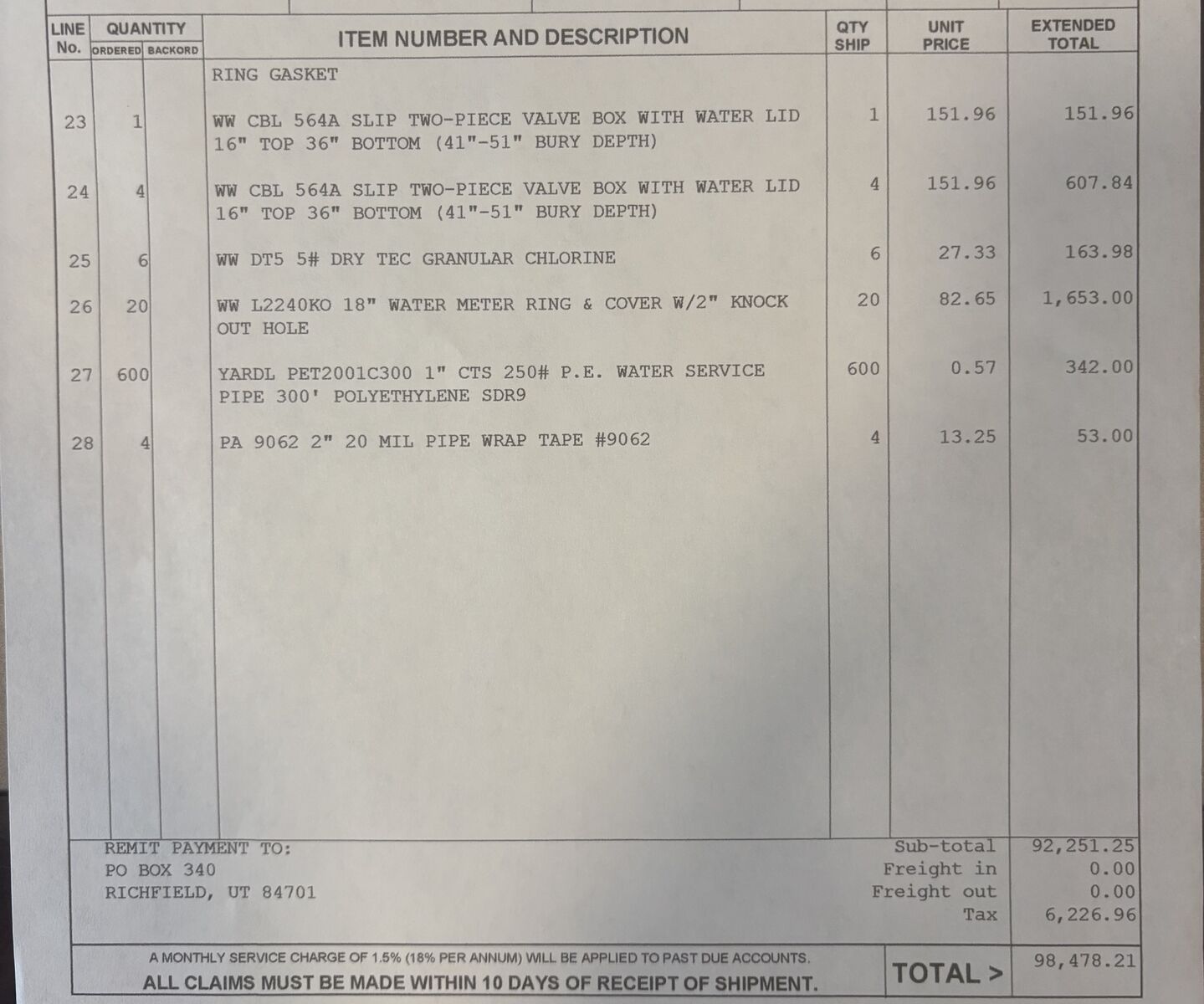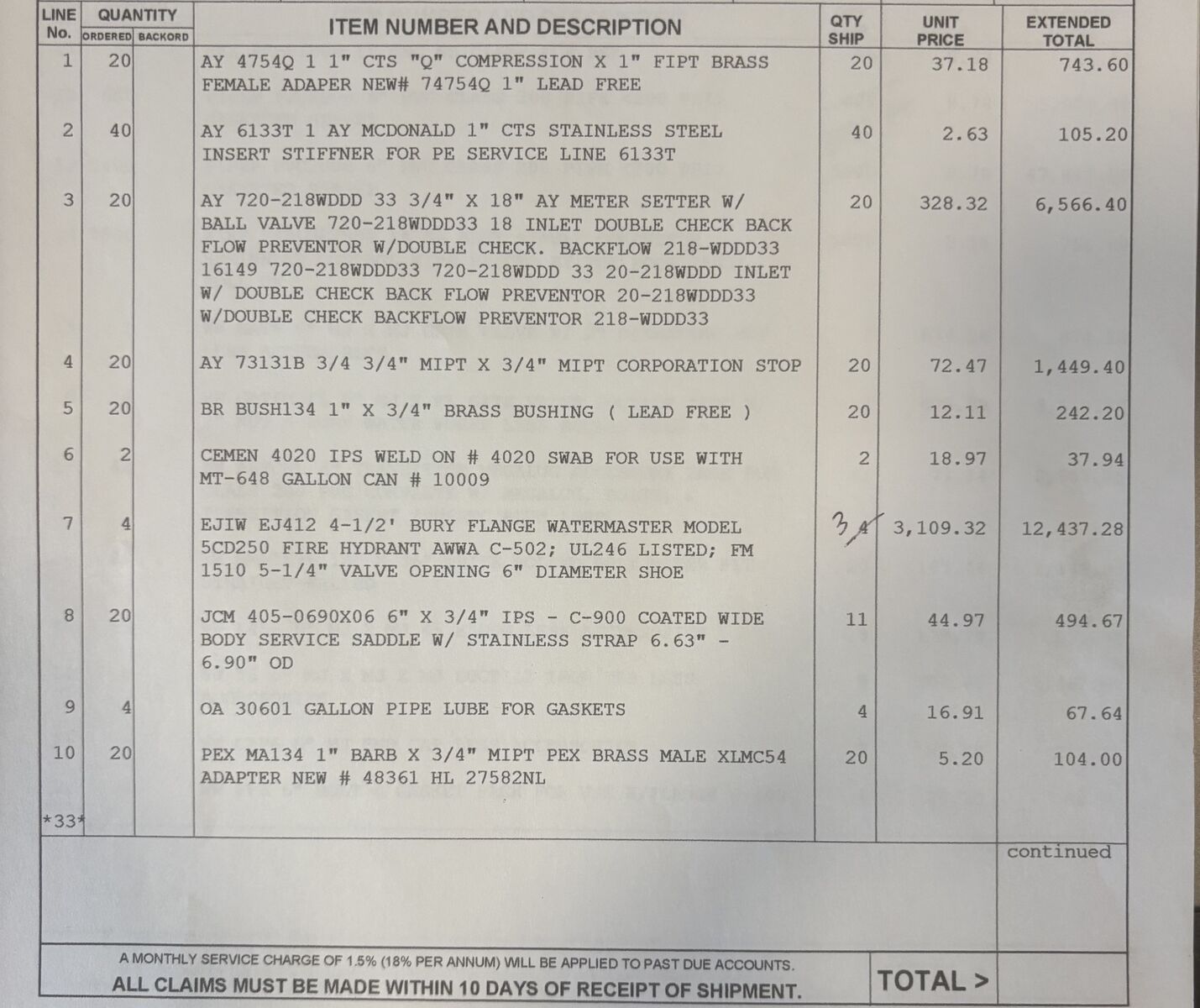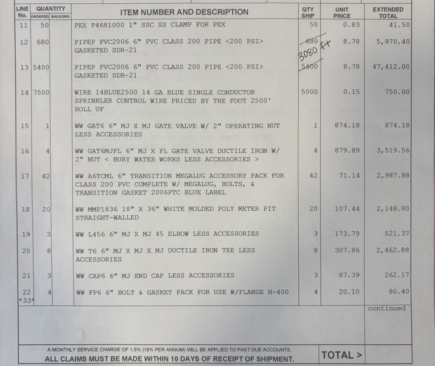 3080' of 6 gasket pipe, fittings, fire hydrants, ect. All items are listed in the pictures. We bought it for a subdivision and then the town later denied us to use 6 pipe and we were unable to return the items. We paid 70K and are asking 60K or any resonable offer. We are willing to sell parts of the lot for our cost if interested in only parts. Our loss is your gain. Let me know if you have any questions.