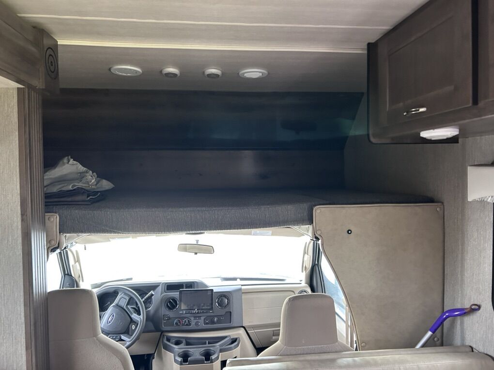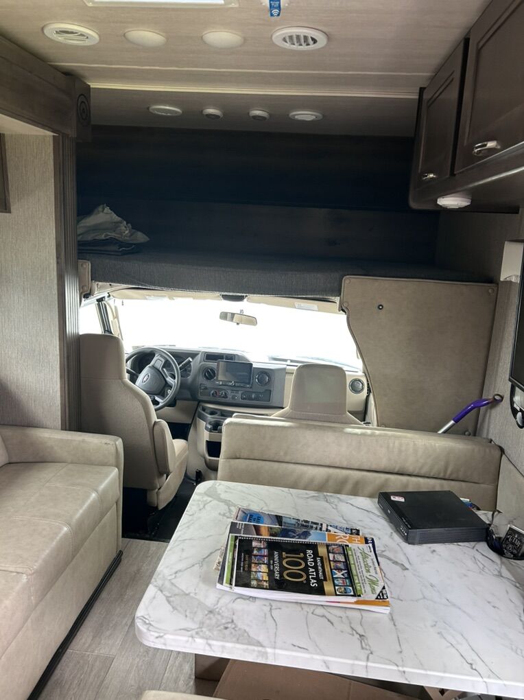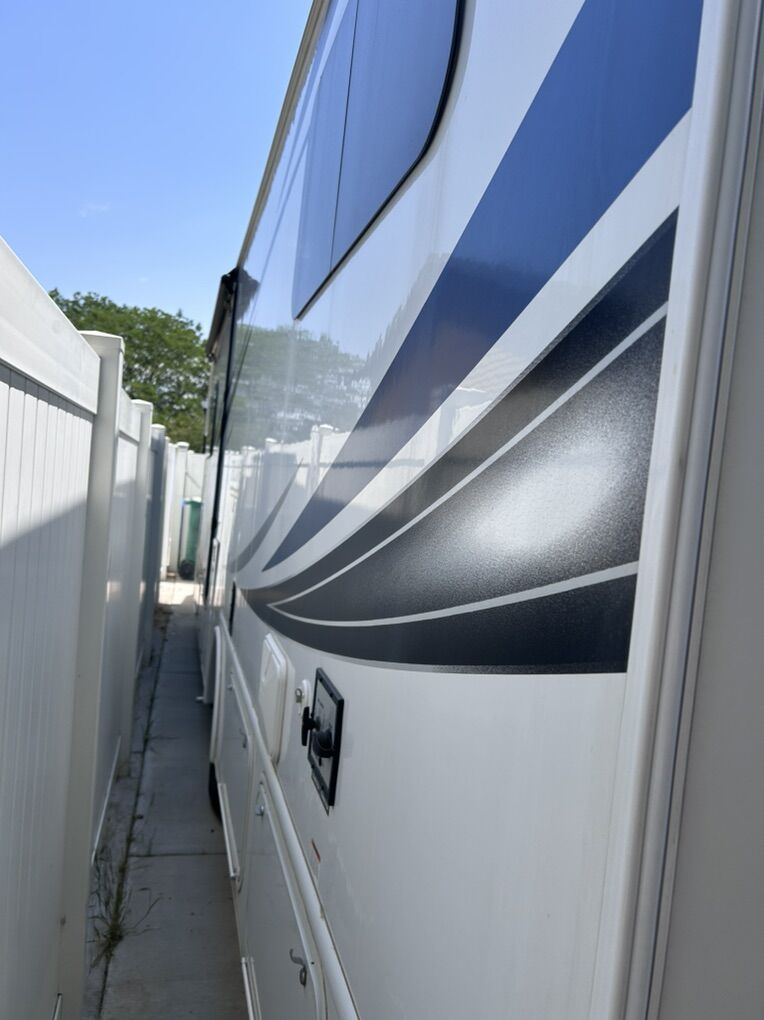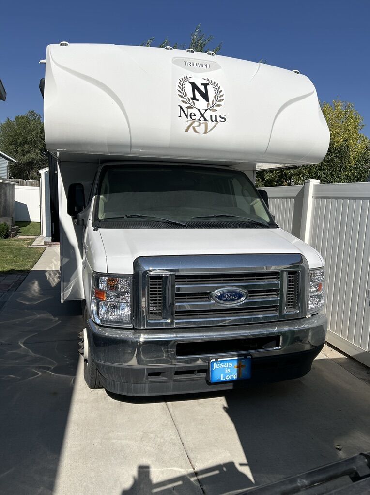 RV has 2 pullouts with awnings, automatic doorstep for entering, 2 solar panels on top roof, air vents, large refrigerator, large microwave and stove, 3 TVs: 1-dining/livingroom, 1-bedroom, and 1-outside for entertainment. Motorhome has plenty of storage space inside and outside. Equipped with a Ford 450E chassis for comfortable driving. This RV motorhome with ONLY 5974 miles is a must see at: