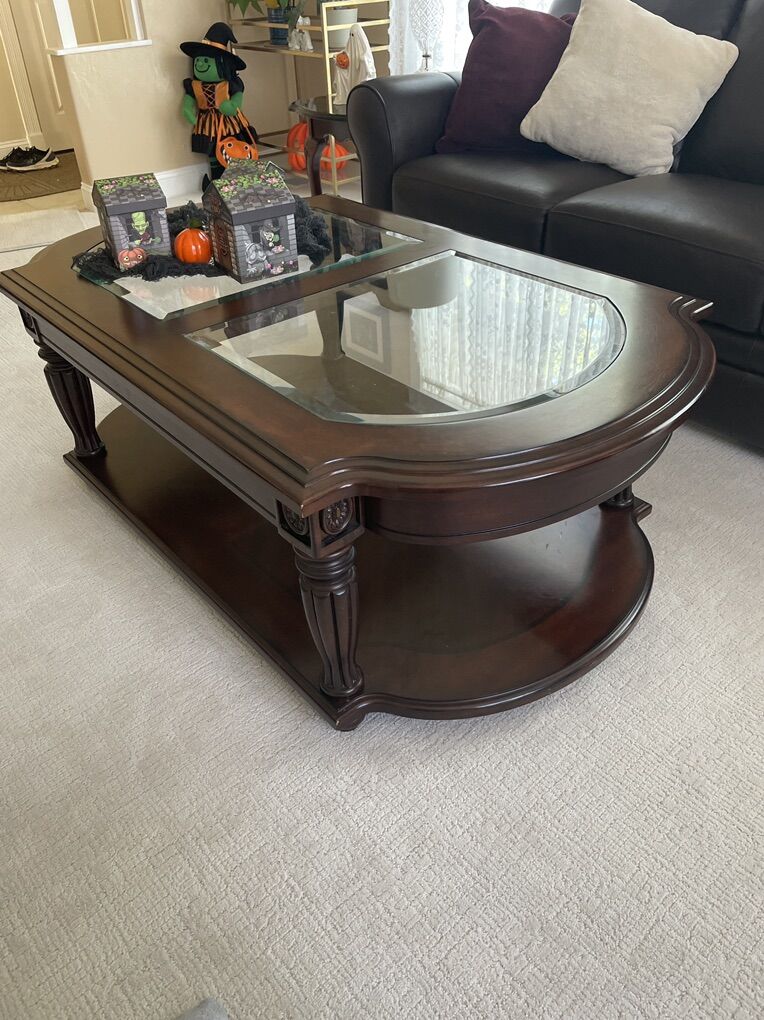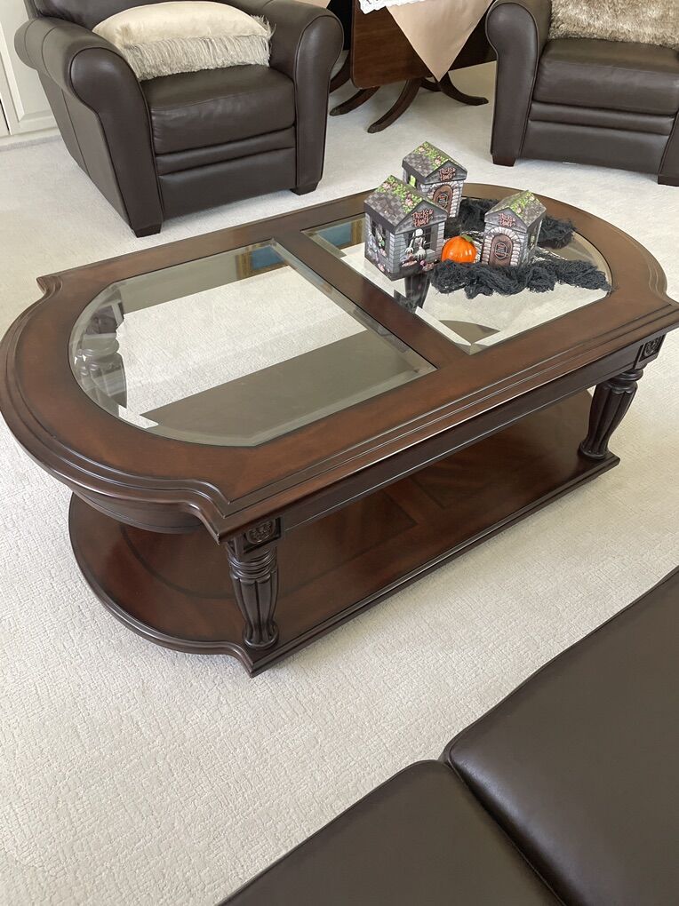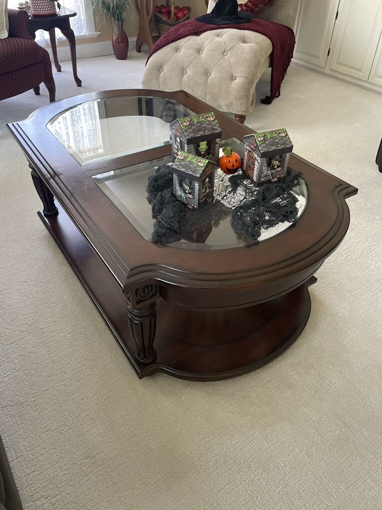 Beautiful table with glass fillets and sculptured legs and a full bottom shelf. Beautiful dark walnut in color. 32” wide and 51” long.