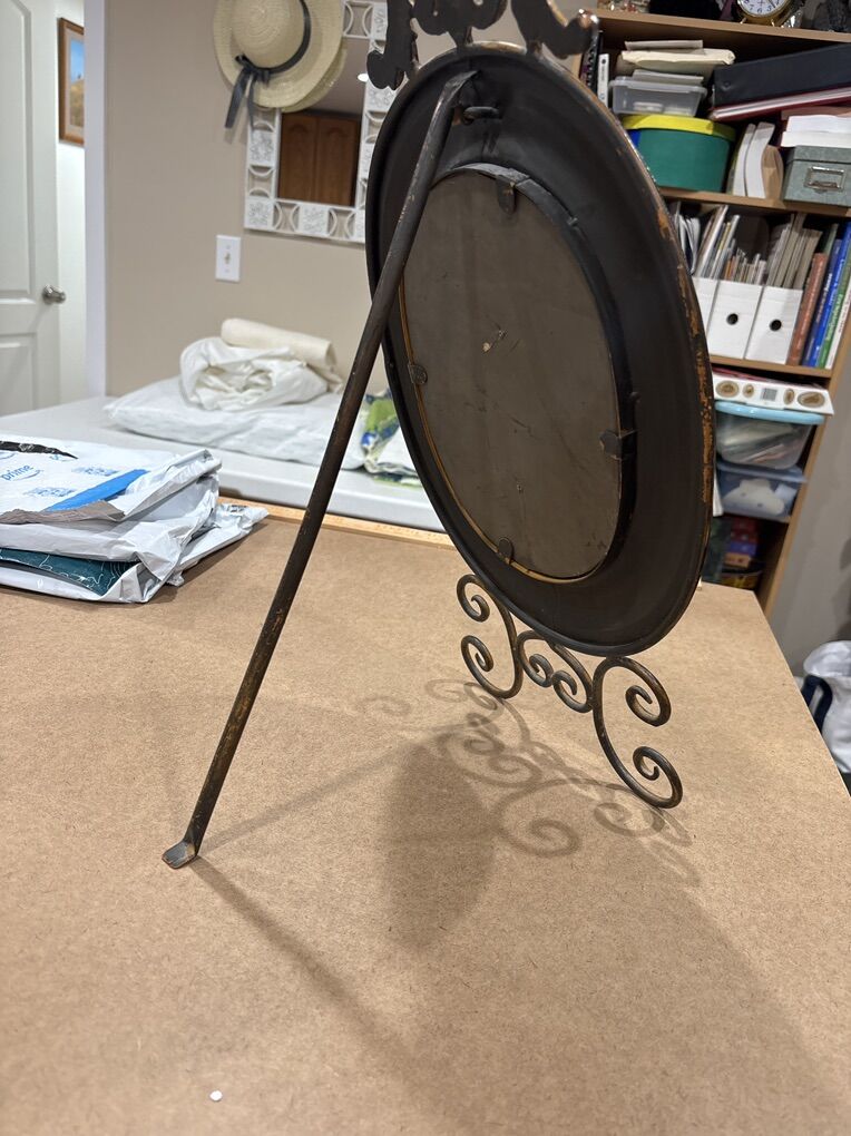 Gorgeous rustic oval metal tabletop mirror will be beautiful on an entry table or hallway, or any place you’d like a distinctive and vintage accessory. Approximately 20”H x 11”W x 11”D with stand extended.