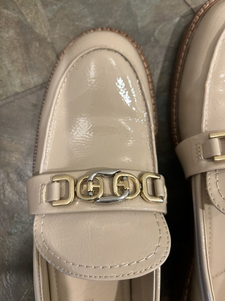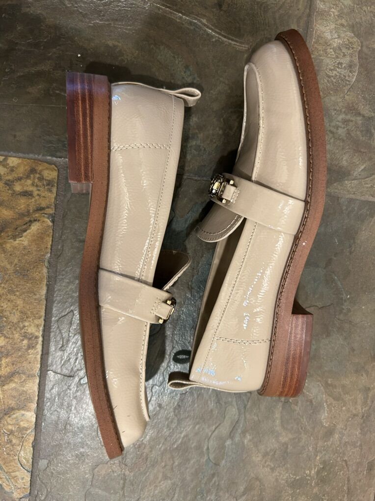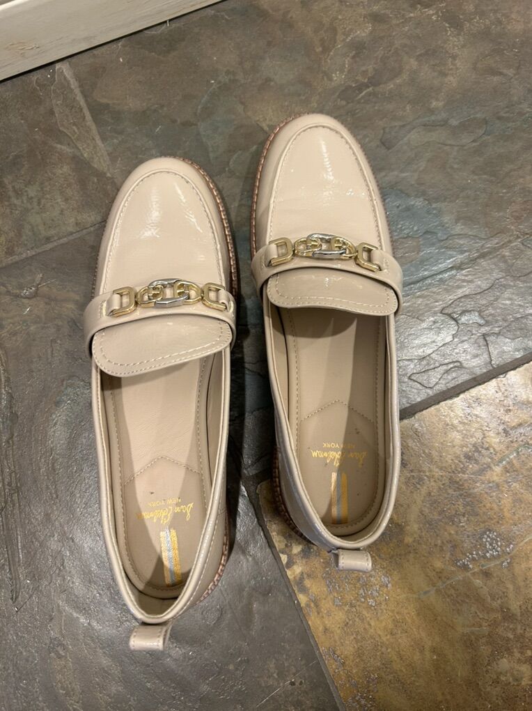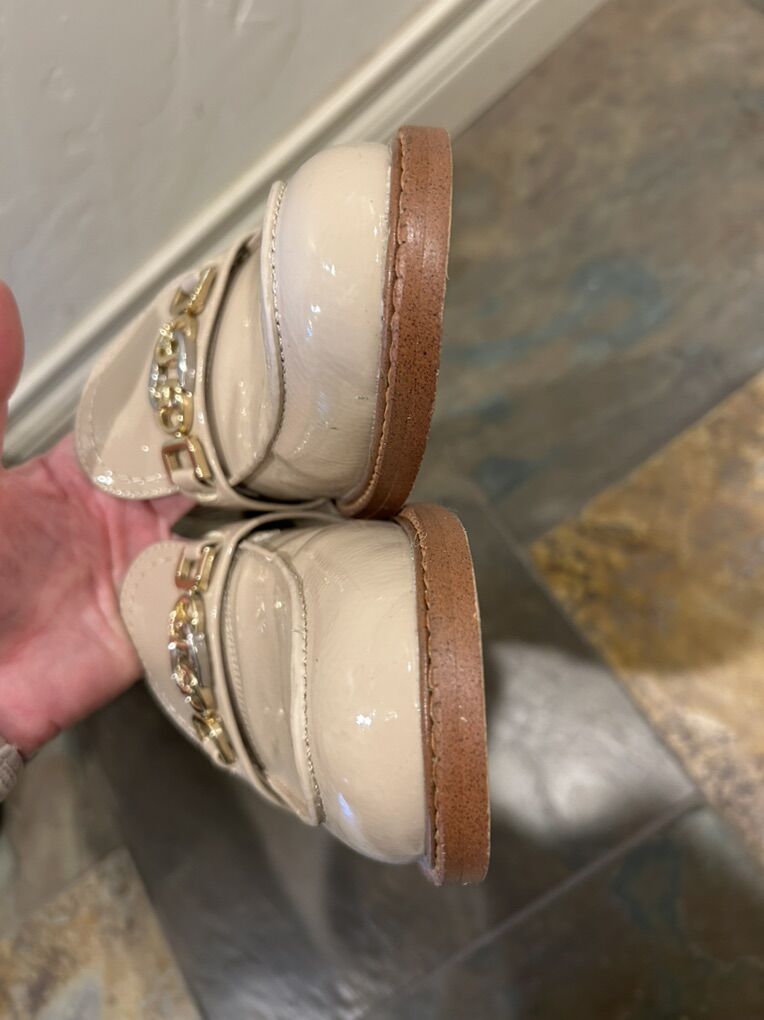 VenmoIn line new condition Sam Edelman Christy patent leather tan beige loafers in women’s size 9.5 9 1/2 with gold and silver chrome links. Brown cognac sole. Perfect heel height. Classic shoe that can be worn year round. Comfortable. Clean smoke free. Cash or Venmo. Pick up in Alpine.