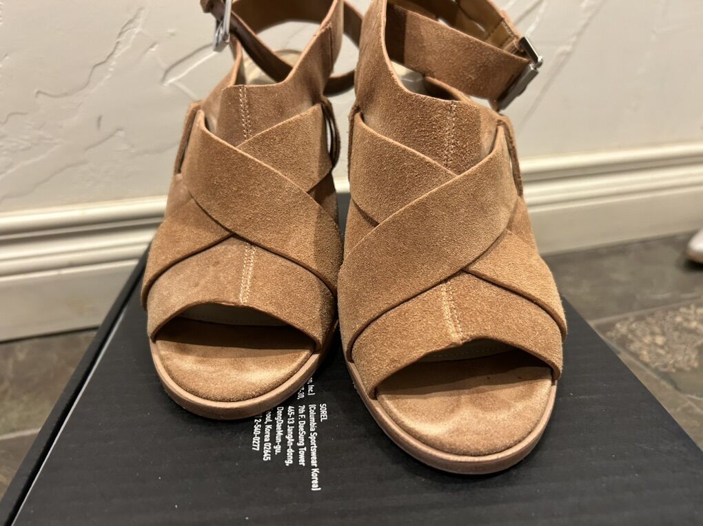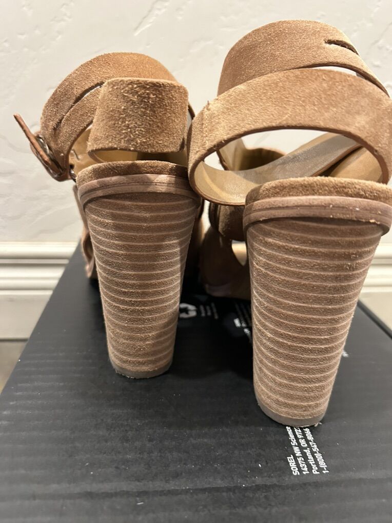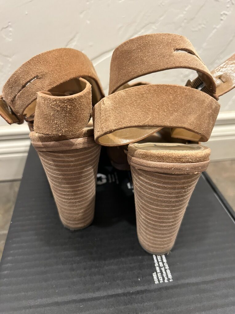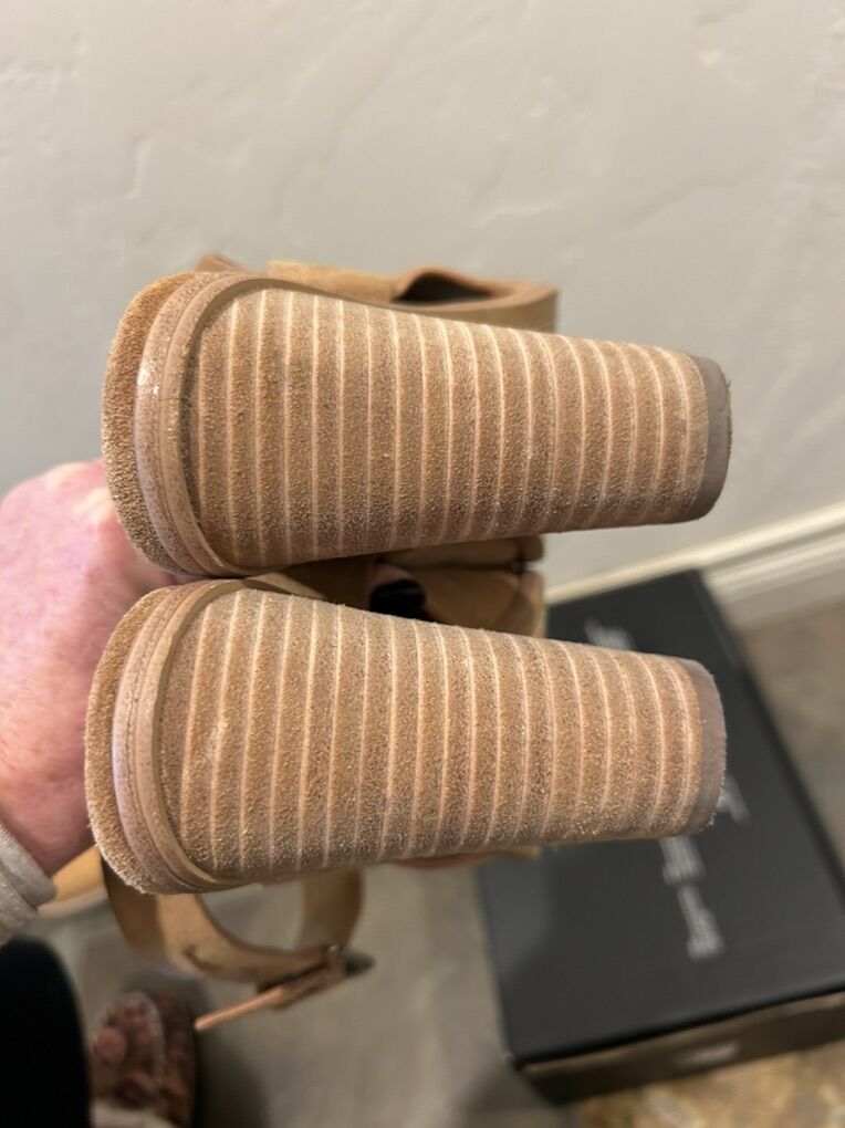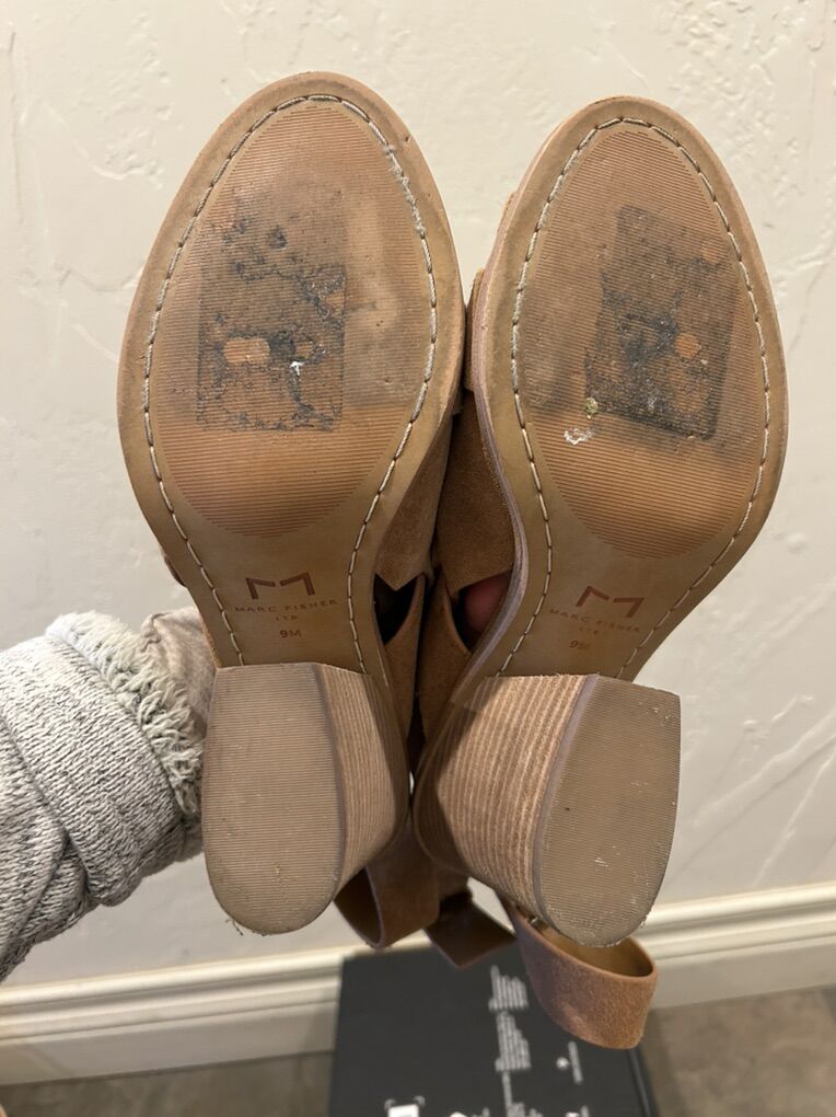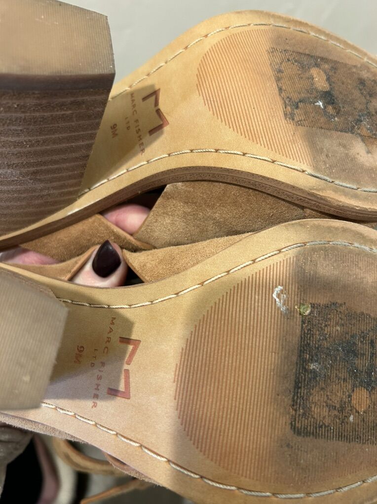 VenmoIn like new condition women’s size 9 Marc Fisher Valen light caramel color, brown suede, stray, heeled, sandal shoes. These are extremely comfortable and versatile. Clean smoke free. Easy to wear easy to walk in. Cash or Venmo. Pick up in Alpine.