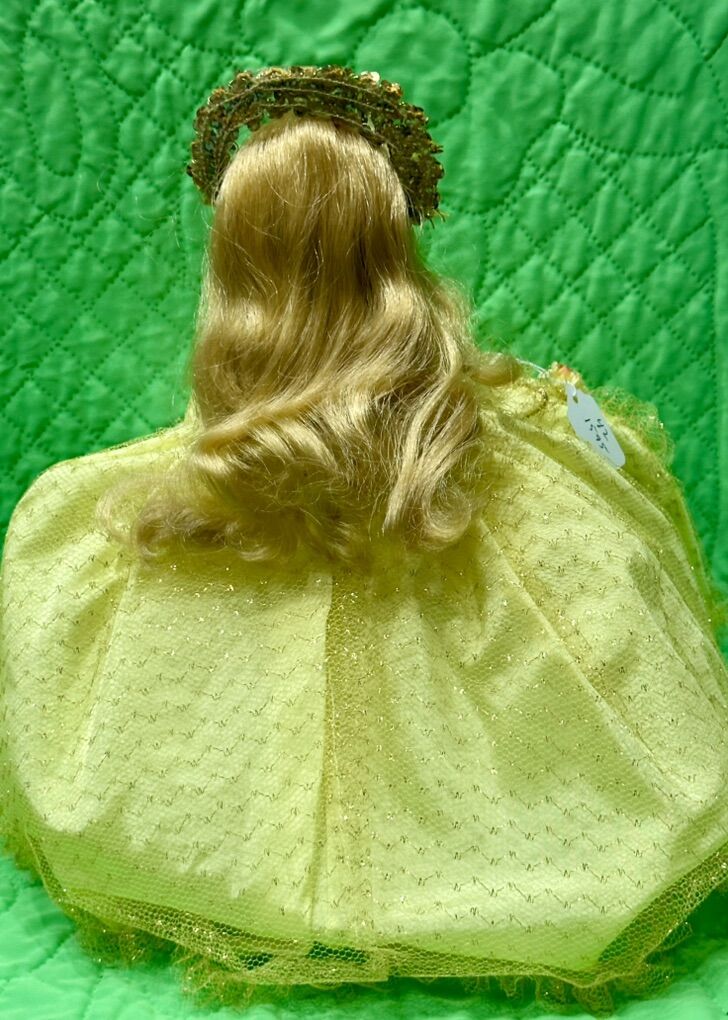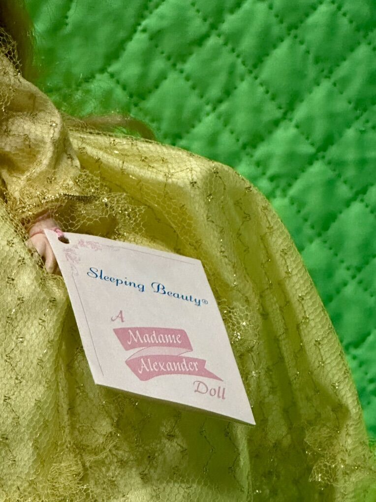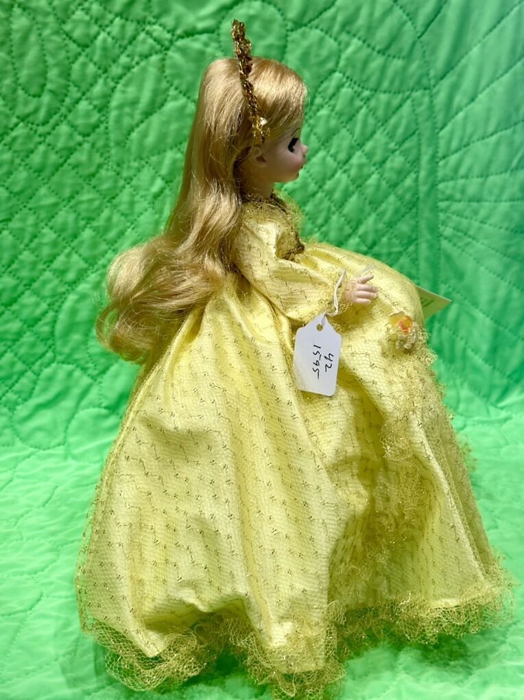 14 inches high. The Vintage Madame Alexander Doll Sleeping Beauty from 1965 is a 14-inch doll with blonde wavy hair, blue eyes that open and close, and a light complexion. This original doll from the Sleeping Beauty franchise is part of the Storybook series by Madame Alexander and is made of hard plastic. With its vintage charm and classic character design, this collectible doll is perfect for all occasions and would make a beautiful addition to any doll collection. Comes with Box like new