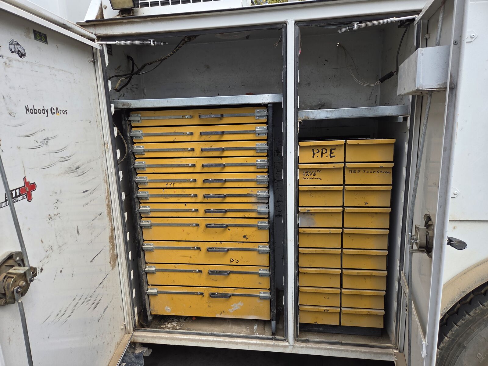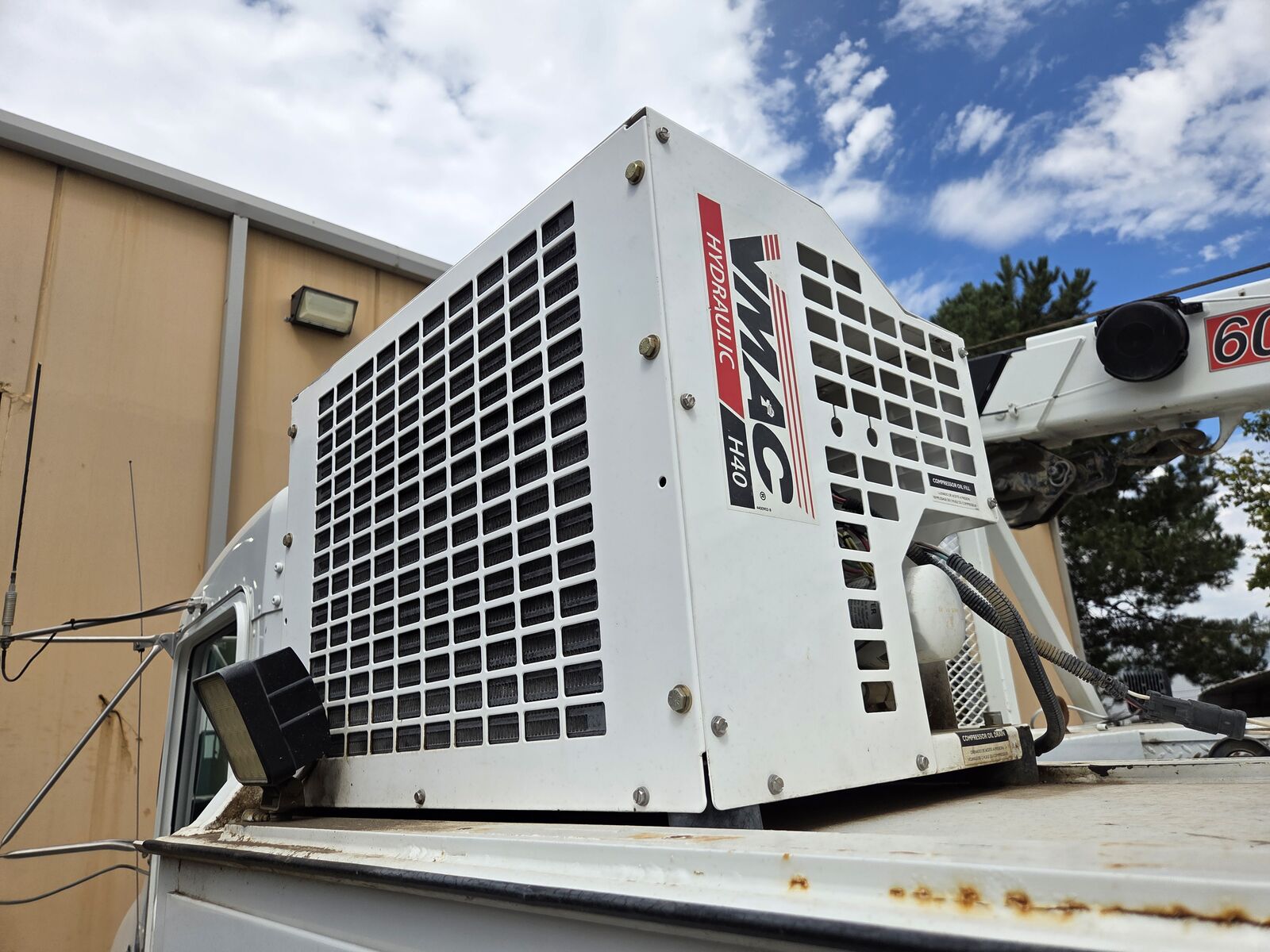 IMT DOM2S2 Bed, IMT 6025 Crane (10,500 lbs Capacity)(25' Lift Ht), Wireless Remote, (2) Hydraulic Outriggers, VMAC H40 Hydraulic Driven Air Compressor (Newer Unit than Bed), (3) Drawer Sets, Miller Bobcat 250 Welder (63 Hours),