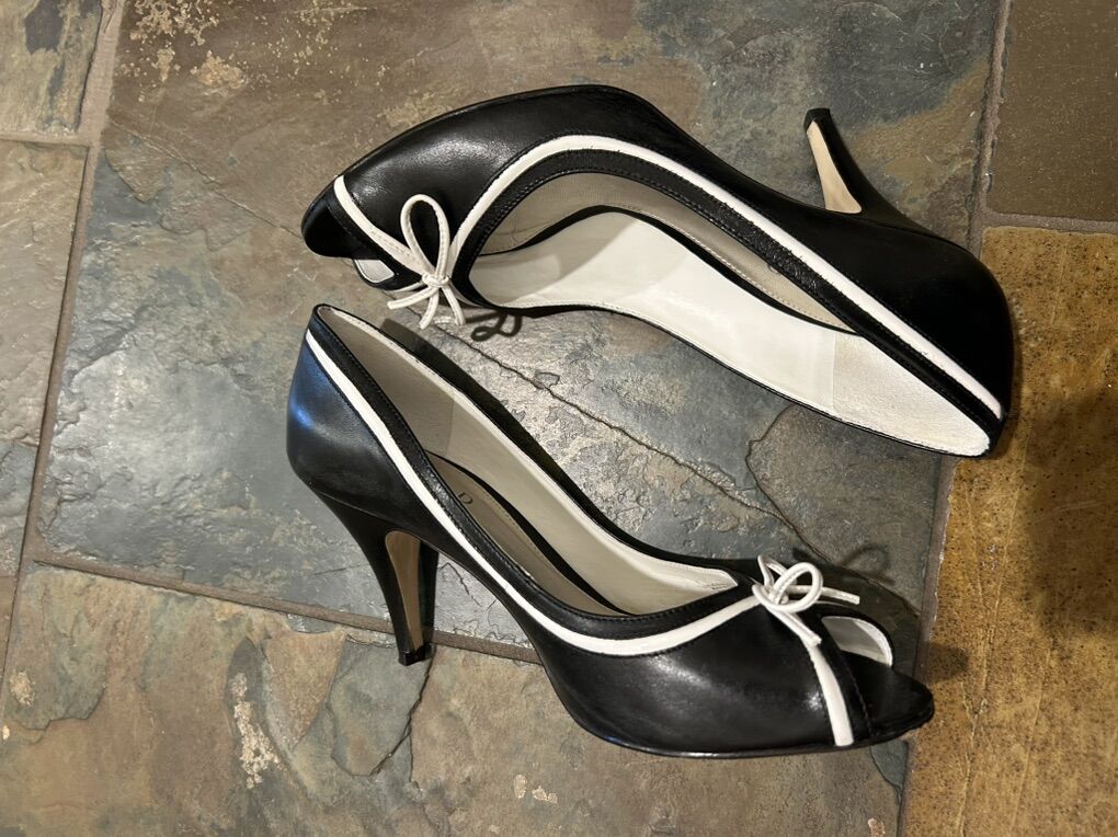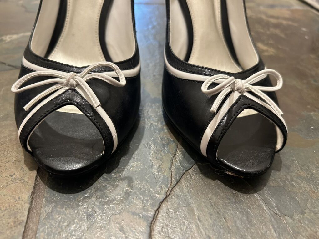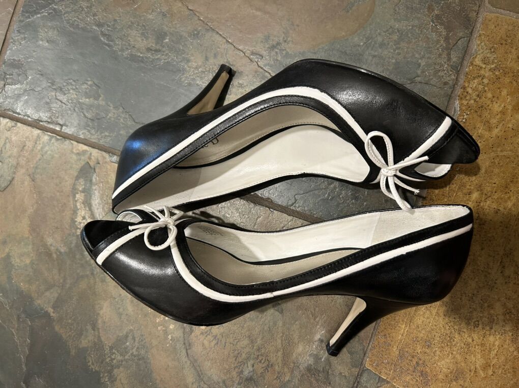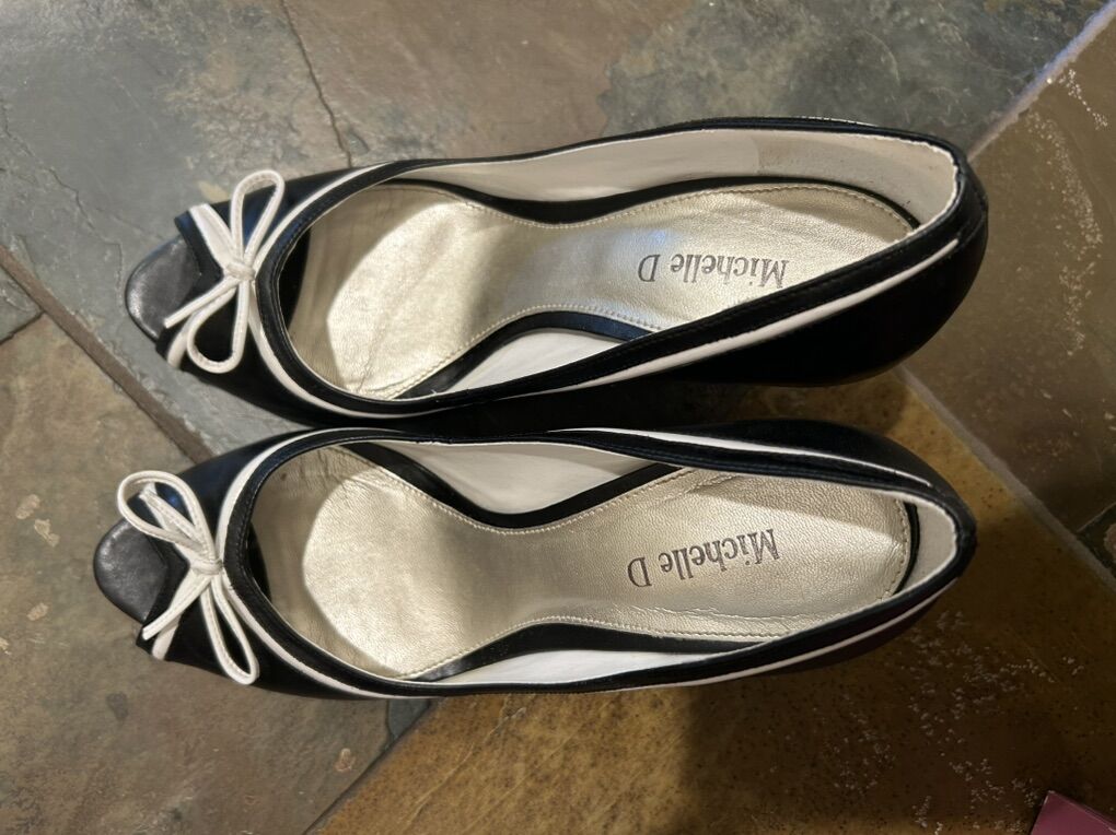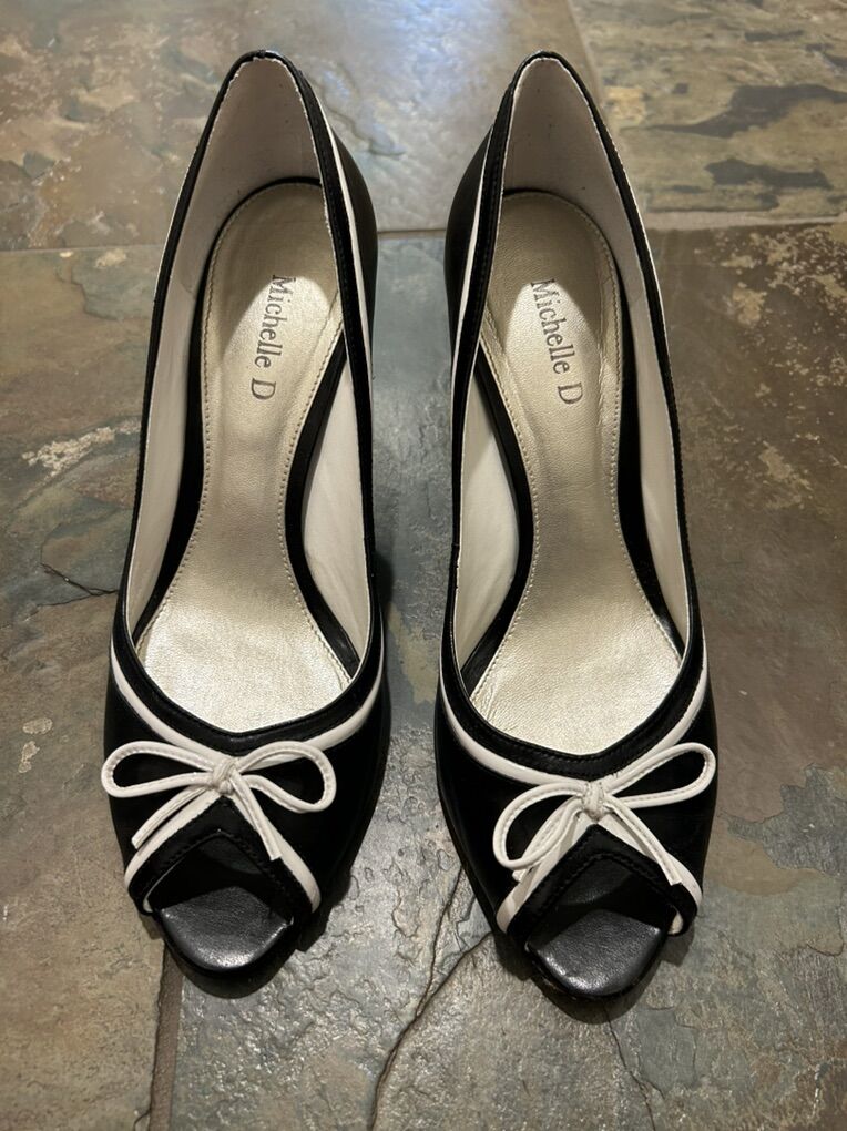 VenmoLike new still have the box Michelle D black with white trimmed bow leather peep toe dress shoes pumps in women’s size 9.5 comfortable, elegant, and timeless. Clean smoke free. Cash or Venmo. Pick up from Alpine.