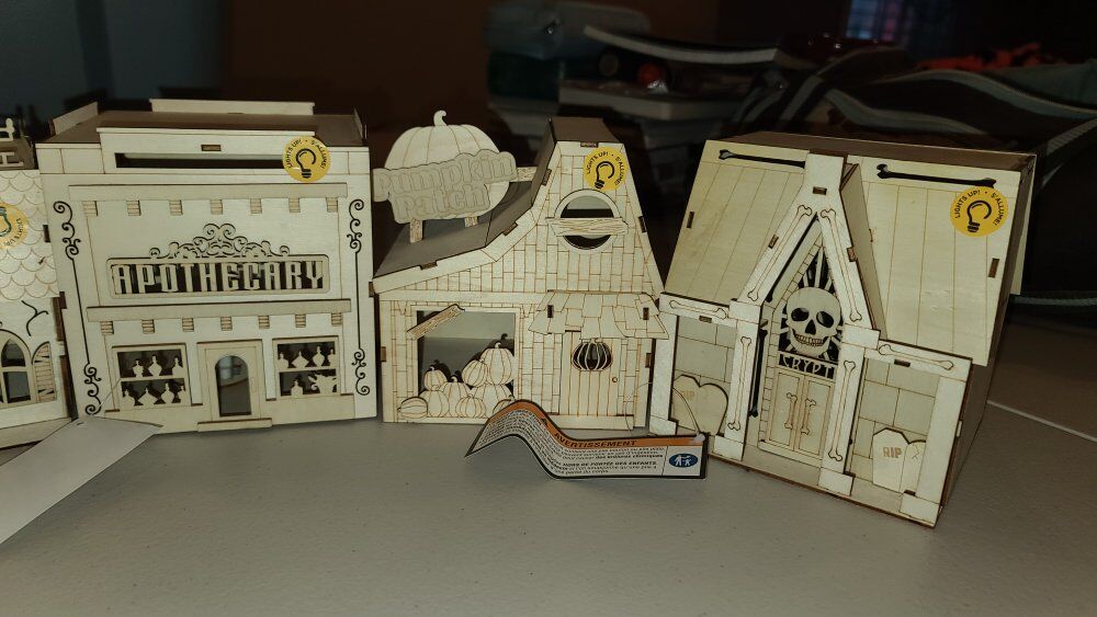 wooden haunted miniature houses, two have been painted, but not sealed - can be painted over. the remaining 4 are all brand new with tags. all 6 houses have lights!