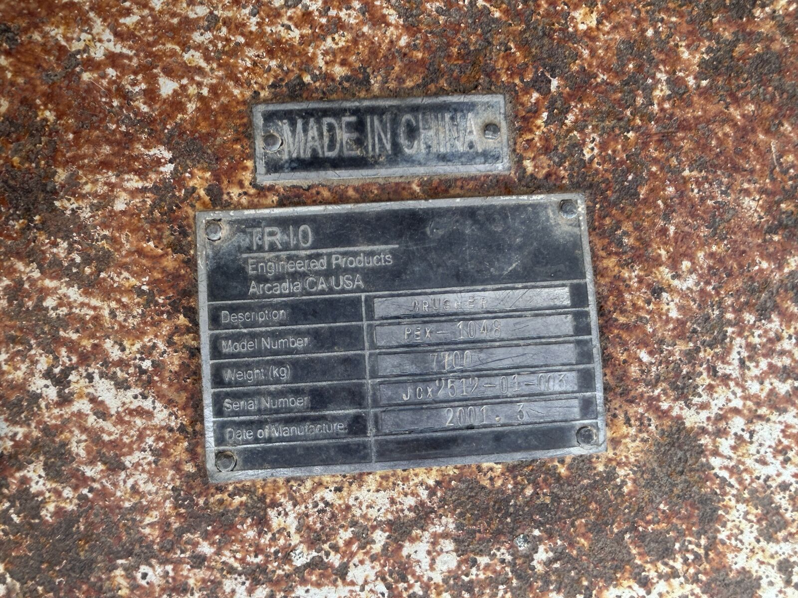 2001 Trio PEX-1048 Jaw Crusher, 29 to 79 Ton Capacity, Jaw Size: 10" x 48", Max feed size: 8", Min/max discharge:1' to 3.5'", 75 HP 3 Phase Worldwide Industrial Electric Motor. Asking $30,000.00