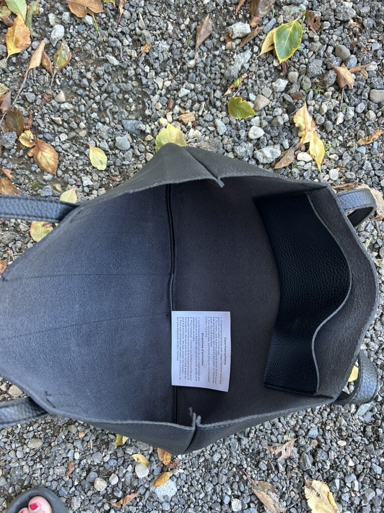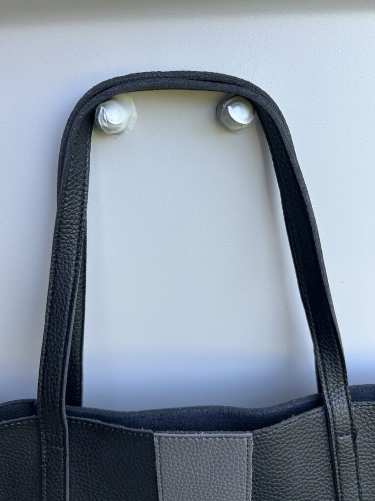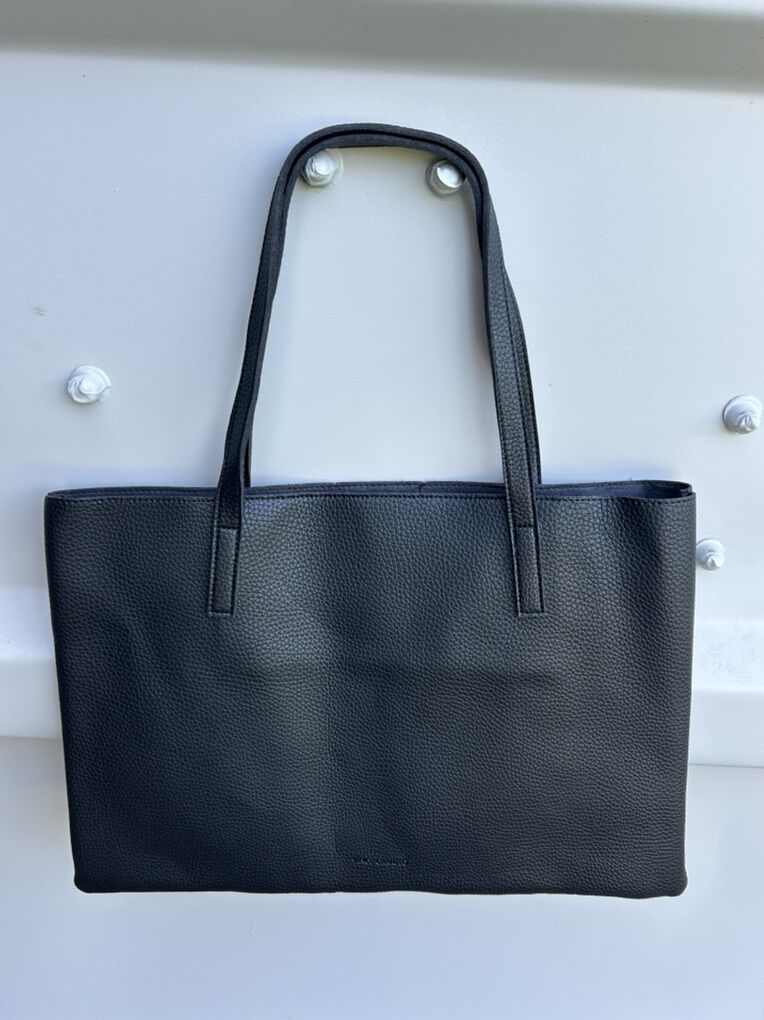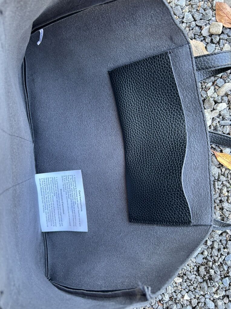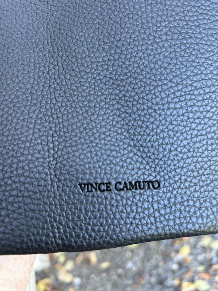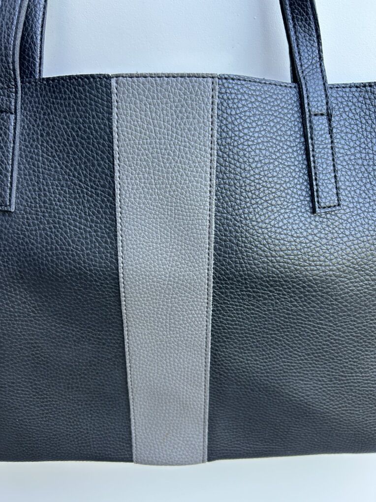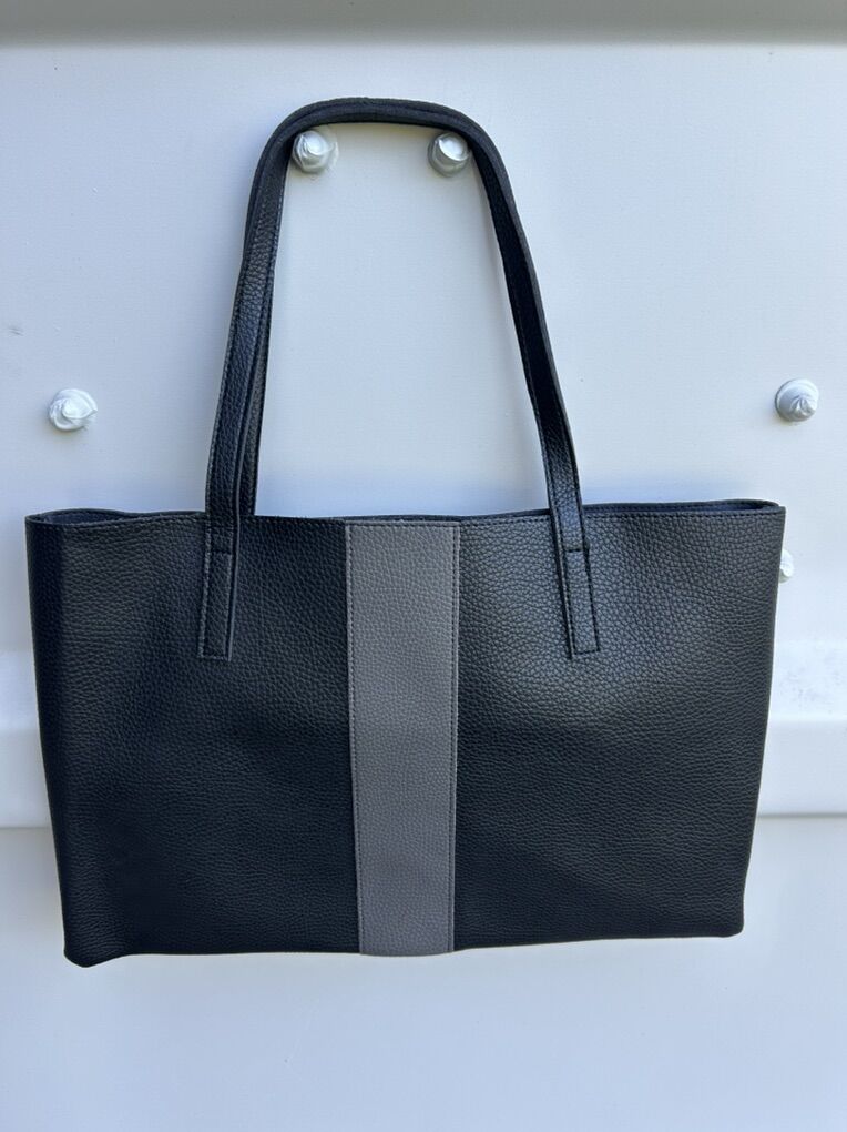 VenmoLike new Vince Camuto, black thick pebbled vegan leather with gray vertical stripe large, thin tote bag. Clean smoke free. Cash or Venmo. Pick up from Alpine.