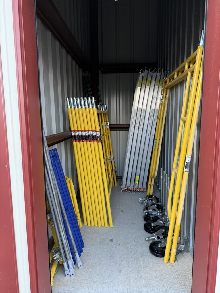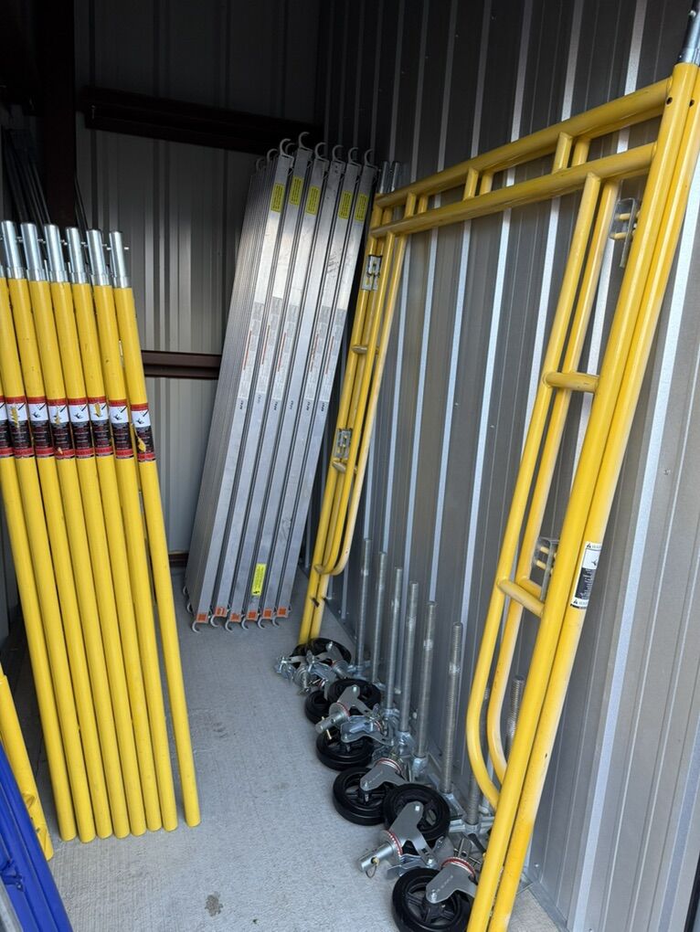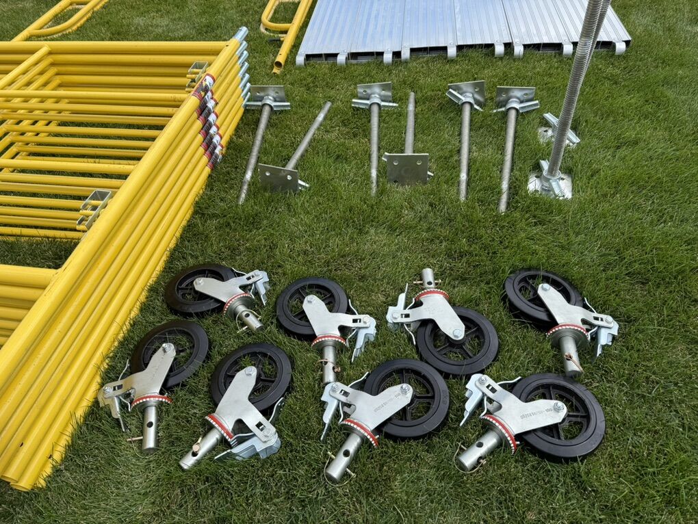 Included Equipment: Everything pictured in listing. Eight 5ft frames (four levels) Two 6.5 ft walk-through frames (one level) Six aluminum planks Ten Cross braces Eight screw jacks Eight Wheels Four guard rail posts Eight guard rail bars. I hope my gear can help you get more done and do it safer at the same time! Pickup only in Heber City UT. No Delivery Hablo español!