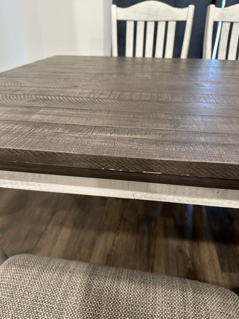 Previously protected with plastic on table + chair cushions Clean, sturdy, and well cared for Minor cosmetic nicks on table side from chairs
