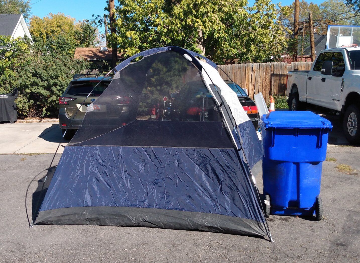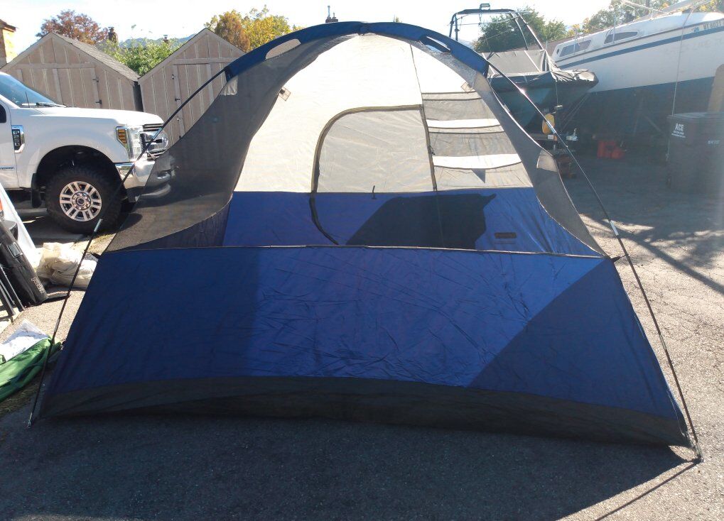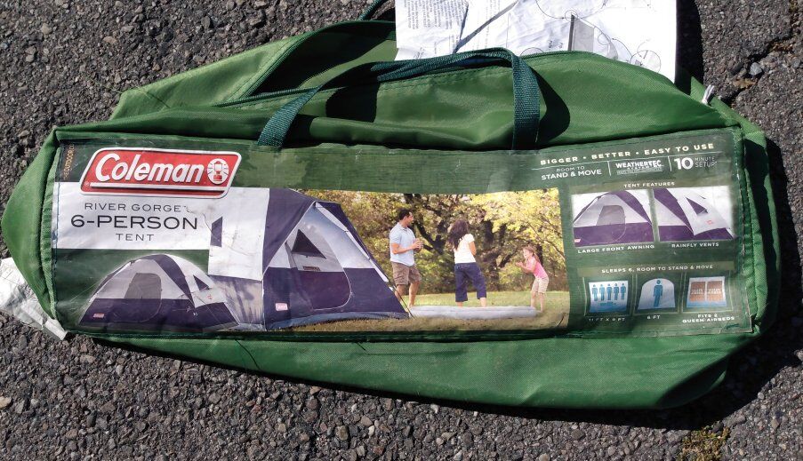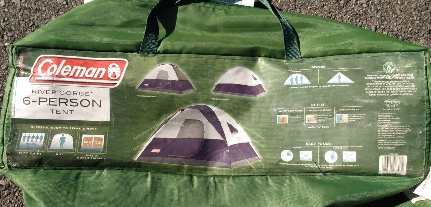 PayPalColeman River Gorge 6-Person Rectangular Free-Standing, Dome Tent with WeatherTec System bathtub tarp floor in good condition with tape seems intact. Includes tent, fly, poles, stakes, bag and instructions. Zippers work on single front door/screen as they should. Advertised as having available floor space for 2 queen mattresses with plenty of additional surrounding space. Dimensions: 99sqft, 11'Lx9'Wx6'H.
