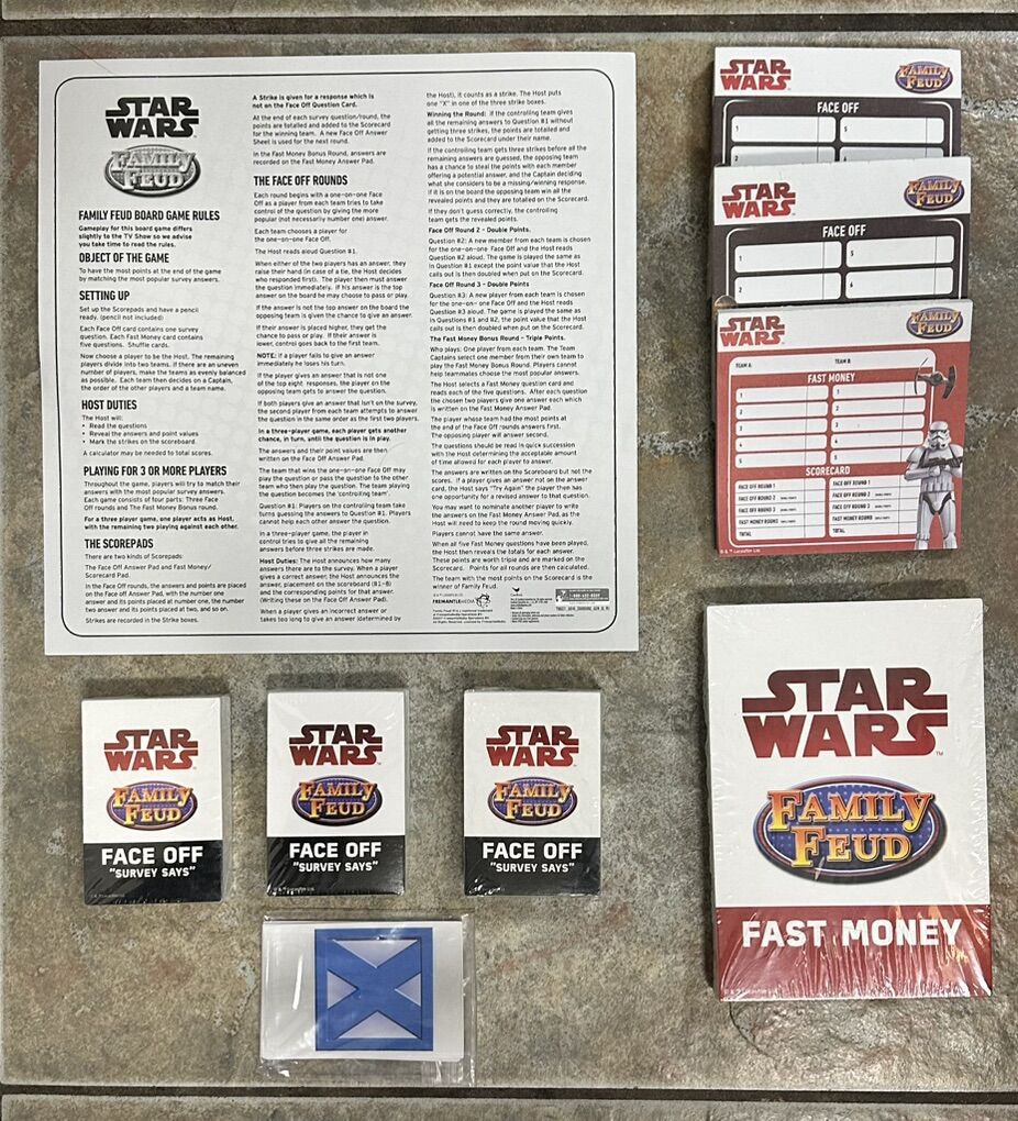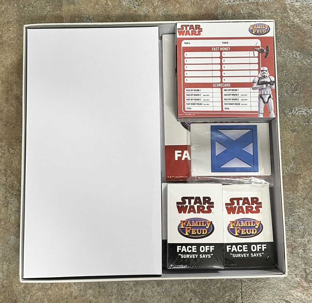 VenmoNEW open box Star Wars Edition Family Feud Board Game which contents include: 150 Face off question cards, 50 fast money cards, 6 X cards, 2 Face off pads, 1 Fast money pad, and instruction guide for $15. Pickup in Clearfield, will accept cash or Venmo.