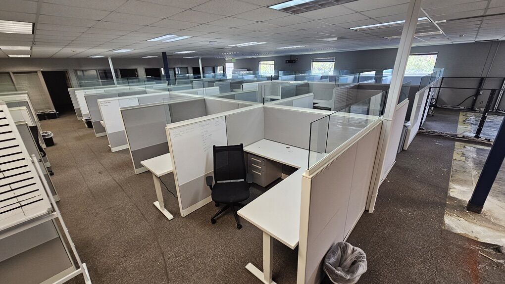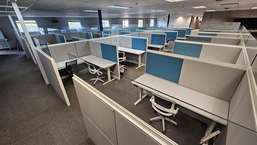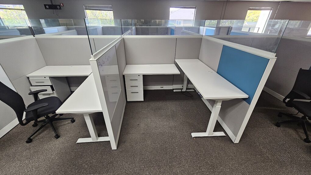 Pre owned Friant interra 6x6 cubicles 54 tall walls 68 tall including the 14 clear glass Power integration along the spine walls Light grey fabric on the bulk of the walls Dark grey fabric on lower 24 tall tile (only on 15 cubes) Aqua fabric tile highlight on 36w x 24 t in each cube Dry erase board 36w x 32t in each cube Sit to stand legs Full height, locking, Box, box file drawer Stop by our showroom to see it Foxbuilt office furniture 420 w industrial drive Building LL Pleasant Grove Ut 84062 Monday -Friday 10-5 801-899-9406