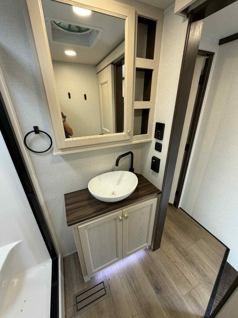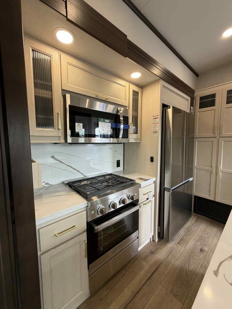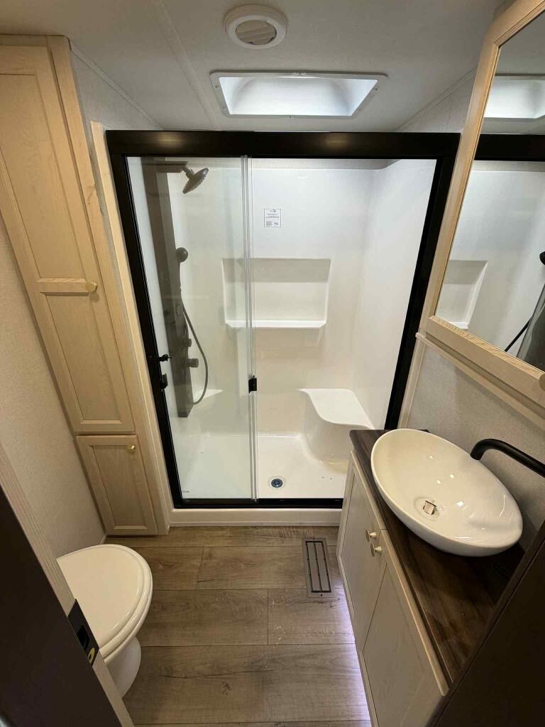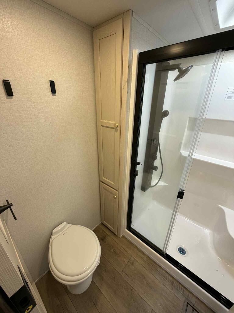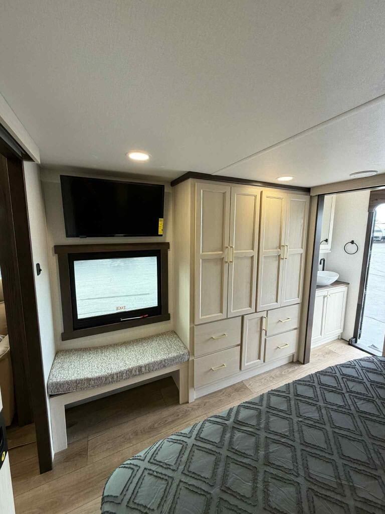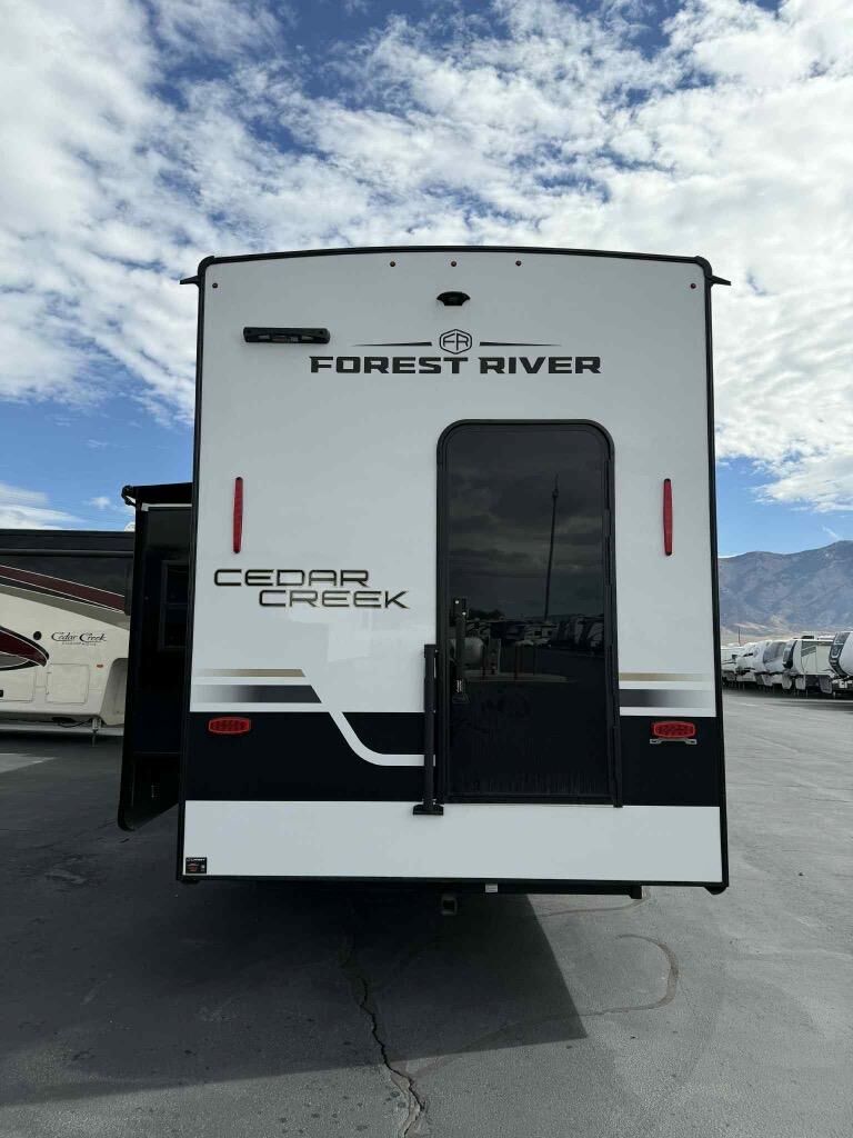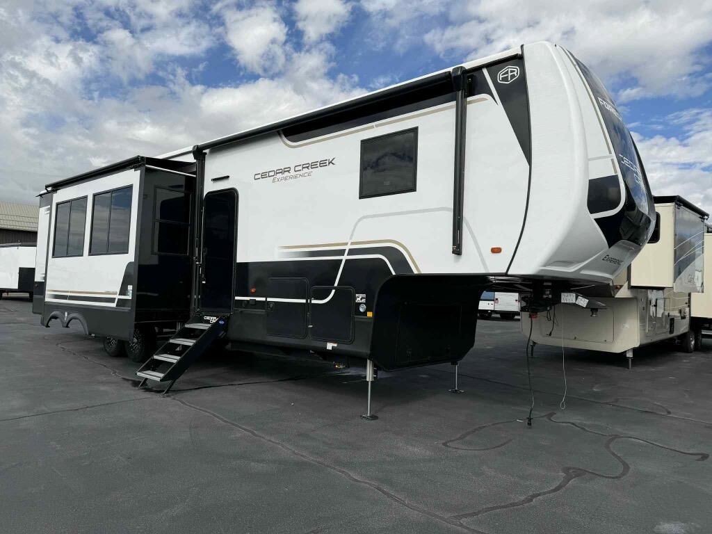 With any Cedar Creek Experience fifth wheel by Forest River, you will bet met with luxury features both inside and out! The** True Gelcoat exterior** is the best of the best in exteriors and the 3M bonded sidewalls will hold up over years of use. There is also a new 101'' wide-body frame, a Road Warrior suspension, plus a TST tire pressure monitoring system to make towing that much easier. You will find a hidden front storage compartment, along with a 4' x 6' ABS, ribbed, removable underbelly panels, and 6-point hydraulic leveling system, plus many more exterior conveniences. The interior will have you feeling like you haven't left home with vinyl floor coverings, power theater seating with USB ports, a cozy fireplace, vinyl floor covering and the list of comforts goes on! Each model is also pre-wired for satellite to the roof, and you're sure to never go bored with a Smart TV in the bedroom!