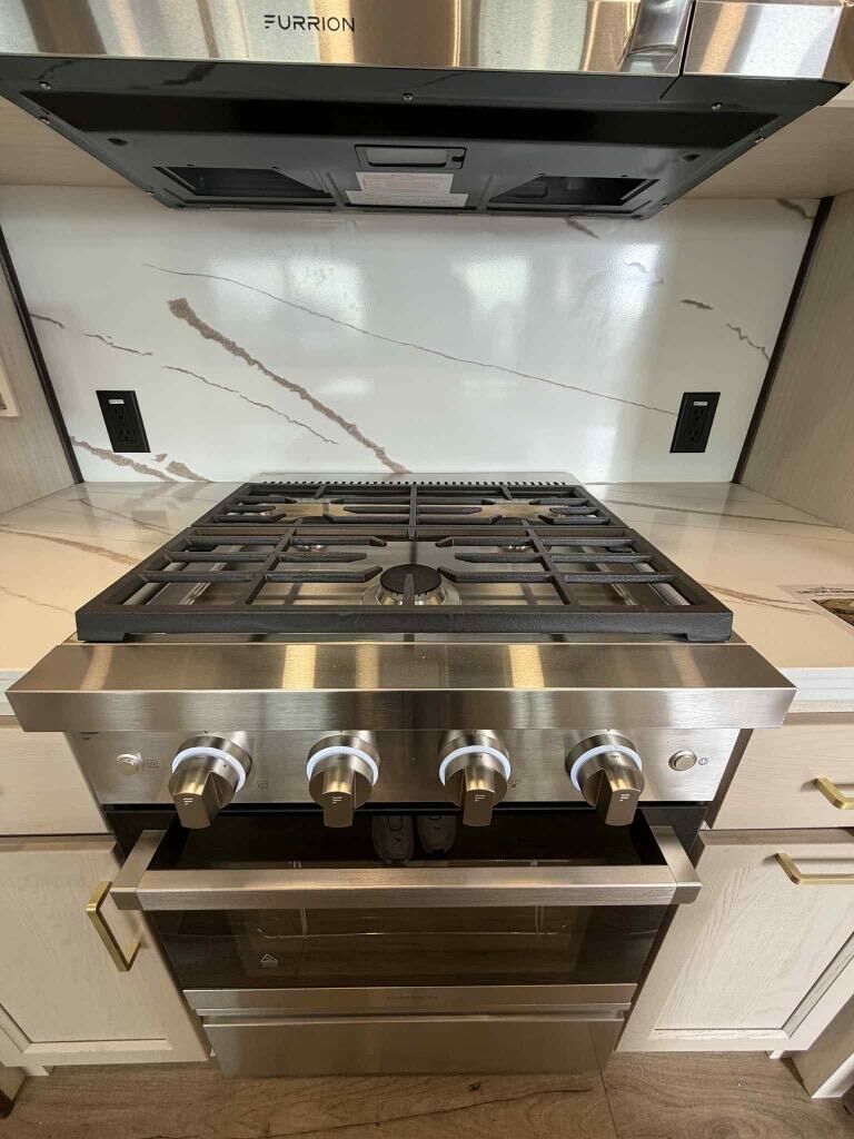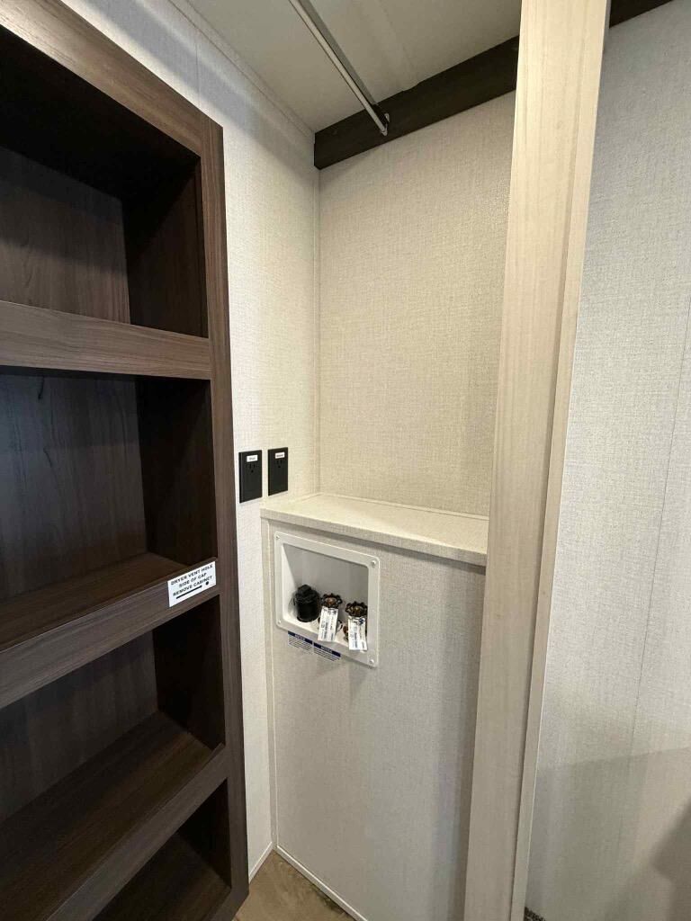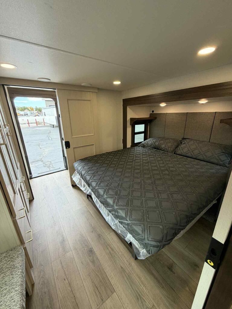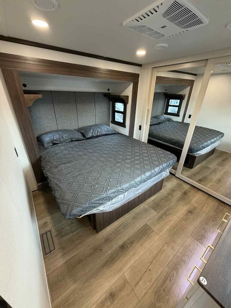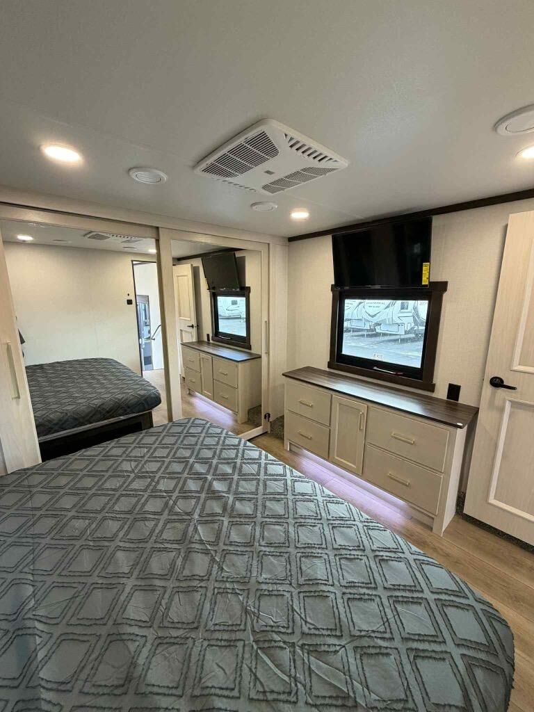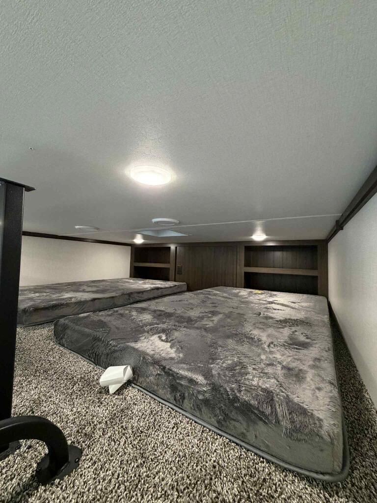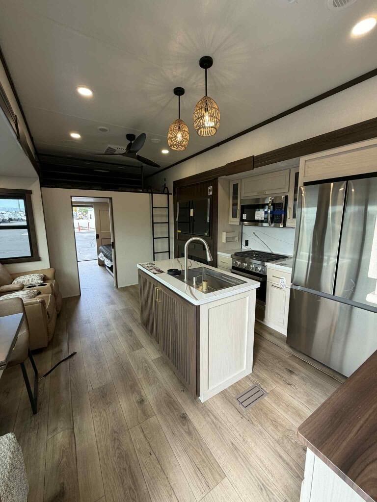 This is the perfect fifth wheel to camp with family or neighbor friends since there are two bedrooms, one of which is a master bedroom with a full rear bath. The second full bath is up front, and both bedrooms include a king bed slide out for added comfort. There is even a loft above the rear bedroom, complete with two bunk mats, two cabinets, and a TV hookup. Everyone can meet in the combined kitchen and living room to enjoy the swivel mounted TV and fireplace across from the theater seating. There is also a wall-mounted dining table with an extension and ottoman.