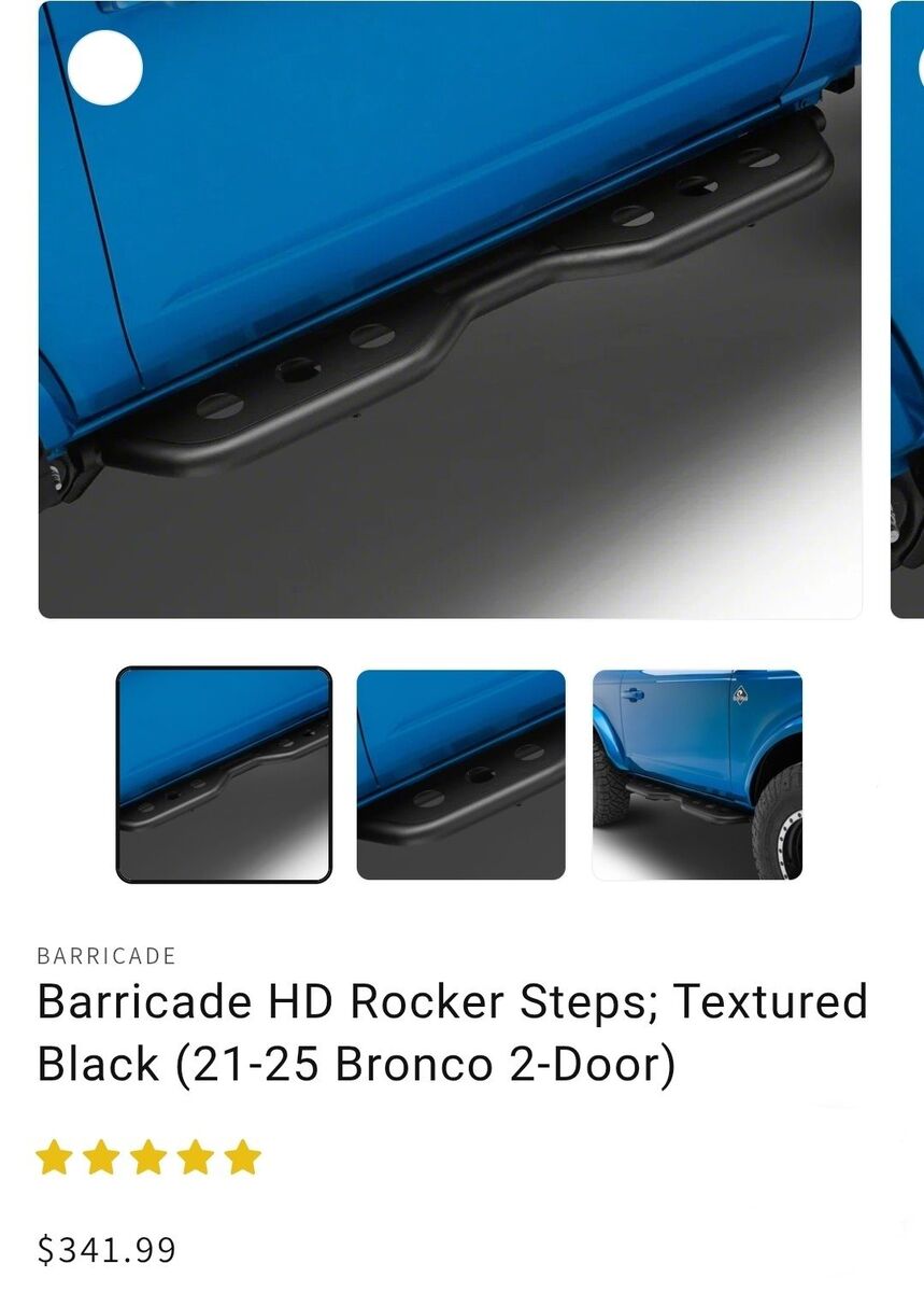 Application. These Barricade HD Rocker Steps; Textured Black are designed to fit 2021-2025 Ford Bronco 2-Door models. Sold as a pair, driver and passenger side are included.