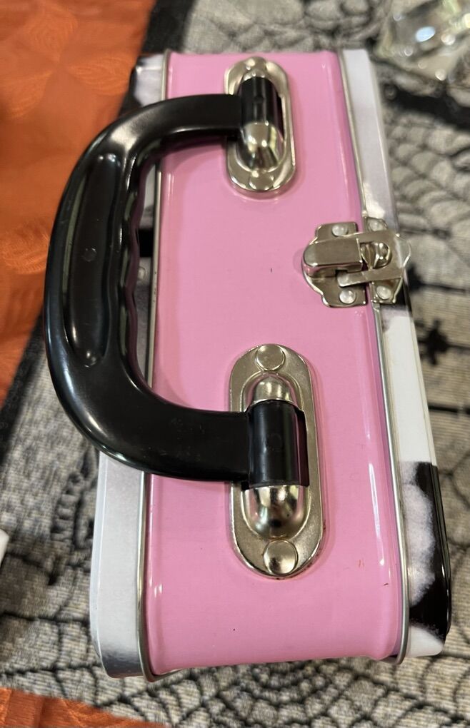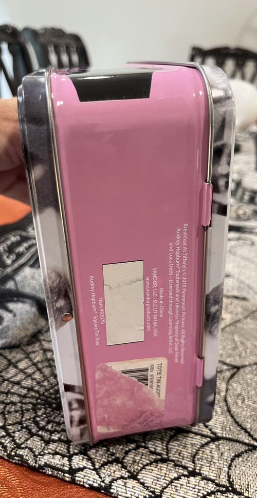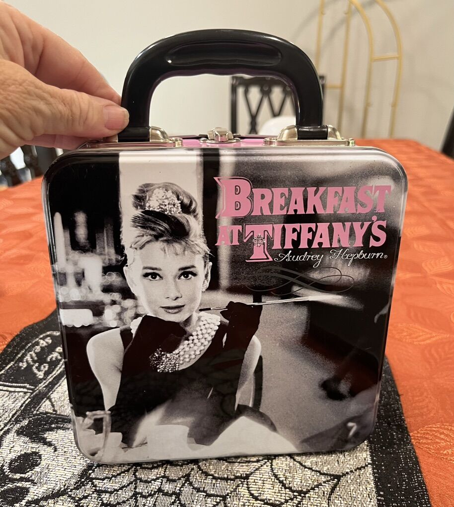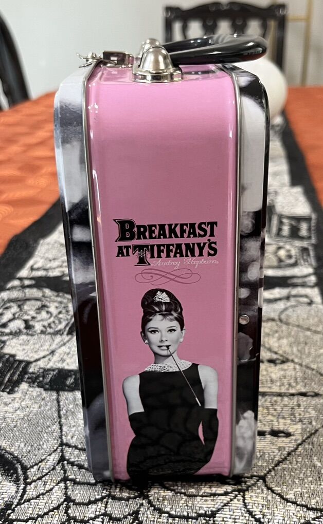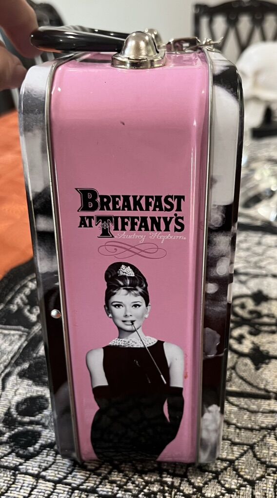VenmoVintage/collectible tin tote/lunchbox featuring Audrey Hepburn in classic breakfast at Tiffany’s. It is made of tin with molded plastic handle and a metal latch closure. In really good condition. Has couple barely noticeable scratches and the sticker in the bottom from the store is half peeled off.