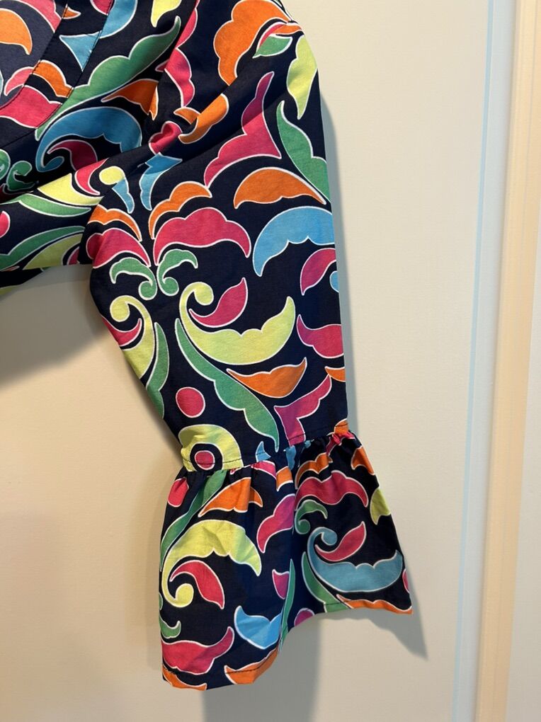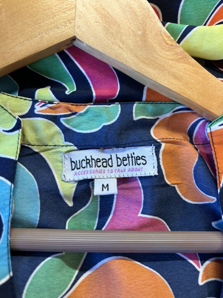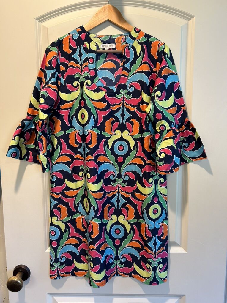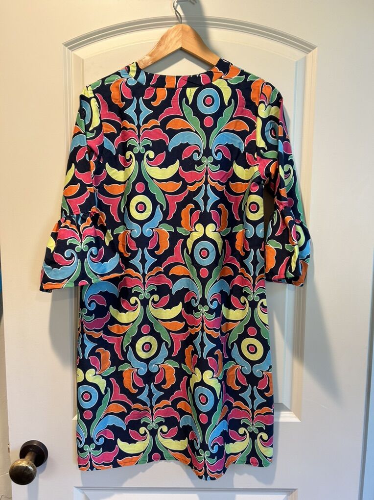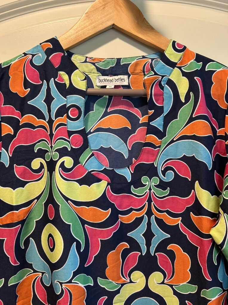 VenmoIn like new condition women’s size medium Buckhead Bettie’s shift dress with three-quarter ruffle sleeves. Beautiful navy base with vivid jewel colors like pink, yellow, turquoise, orange and green. Perfect to wear alone over a swimsuit as a cover-up and definitely a vacation must have. Clean smoke free. Cash or Venmo. Pick up from Alpine.