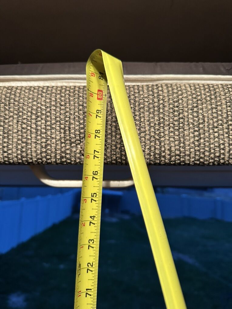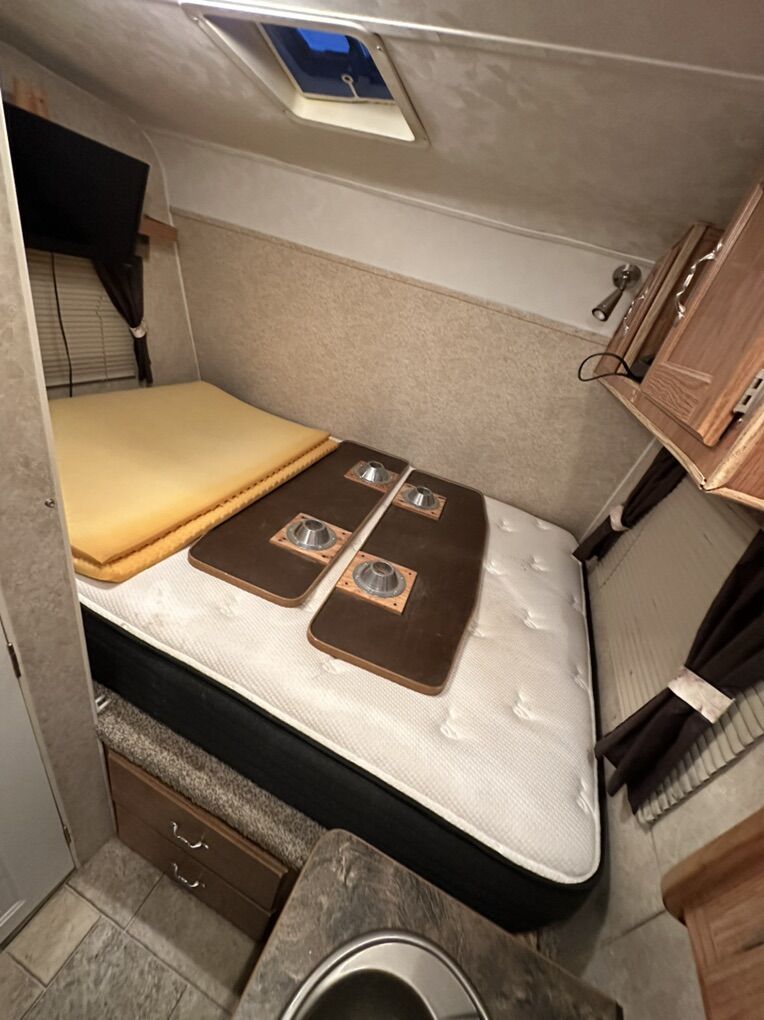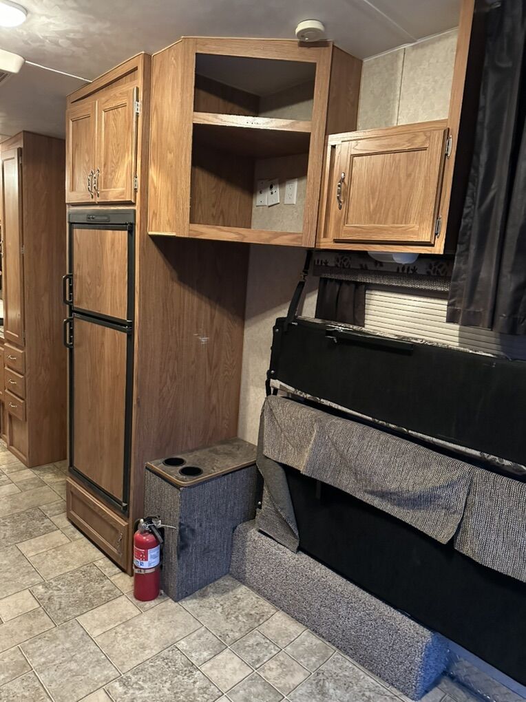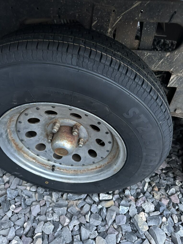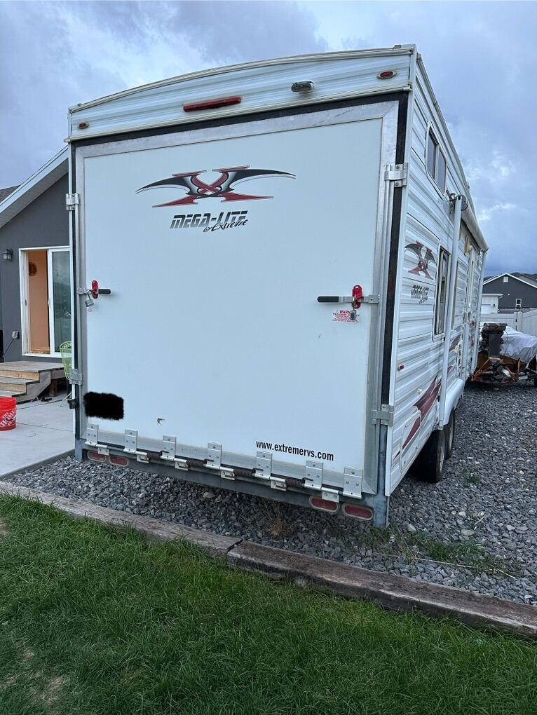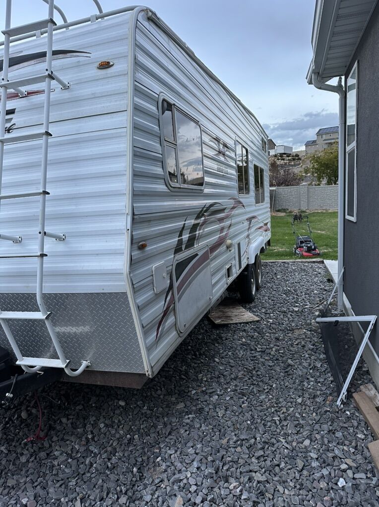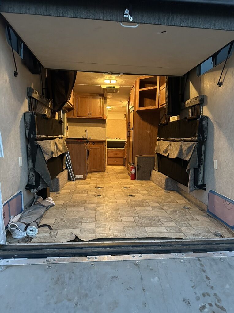 23 feet long. 2 propane tanks 2 new batteries One new tire. The other 3 are 4 years old On board generator On board 20g fuel tanks 100 gallon water tank 6 gallon water heater Will fit a 2 seater rzr trail. Garage is 111” deep, 74” wide and 75” tall