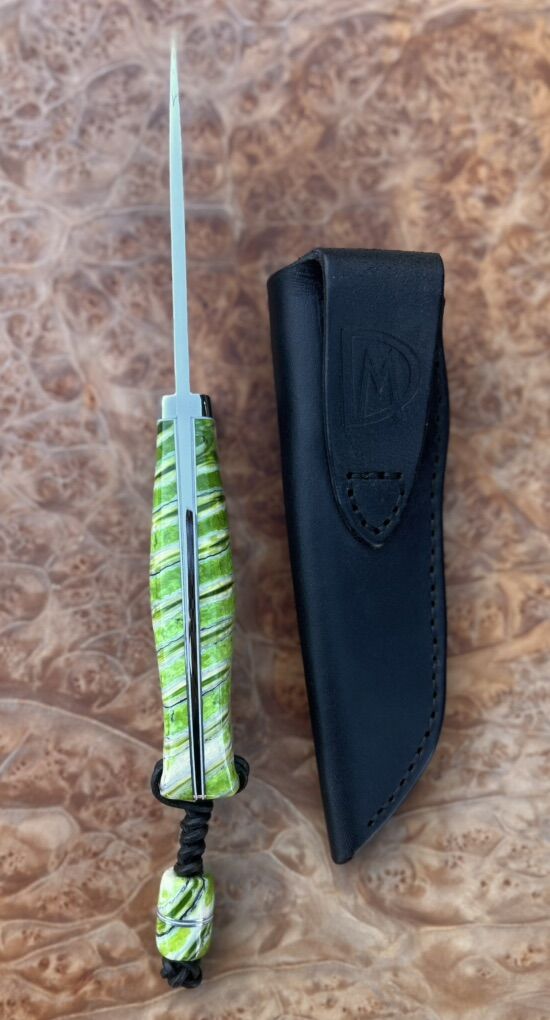 Drop point hunter in dyed and stabilized wooly mammoth molar. Blade steel is mirror finished AEB-L stainless at 61 HRC with 416 stainless guard and hardware. The guard is pinned and silver soldered into place for a secure and seamless fit up. Includes a matching removable bead lanyard and custom fitted black leather sheath. This is a quality hand crafted heirloom made to last generations. Made by Dustin Mello in Tremonton Utah