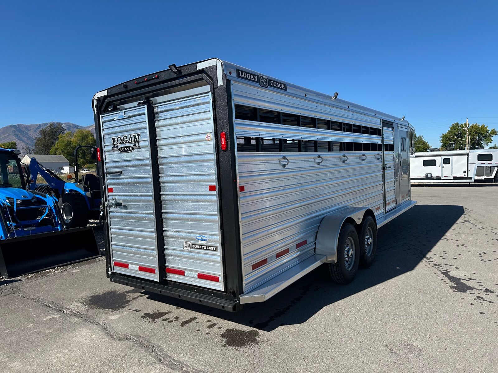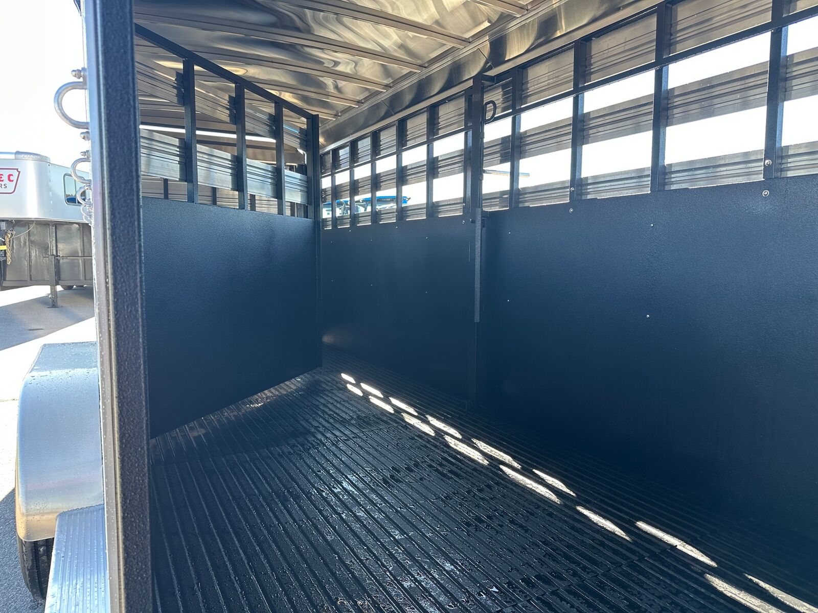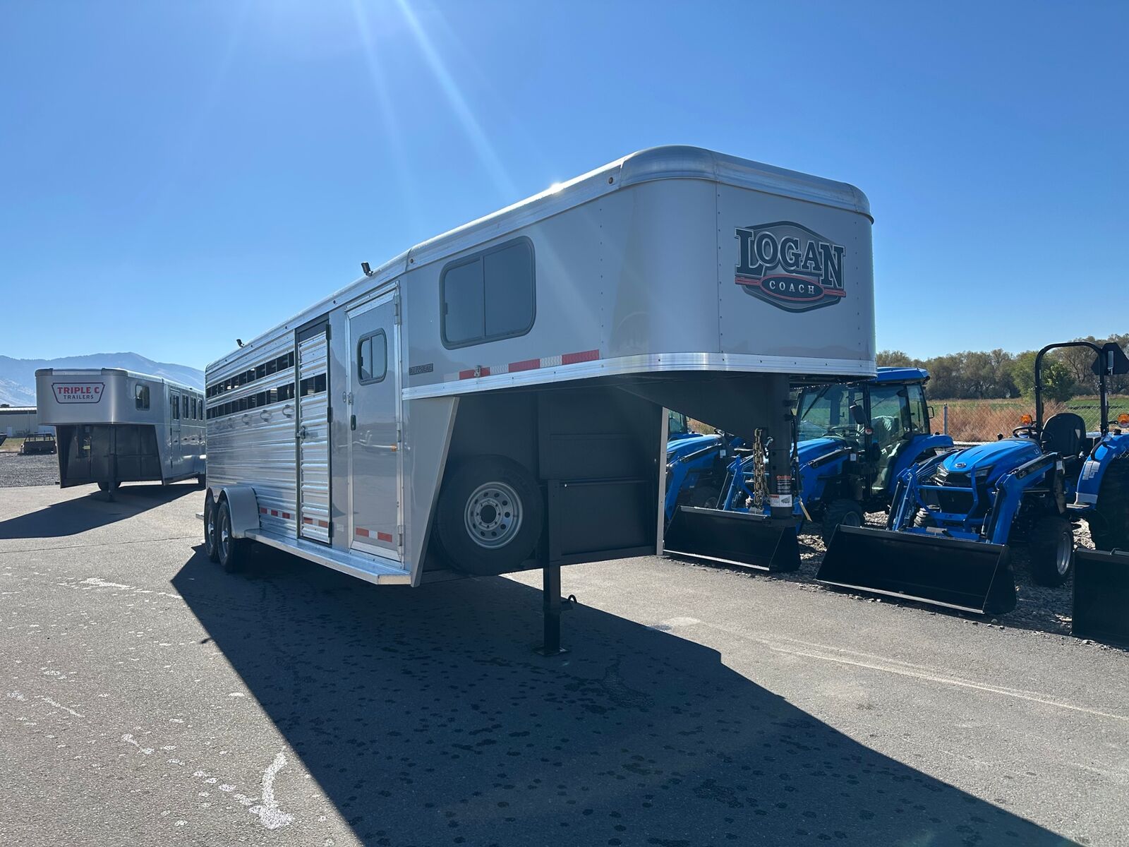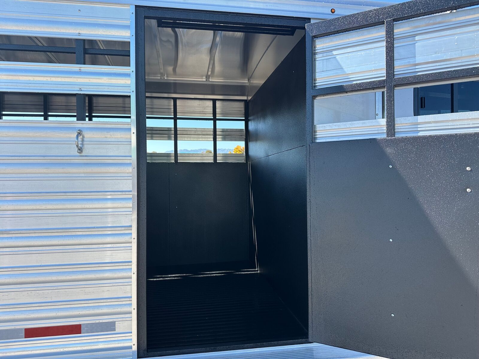 The New Bullseye Stock Combo 24' Stock Combo Front Tack Room w/ Swing Out Saddle Racks Blanket Bars, Bridle Hooks, Brush Tray Carpeted Gooseneck, Windows in Nose Stock Area Has Floor Mats Solid Center Gate, Slider on Rear Door.