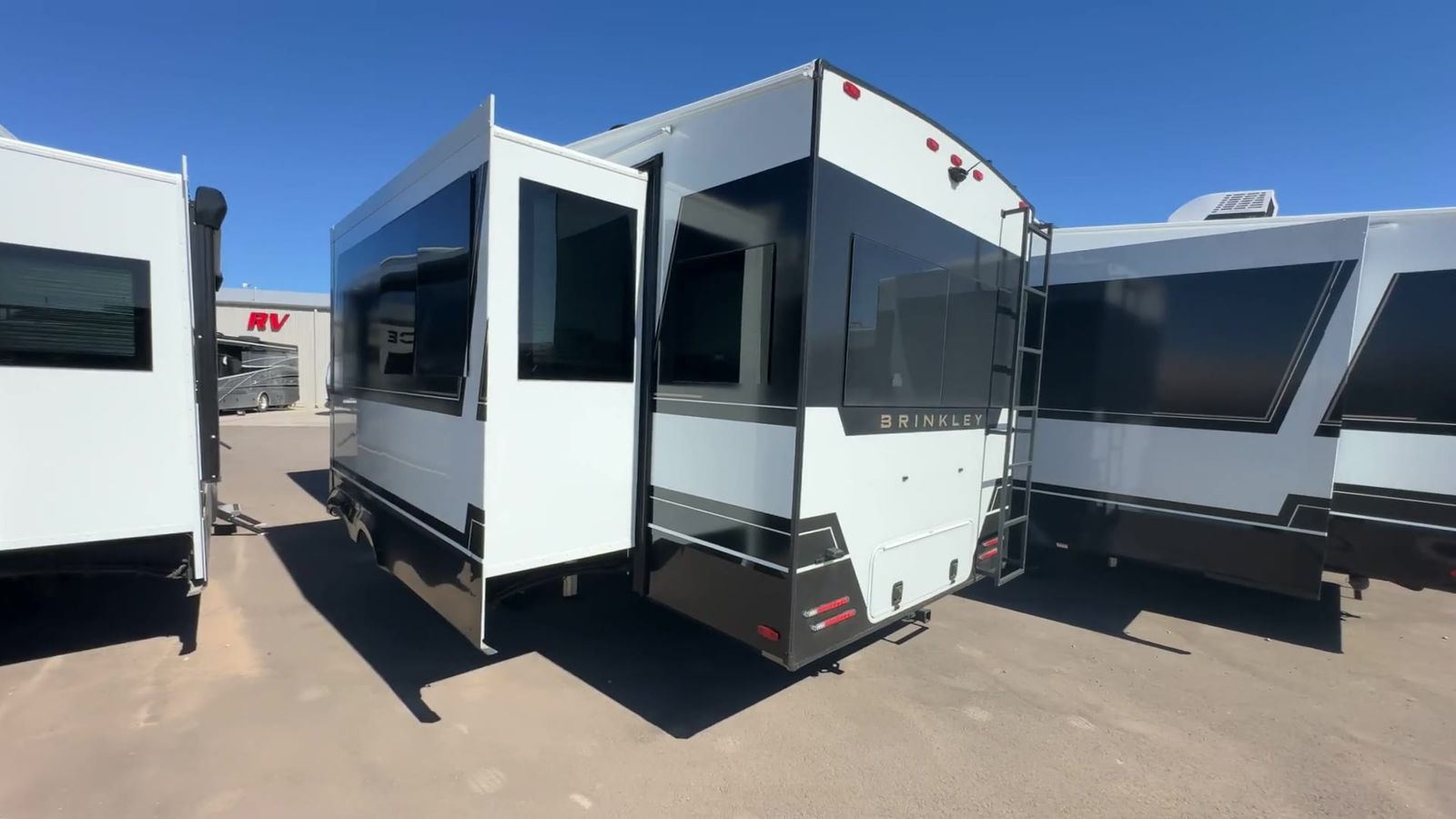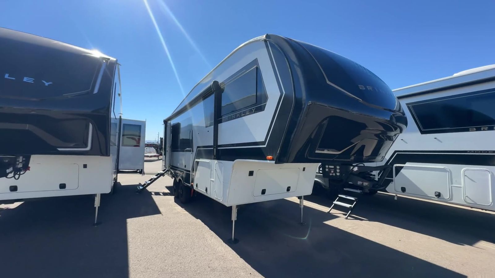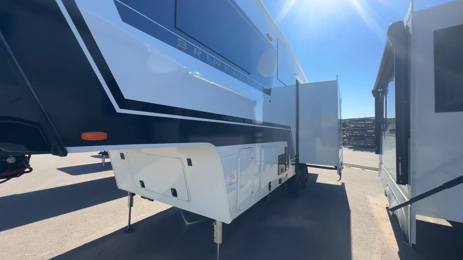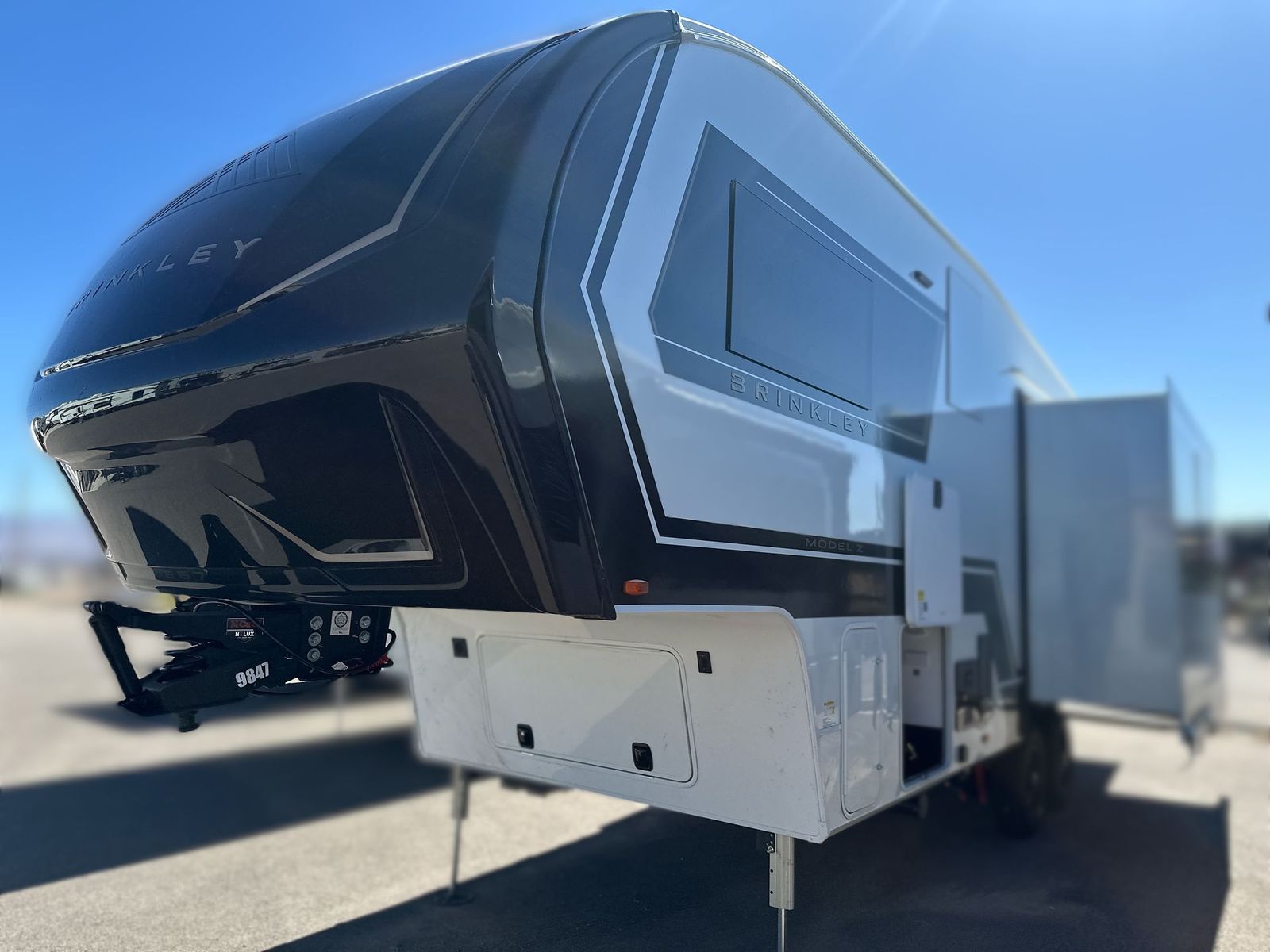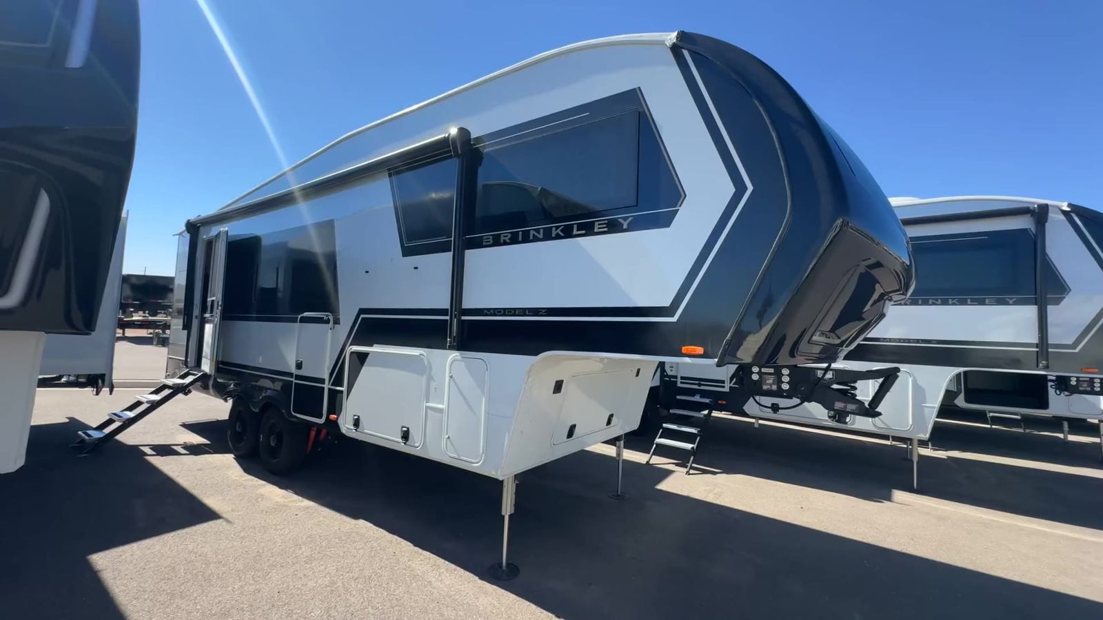 Brinkley Model Z fifth wheel 2670 highlights: 50" Articulating TV 12V Outdoor Refrigerator Queen Bed Pantry with Drawers You'll love every minute spent in this luxury fifth wheel! Your crew can get comfortable in the rear living room on the 72" tri-fold sofa that converts to a 62" x 70" bed, or on the theater seating within the slide out. There is also a sliding dining table and a TV with swivel so everyone can have a good view of the movie. A full kitchen, complete with a cooktop, 30" residential microwave, and 16 cu. ft. refrigerator will let you cook and store food, and there is a handy trash bin with a Stow N' Go paper towel holder for easy clean up. The full bath will let you freshen up before heading to bed in the front private bedroom! The Brinkley mid-profile Model Z fifth wheels bring you clean lines and an upscale look with plenty of style and exciting new features like the industry first brass plumbing connections.These units also feature an automotive grade front cap, plenty of exterior storage, dual exterior hot and cold showers, and wide stance leveling jacks for easy set up.Residential frameless windows provide a clean look and beautiful views, and ample electrical outlets and USB/USB-C outlets allow all of your electronics and appliances to easily be used and charged.