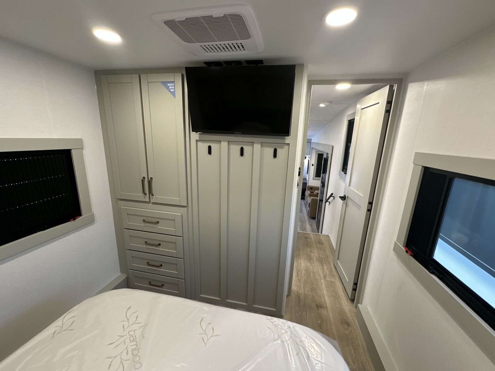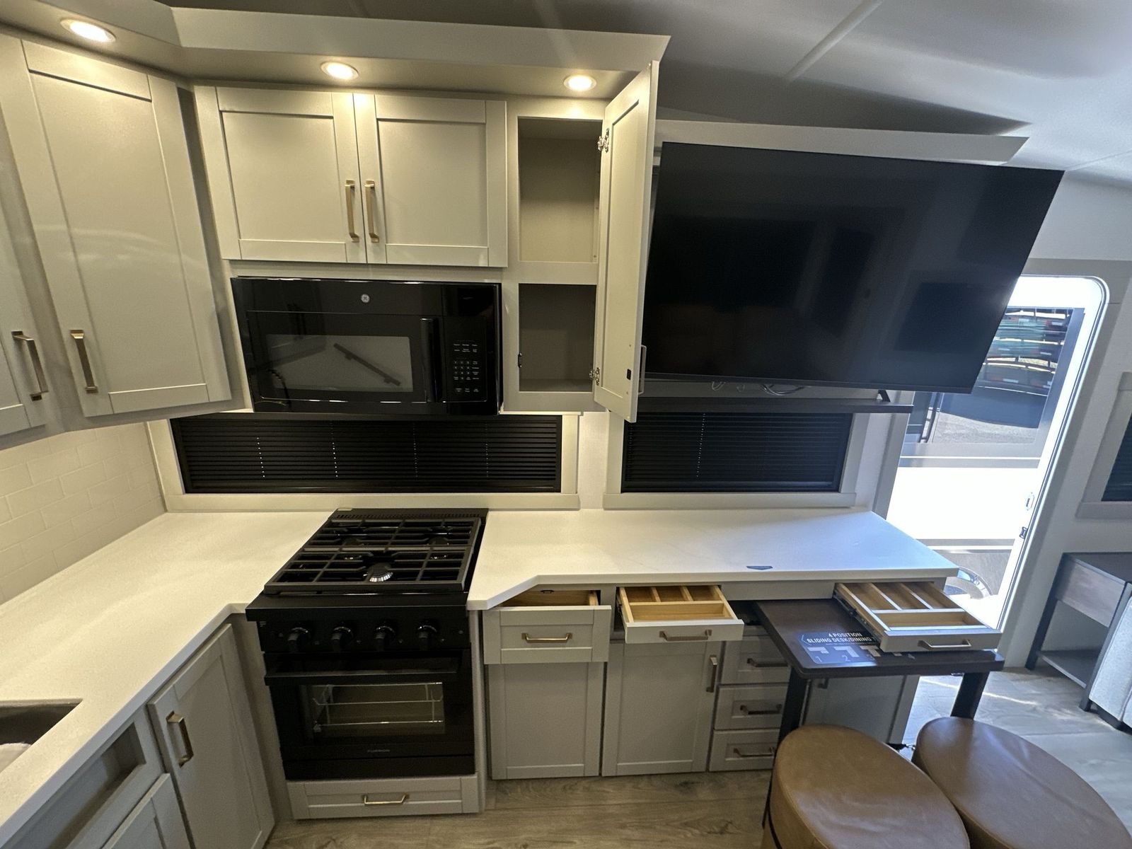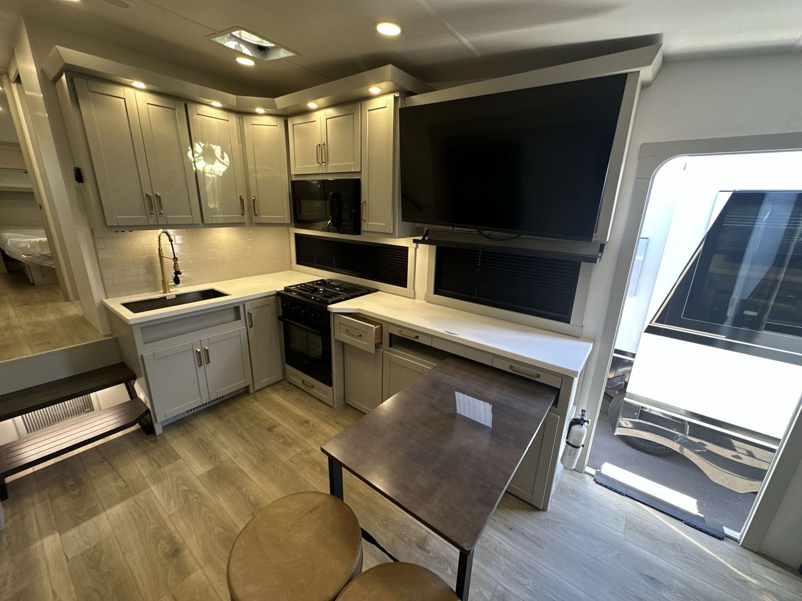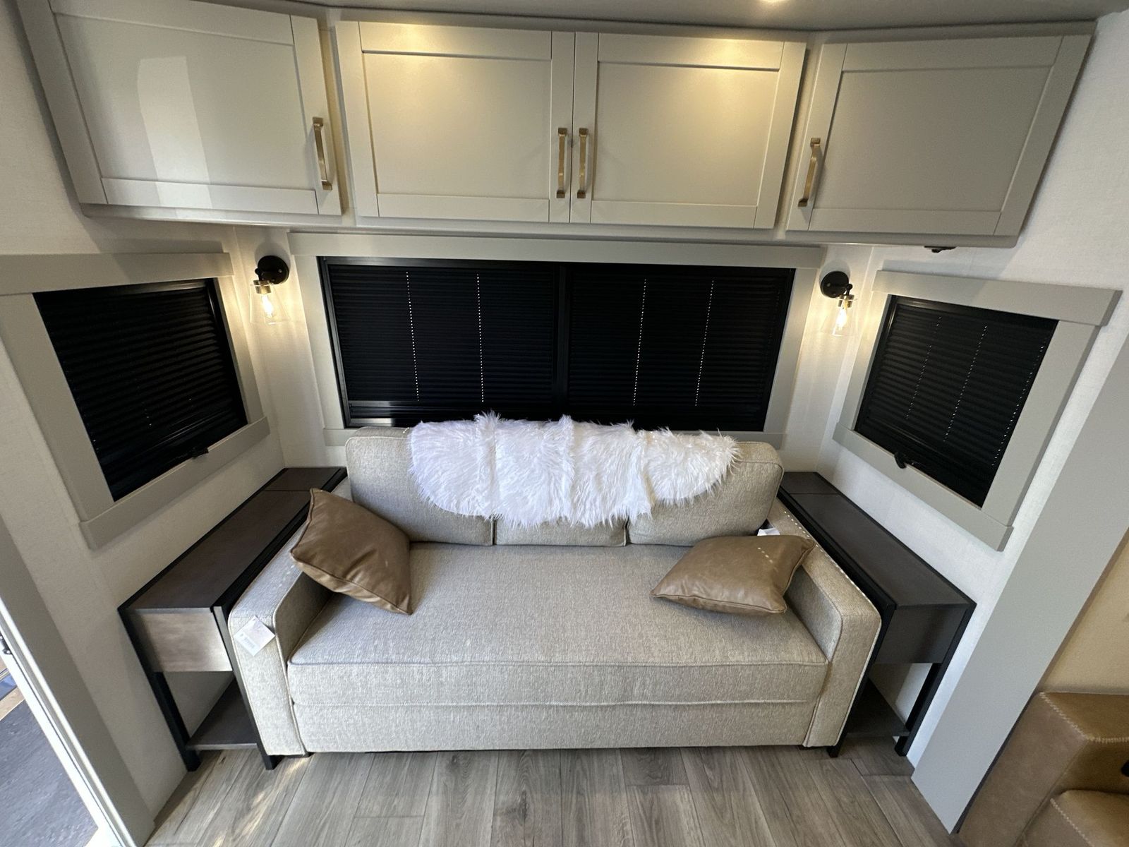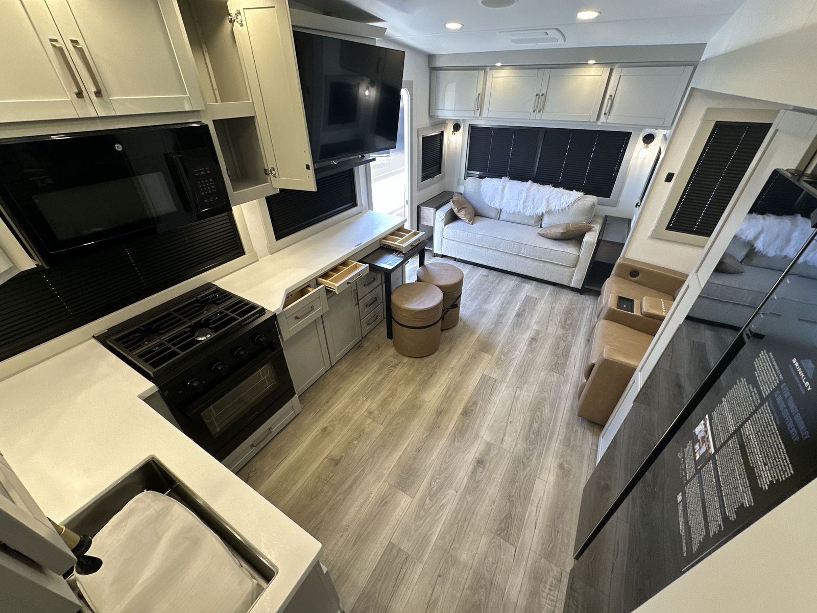 Brinkley Model Z fifth wheel 2670 highlights: 50" Articulating TV 12V Outdoor Refrigerator Queen Bed Pantry with Drawers You'll love every minute spent in this luxury fifth wheel! Your crew can get comfortable in the rear living room on the 72" tri-fold sofa that converts to a 62" x 70" bed, or on the theater seating within the slide out. There is also a sliding dining table and a TV with swivel so everyone can have a good view of the movie. A full kitchen, complete with a cooktop, 30" residential microwave, and 16 cu. ft. refrigerator will let you cook and store food, and there is a handy trash bin with a Stow N' Go paper towel holder for easy clean up. The full bath will let you freshen up before heading to bed in the front private bedroom! The Brinkley mid-profile Model Z fifth wheels bring you clean lines and an upscale look with plenty of style and exciting new features like the industry first brass plumbing connections.These units also feature an automotive grade front cap, plenty of exterior storage, dual exterior hot and cold showers, and wide stance leveling jacks for easy set up.Residential frameless windows provide a clean look and beautiful views, and ample electrical outlets and USB/USB-C outlets allow all of your electronics and appliances to easily be used and charged.