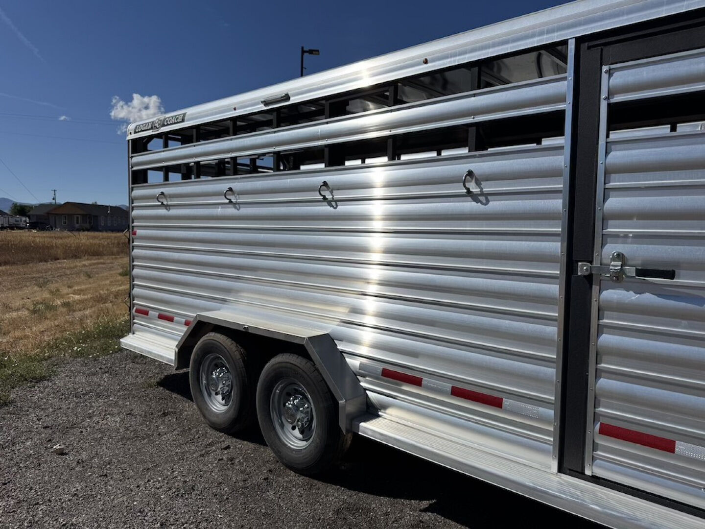 ### Logan Coach 22' Stock Combo **The Trailer That Does It All — Horses, Cattle, and Everything in Between** The ever-popular **22' Logan Coach Stock Combo** is built for folks who need one trailer that can truly do it all. Whether you’re hauling horses, cattle, or a mix of both, this model delivers Logan’s legendary durability and smart design from front to back. **Key Features:** * **22' Length** – ideal balance of space and maneuverability * **7' Tall x 7'3" Wide** – roomy interior for horses or livestock * **Whiz-Proof Aluminum Slatted Floor** – strong, quiet, and easy to clean * **(2) 7,000 lb Axles** – dependable strength for heavy loads * **4' Tack Room** – swing-out saddle rack, bridle hooks, carpeted floor, and brush tray * **Full-Height Center Gate** – separates compartments for flexible hauling * **Single Rear Door with Slam Latches** – secure and easy to operate * **Vortex Coated Frame** – rust-resistant protection inside and out * **LED Lighting and Spare Tire** – ready for the road, day or night From the ranch to the rodeo, the **Logan Coach 22' Stock Combo** is the go-to choice for anyone who needs a versatile, long-lasting trailer that’s ready for whatever the day brings. **In stock and ready to roll!** Don’t wait—these 22’ Stock Combos are among our fastest sellers. **Call today or stop by to see why this Logan Coach continues to be our most popular model year after year.**