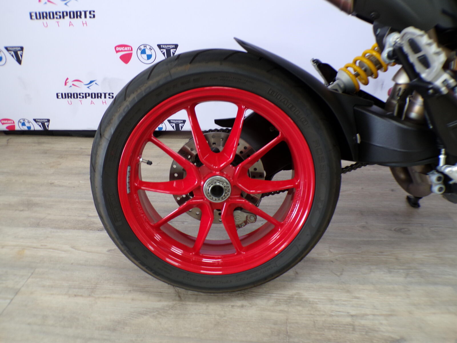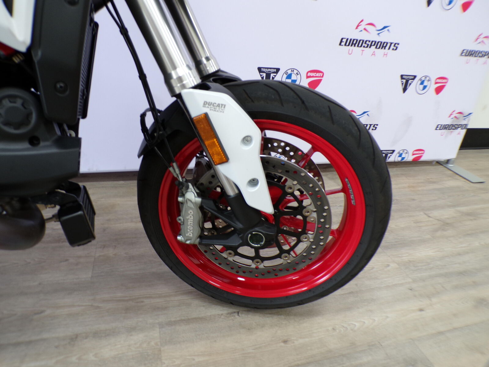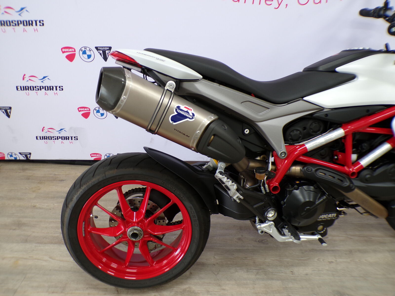 2018 Ducati Hypermotard with only 2348 miles. Call or Text us @ 801-618-2700 with any questions Need Financing? We can help! Engine & PerformanceEngine: 937cc Testastretta 11°, Liquid-Cooled, L-Twin, 4-valve per cylinder, Desmodromic.Power: ~110 hp (81 kW) @ 9000 rpm.Torque: ~70 lb-ft (95 Nm) @ 7500 rpm.Transmission: 6-speed manual with a slipper clutch. Chassis & SuspensionFrame: Red Steel Trellis.Front Suspension: 43mm Upside-Down Fork (Marzocchi on standard, Öhlins on SP).Rear Suspension: Sachs Monoshock (fully adjustable on SP).Brakes: Brembo calipers, twin front discs, Bosch ABS.Wheels: 17-inch cast aluminum.Tires: Pirelli Diablo Rosso II (120/70 front, 180/55 rear). Dimensions & WeightDry Weight: ~399 lbs (181 kg).Wet Weight: ~450 lbs (204 kg).Seat Height: ~34.2 inches (870 mm).Fuel Capacity: 4.2 gallons (16L). Electronics & FeaturesDucati Safety Pack (DSP): 3-level ABS & 8-level Ducati Traction Control (DTC).Riding Modes: Sport, Touring, Urban (Race, Sport, Wet on SP).Controls: Ride-by-Wire throttle.Instrumentation: LCD display with gear indicator, trip computer, temps, etc..Design: Handguards with integrated LED turn signals, single-sided swingarm.