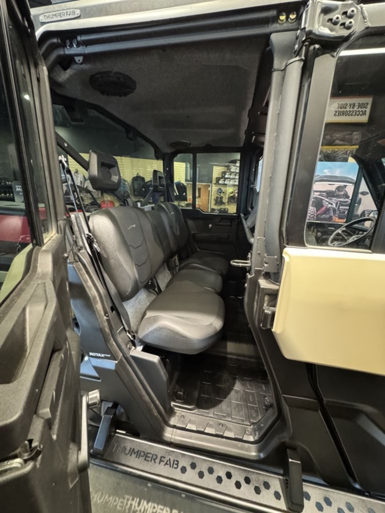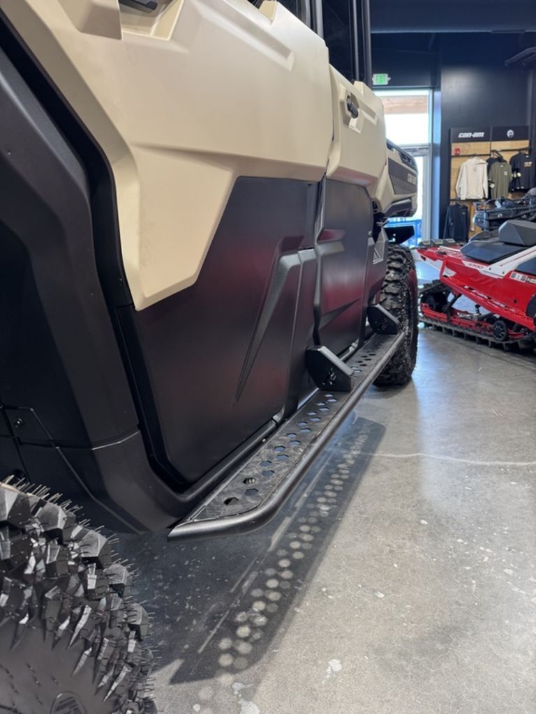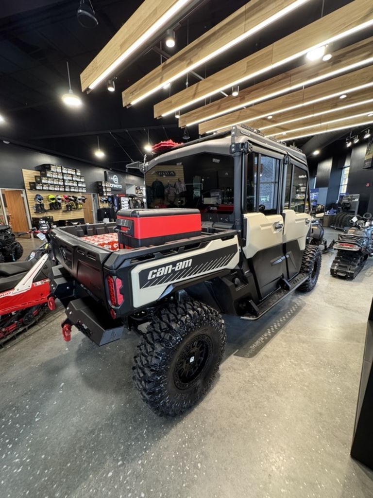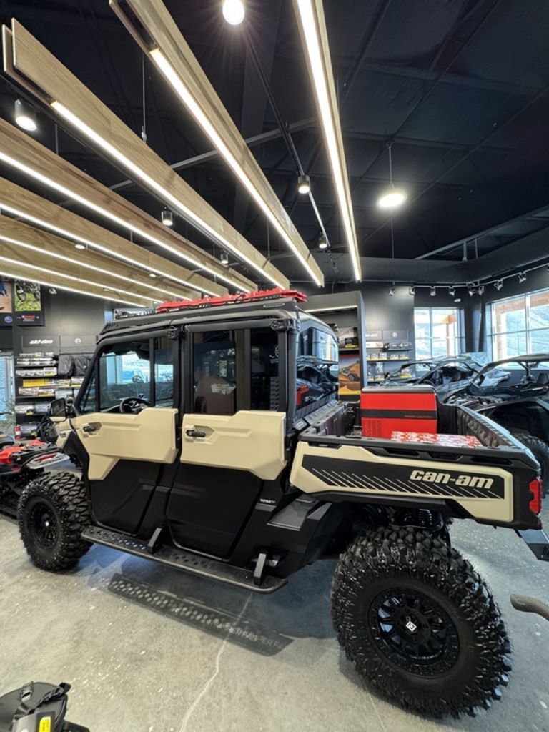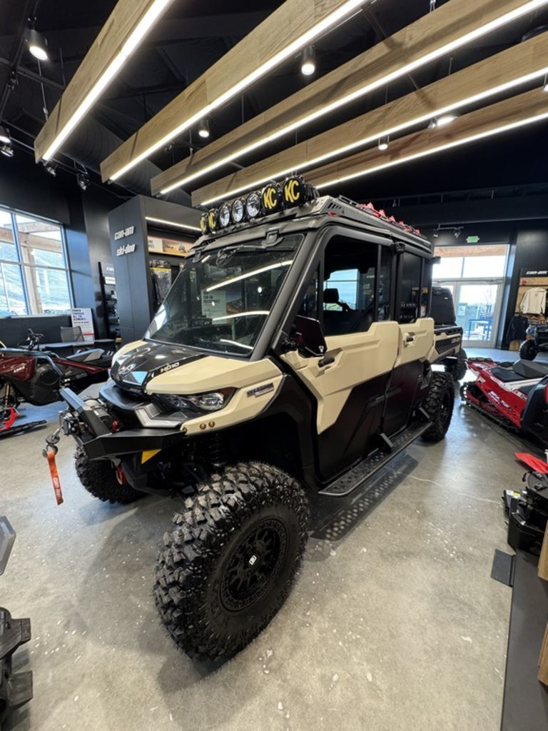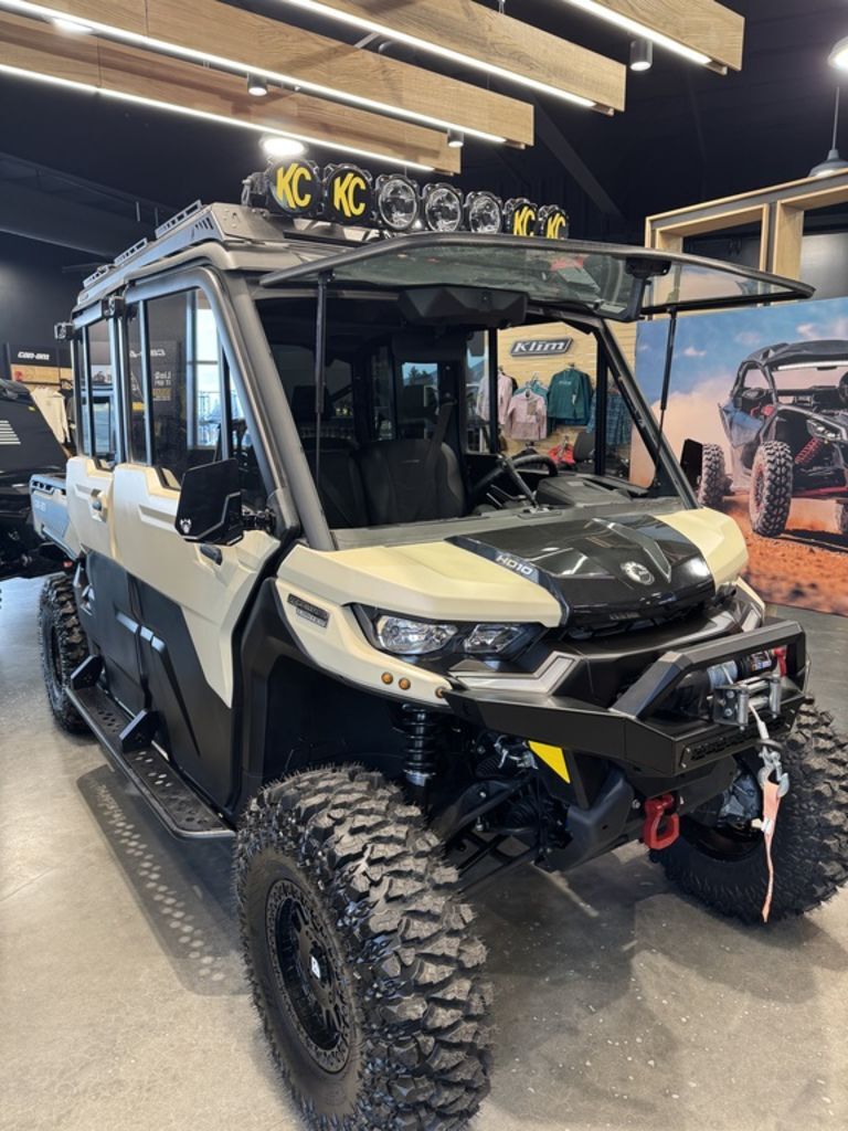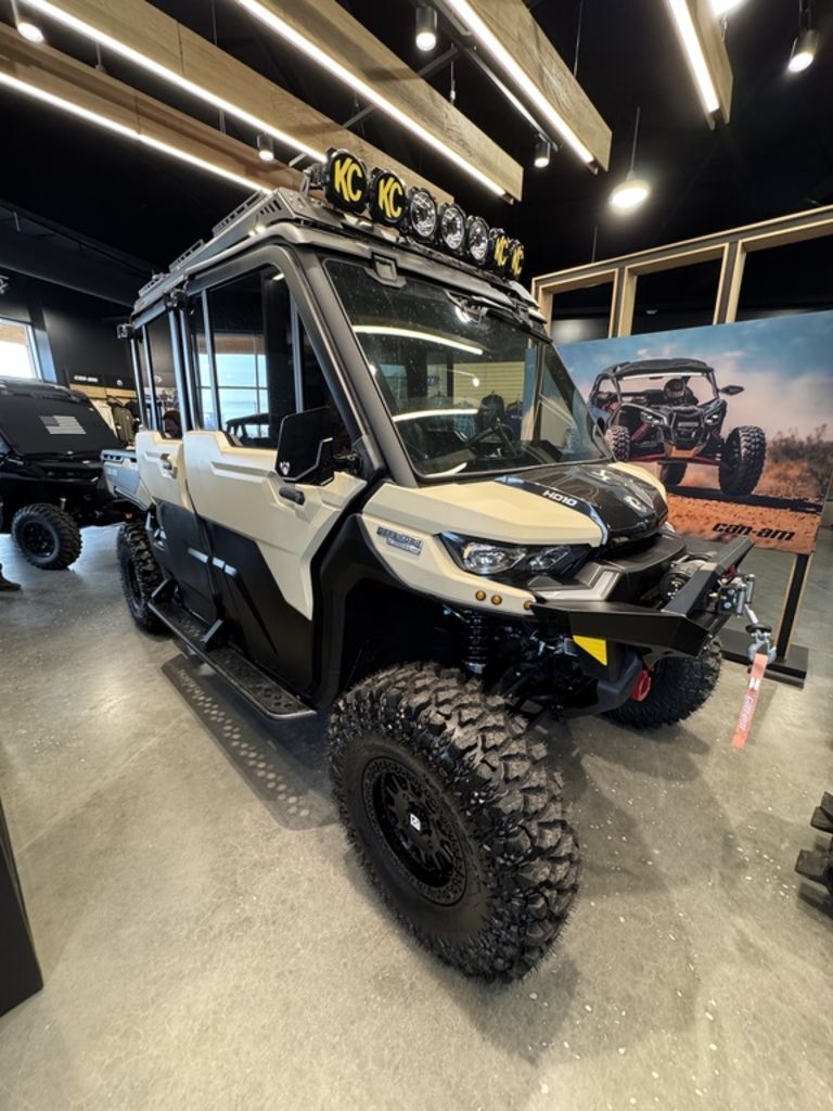 2025 Can-Am® Defender MAX Limited HD10 Desert Tan & Stealth BlackCOMFORT FOR THE WHOLE CREW. Standard 3-mode air conditioning turns the Defender MAX into the perfect way to ensure up to 6 people can work, travel and adapt as the conditions demand.Features may include:STEP IT UPVEHICLE ACCESSORIESChoose from a range of accessories that make hard work easier. Attach a plow to clear your own driveway. Or a winch to pull yourself out of a sticky situation. Instantly adapt for any task ahead.LOAD IT UPLINQ STORAGE SYSTEMAdd some LinQ accessories and you’ll be working smarter in no time. LinQ gives you room to pack more tools and carry more cargo. Easy on, easy off, pack 'em up and stack ‘em up.LET THE GOOD TUNES ROLLAUDIO ACCESSORIESPump up the jam with premium audio accessories that make your Can-Am sing. They're easy to install, plus they're powerful and durable. The audio roof makes work feel better with 6 speakers of total bliss.You set the limitsSometimes you just have to rein in all the power of this workhorse for seeding, crop spraying or moving cargo. With the new speed limiter available on all Defenders, you're the one in control. Get ready for peak work efficiency.More than just a roof over your headHere's the new waterproof sound system available in option. Six 7.7’’ speakers with Bluetooth compatibility, multi-colored LEDs, an RMC amp and a genuine Rockford Fosgate audio receiver to crank up your playlists when you’re out there in the fields herding or baling to the beat of your own drum. Sounds good? You bet!