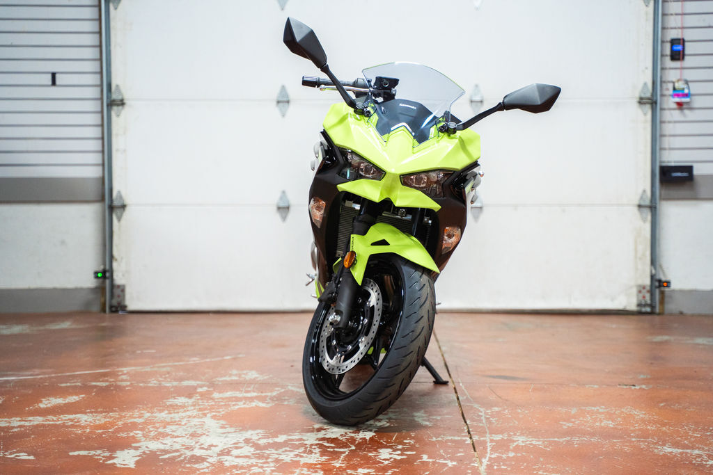 2026 Kawasaki Ninja® 500 ABS Metallic Yellowish Green/Ebony PERFORMANCE FOR EVERY RIDE Features may include: POWER BIG POWER. LIGHTWEIGHT PACKAGE. A robust engine, detail-driven design, advanced features, and supreme comfort are just the start of what makes the Ninja® 500 motorcycle impossible to ignore. This highly capable sportbike offers exhilaration across a broad skill spectrum—crafted with ample control for newer riders while offering some extra punch to appeal to a wide range of riders. HANDLING AGILITY FOR ALL Ample power is met with a lightweight, compact chassis for predictable handling and sharp maneuverability. From canyon roads to daily commutes, the Ninja® 500 is built to inspire more confidence. ERGONOMICS CRAFTED FOR COMFORT A sporty riding position, carefully selected materials, user-friendly design, and on-board amenities make the Ninja® 500 a perfectly comfortable ride. STYLING CLASSIC NINJA® APPEAL There’s no mistaking a Ninja®—and this ride is no different. Innovative style and bold design choices combine for a fresh, modern take on the iconic look. ADDITIONAL: Assist & Slipper Clutch Lightweight trellis frame Uni-Trak® rear suspension Available with Anti-lock Brake System (ABS)