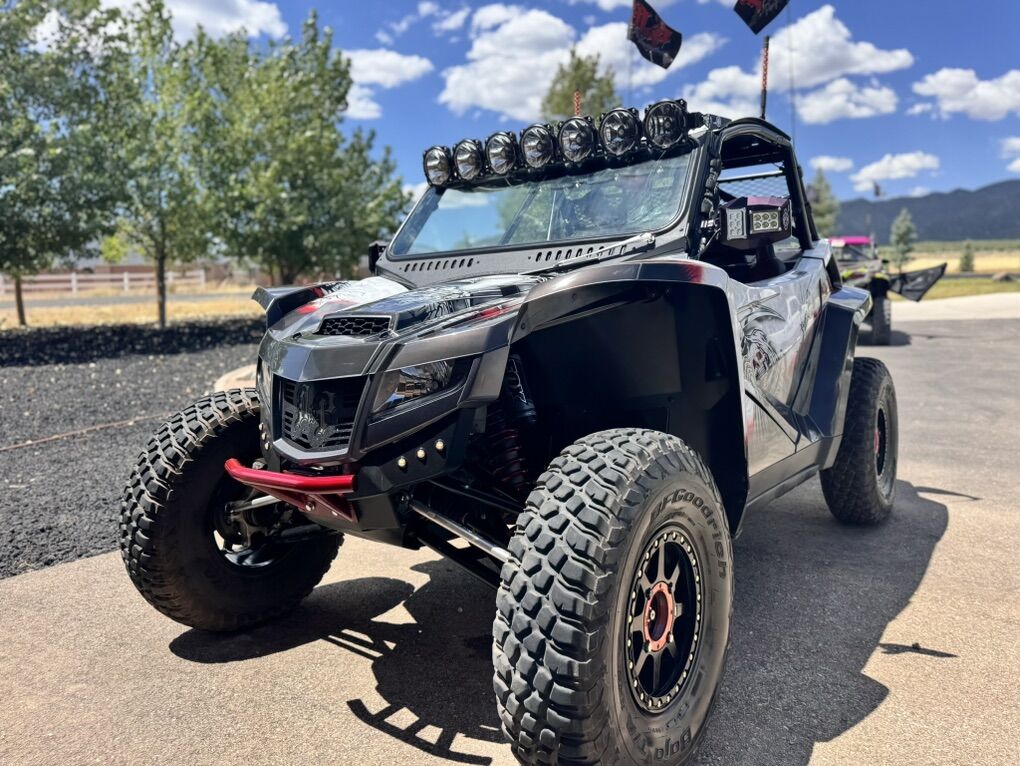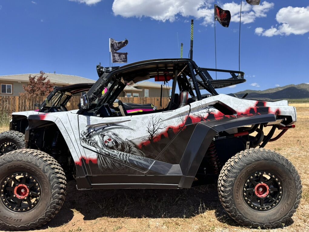 Has Gx Bead lock rims & over sized 32”BF Goodrich tires for multi purpose. Adjustable rear Fox shocks Full doors Powdered coated shock coils & hub caps Powder coated Front & real bumpers Air compressor under hood New custom wrap Exhaust system Duel Whips & flags Sector seven mirrors Light bar with six lights with switch in dash Custom grill Matching Spare tire with bed tie down bar Front & rear windshields ( front has a crack) Front windshield wiper manual. Custom cargo rack Antenna for push to talk Matching aftermarket Gas cap INSIDE Custom PRP Red two tone, heated Seats 1 child PRP seat Pro Armor harness Trax push to talk with head sets Air pumper system for 2 helmets with hoses. PRP Side and roof and bags Rear view mirror Assault racing steering wheel Fire extinguisher 1100 miles 4x4 & lockers Has a Experian report, title in hand
