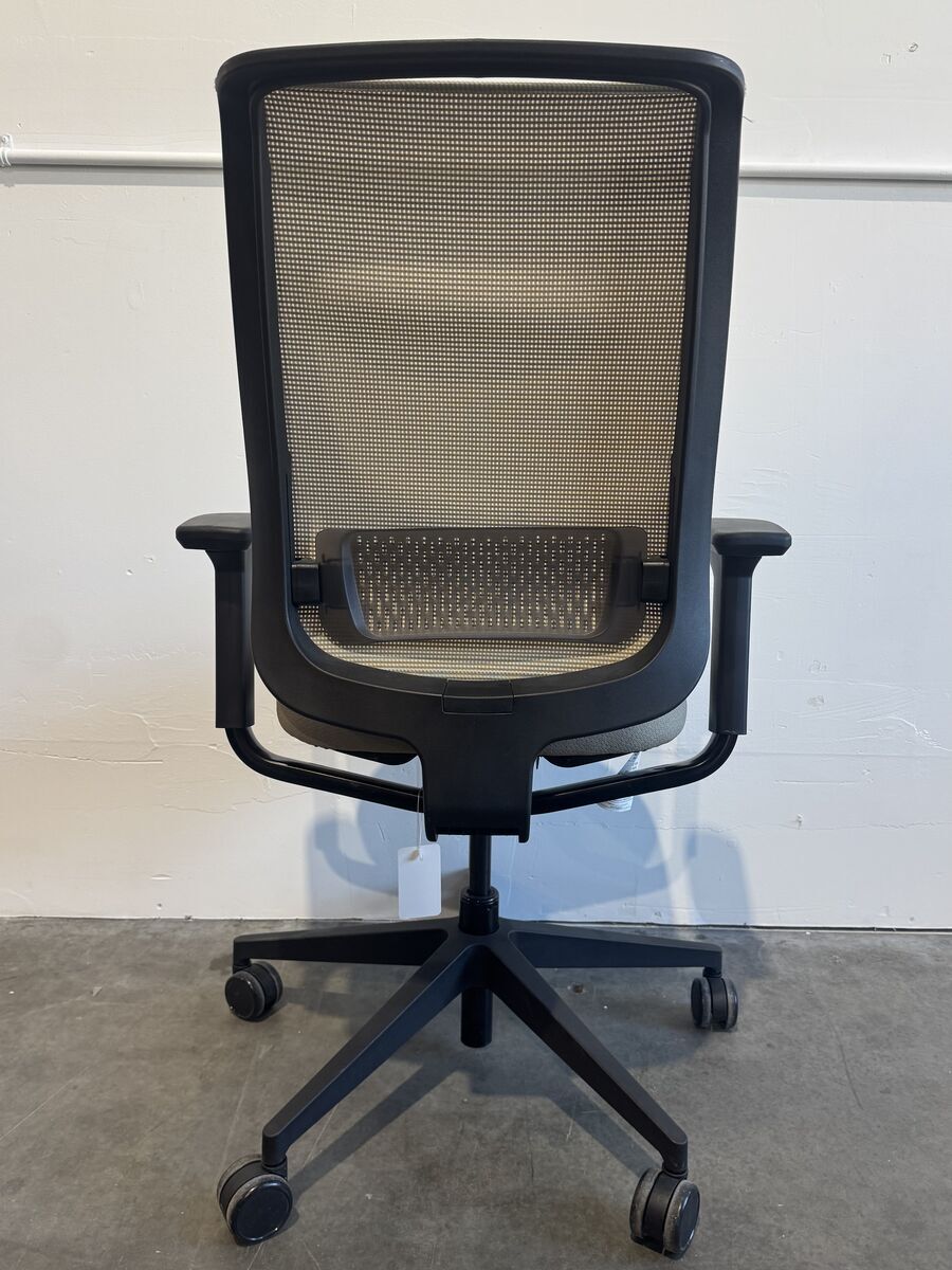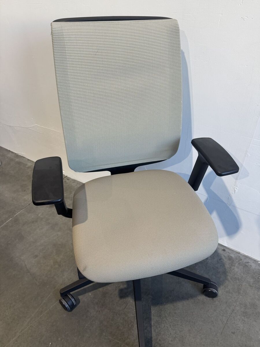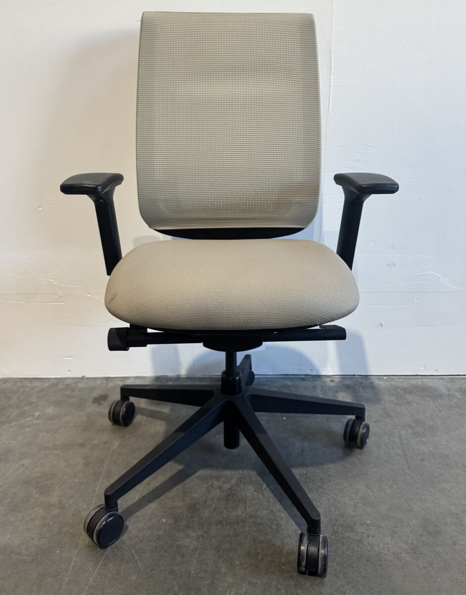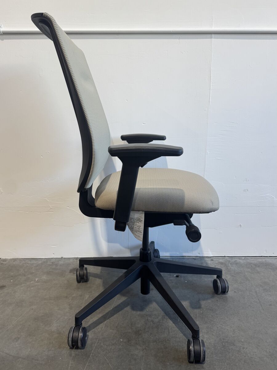 Rolling office task chair, adjustable height and arms, tan mesh back with tan cushion by Steelcase. 4 chairs available.