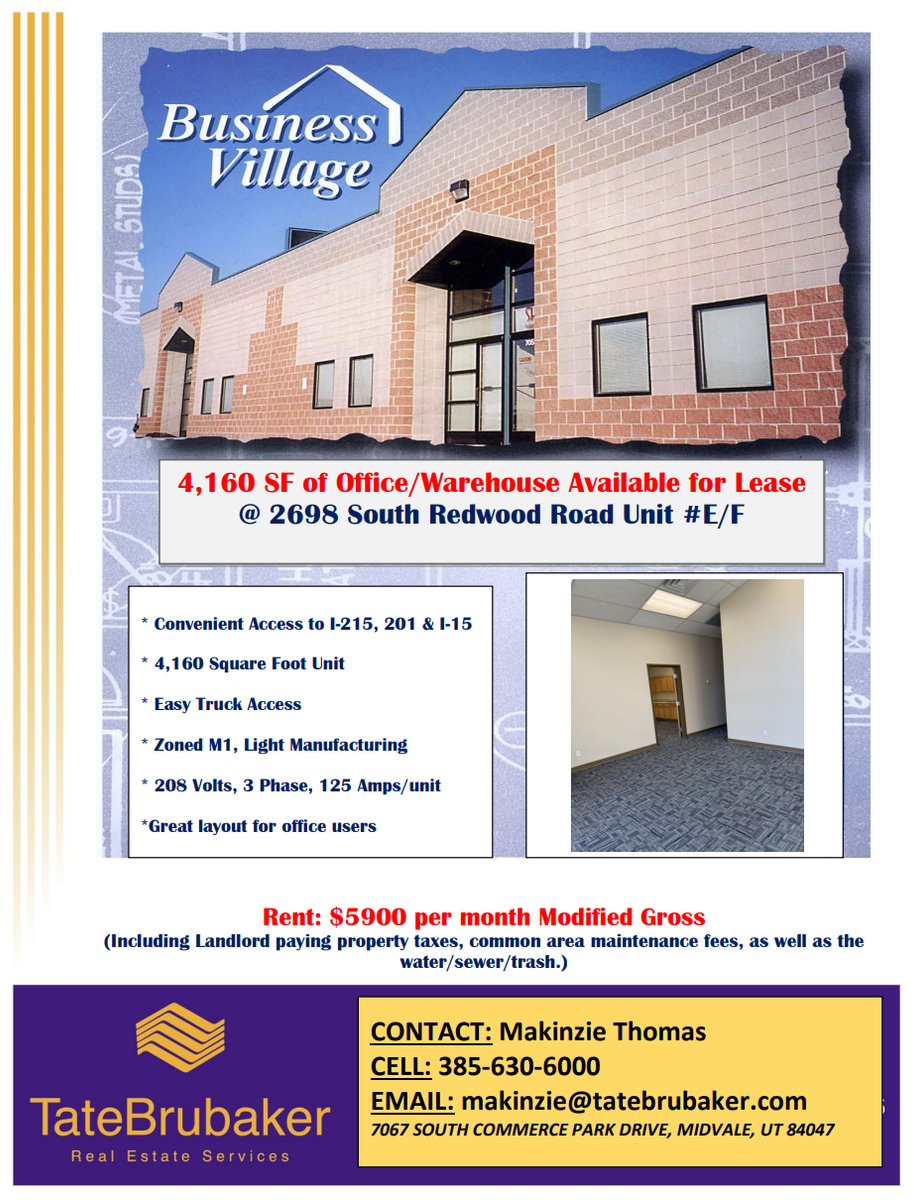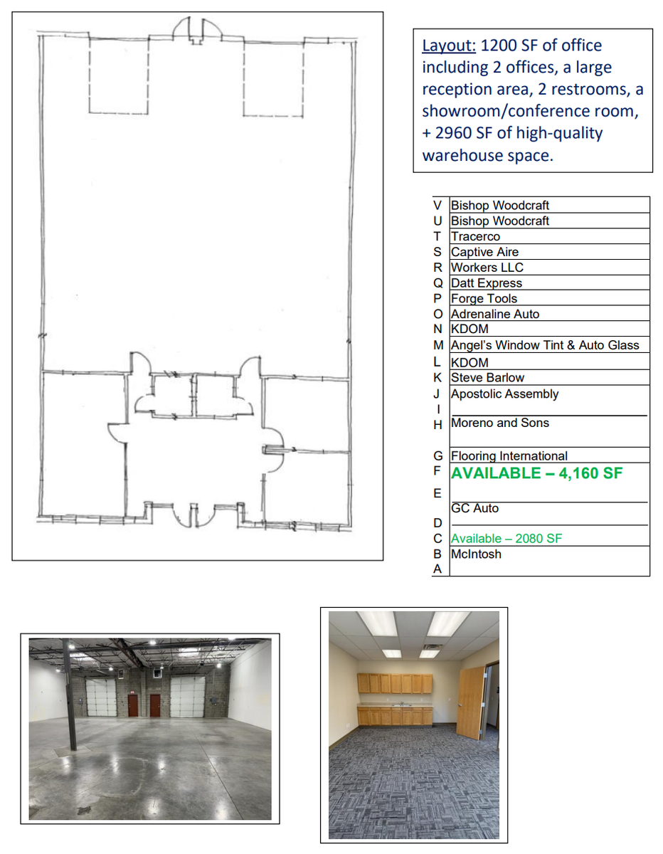 4160 SF of office/warehouse space available for lease immediately. This space has new carpet, paint, and restroom flooring and looks brand new and modern. The office is 1200 SF including a large reception area, two offices, two restrooms, and a conference room/showroom that includes cabinetry and a sink. The warehouse is 2960 SF and includes (2) 12' x 12' overhead garage doors. The rent is $5900 and tenant pays electricity, gas, and internet/security.
