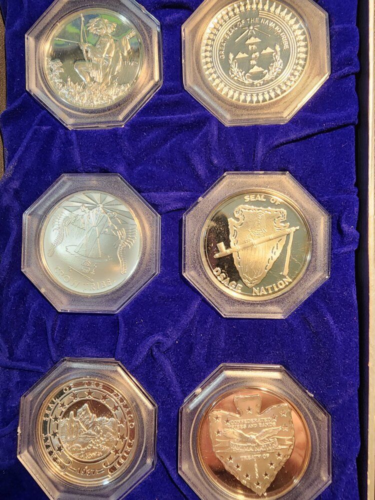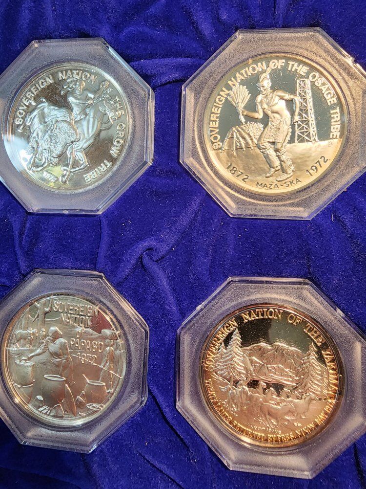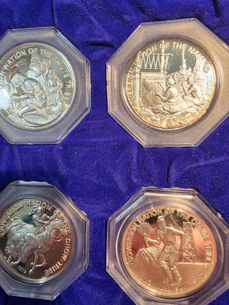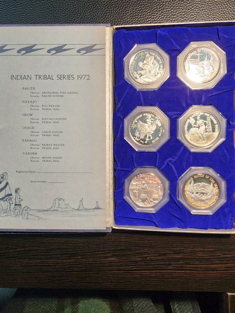 1972 INDIAN TRIBAL SERIES, 6 - .999 SILVER TRIBAL COINS-PAIUTE, NAVAJO, CROW, OSAGE, PAPAGO AND YAKIMA.