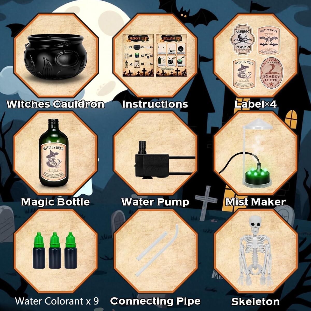 NEW IN BOX! Halloween 10” Floating Potion Cauldron Set with Mist Maker – DIY Spooky Witch Cauldron Décor with 9 Colorant Bottles (10)