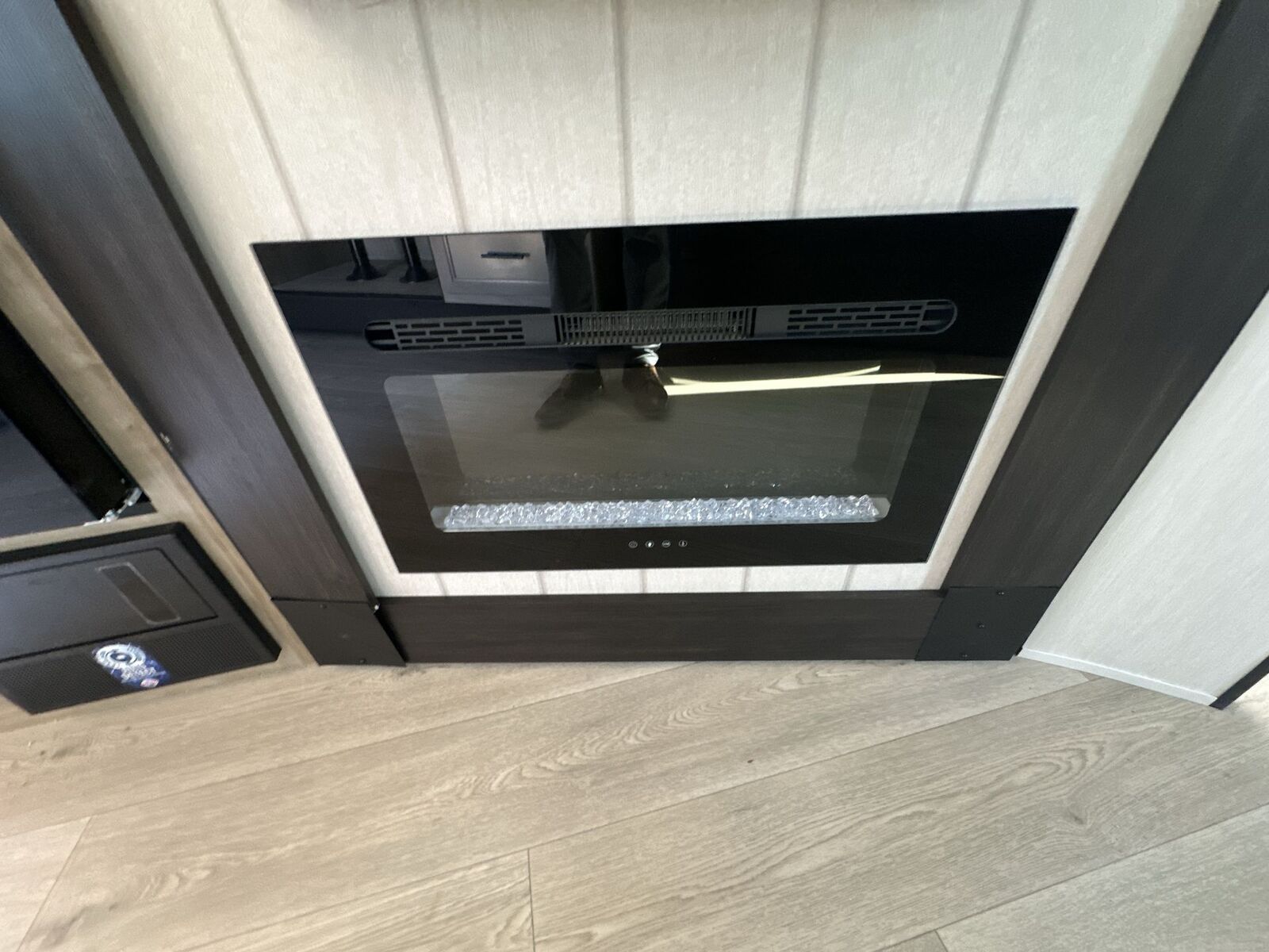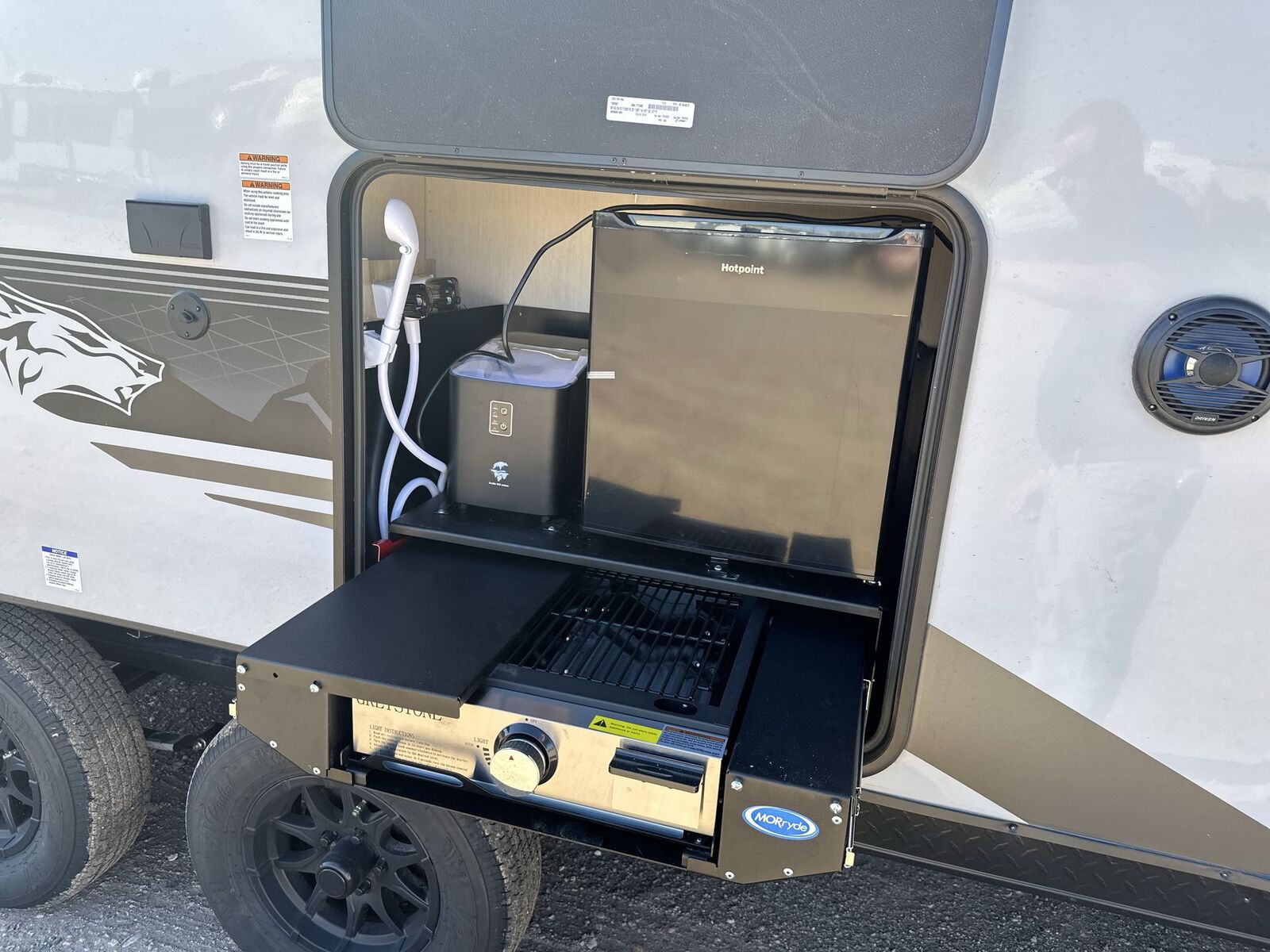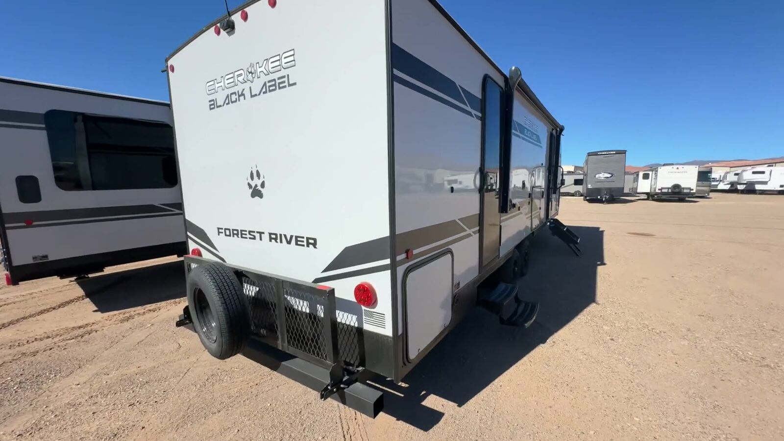 Forest River Cherokee Grey Wolf Black Label travel trailer 27GHBL highlights: Large Slide Out RV King Bed Outside Kitchen Rear Storage Rack Front Kitchen Since this travel trailer features dual entry doors, you can enter in through the rear master bedroom or the front kitchen; how convenient! The kitchen includes ample counter space and all the appliances to prep meals, along with a pantry up front and a hidden pantry behind the fireplace. Your crew can get comfortable on the sofa or play a game around the U-shaped dinette, although you may just find yourselves outdoors since there is an outside kitchen and a power awning with LED lights. The dual entry bath will let you enter in through the main living area, plus it has a private entrance into the bedroom. Here, you'll find an RV king bed, a wardrobe for your things, and USB ports to keep your electronics charged! The Cherokee Grey Wolf Black Label by Forest River feature distinctive features, at-home comforts, and durable construction materials so you can enjoy your RV for years to come, plus they are outstandingly affordable! You can choose between travel trailers, toy haulers, and even fish houses, depending on the camping style you prefer. The Black Label upgrade features fiberglass gel coat walls, frameless windows, upgraded solid surface countertops and more!