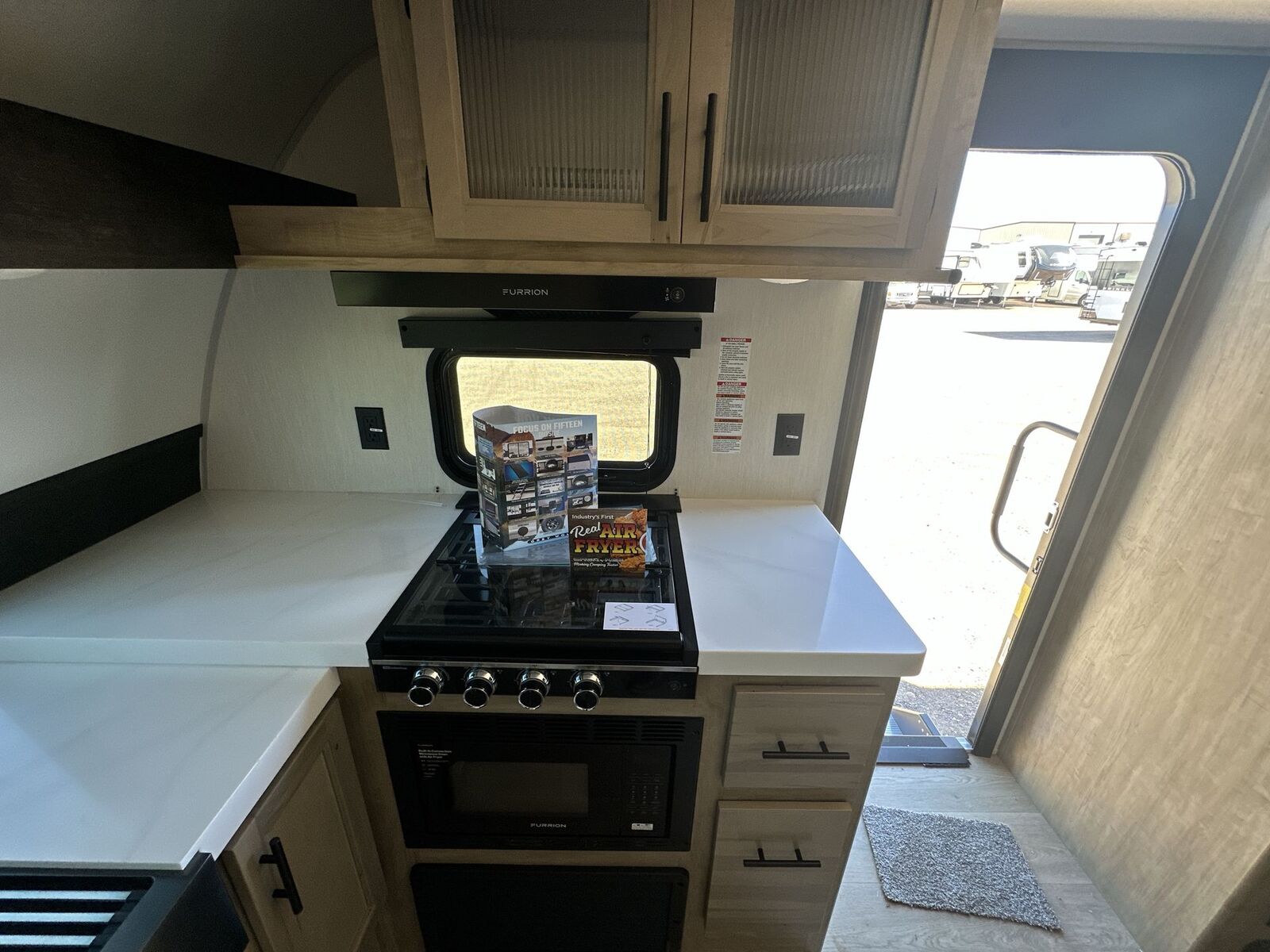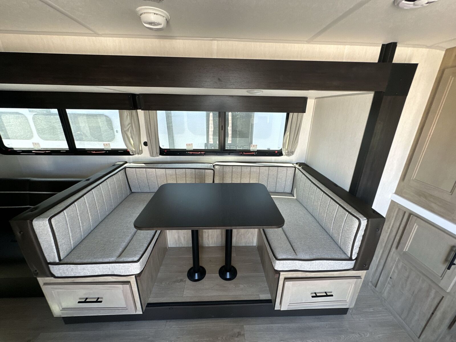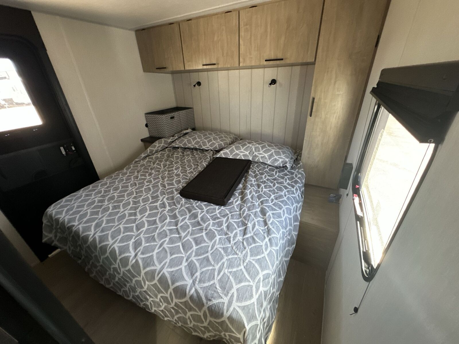 Forest River Cherokee Grey Wolf Black Label travel trailer 27GHBL highlights: Large Slide Out RV King Bed Outside Kitchen Rear Storage Rack Front Kitchen Since this travel trailer features dual entry doors, you can enter in through the rear master bedroom or the front kitchen; how convenient! The kitchen includes ample counter space and all the appliances to prep meals, along with a pantry up front and a hidden pantry behind the fireplace. Your crew can get comfortable on the sofa or play a game around the U-shaped dinette, although you may just find yourselves outdoors since there is an outside kitchen and a power awning with LED lights. The dual entry bath will let you enter in through the main living area, plus it has a private entrance into the bedroom. Here, you'll find an RV king bed, a wardrobe for your things, and USB ports to keep your electronics charged! The Cherokee Grey Wolf Black Label by Forest River feature distinctive features, at-home comforts, and durable construction materials so you can enjoy your RV for years to come, plus they are outstandingly affordable! You can choose between travel trailers, toy haulers, and even fish houses, depending on the camping style you prefer. The Black Label upgrade features fiberglass gel coat walls, frameless windows, upgraded solid surface countertops and more!