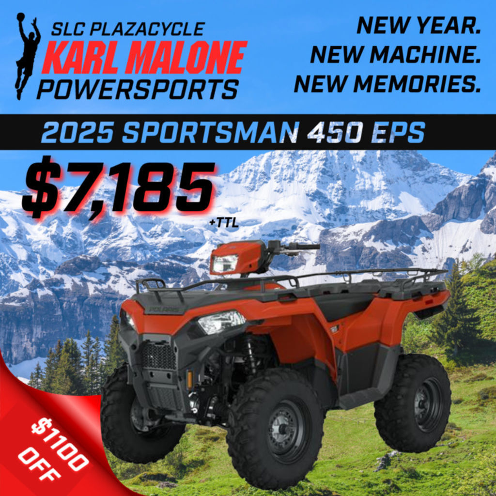 New 2025 Polaris Sportsman 450 H.O. EPS ATV For Sale In Salt Lake City, UT This New 2025 Polaris Sportsman 450 H.O. EPS ATV is for sale at Karl Malone Powersports SLC conveniently located in Salt Lake City, Utah. Our knowledgeable team is eager to assist you, so don’t hesitate to contact us today to schedule an appointment. If this isn't the exact Polaris ATV you're looking for don't hesitate to go back and revise your search. We're sure to have the perfect ATV for you in our showroom in Utah. We invite you to visit us at Utah’s premier Polaris dealer for new and pre-owned ATVs for sale. Let us help you find the ideal ATV to take home today! Karl Malone Powersports SLC Address: 1379 W 3300 S, Salt Lake City, UT 84119 Phone: (801) 972-8725 2025 Polaris Sportsman 450 H.O. EPS SPORTSMAN 450 PACKS MORE IN Equipped with industry-leading towing, ground clearance and 5 gallon storage, the 450 adds more capability for work or play. Features may include: STRONG Relentless, job-ready features for the daily grind. Improved Fit and Finish New shifter close-off and better seat fitment providing overall improved showroom appeal and enhanced ride comfort. Upgraded Clutch Sealing Take on more trails with confidence with improved clutch airflow to help keep water out. 1,350 Lb. Towing Pull trailers, and other vehicles, with confidence thanks to a work-ready towing capacity. 25" 6-Ply Tires Endure rough terrain with puncture-resistant walls and 12" steel wheels. 33 Horsepower Solid power for all-day riding in difficult conditions—or for when you just want to let it rip. SMOOTH Legendary Sportsman suspension delivers the smoothest ride to absorb bumps of all sizes. Suspension Industry-leading Sportsman suspension delivers more traction than the competition and helps you ride over even bigger obstacles. On-Demand AWD The industry's fastest-engaging On-Demand AWD. Only Polaris delivers instant power when the slightest wheel spin is detected. Trail-Taming Clearance Equipped with 11.5" of ground clearance to help you travel smoothly over rough terrain. Unmatched Travel No one can match our suspension with a class-leading 9 450 STANDARD FEATURES 33 HP Engine 48" Width 11.5" Ground Clearance 8.2"/9.5" Front/Rear Suspension Travel 25" Tires with 12" Steel Wheels 1,350 Lb. Towing Capacity with Factory-Installed Hitch Receiver Combined 270 Lb. Front & Rear Rack Capacity Pre-Wired for Handwarmers and Winch RIDE COMMAND+ with Accessory Purchase EPS TRIM INCLUDES: Multi-Select Electroni