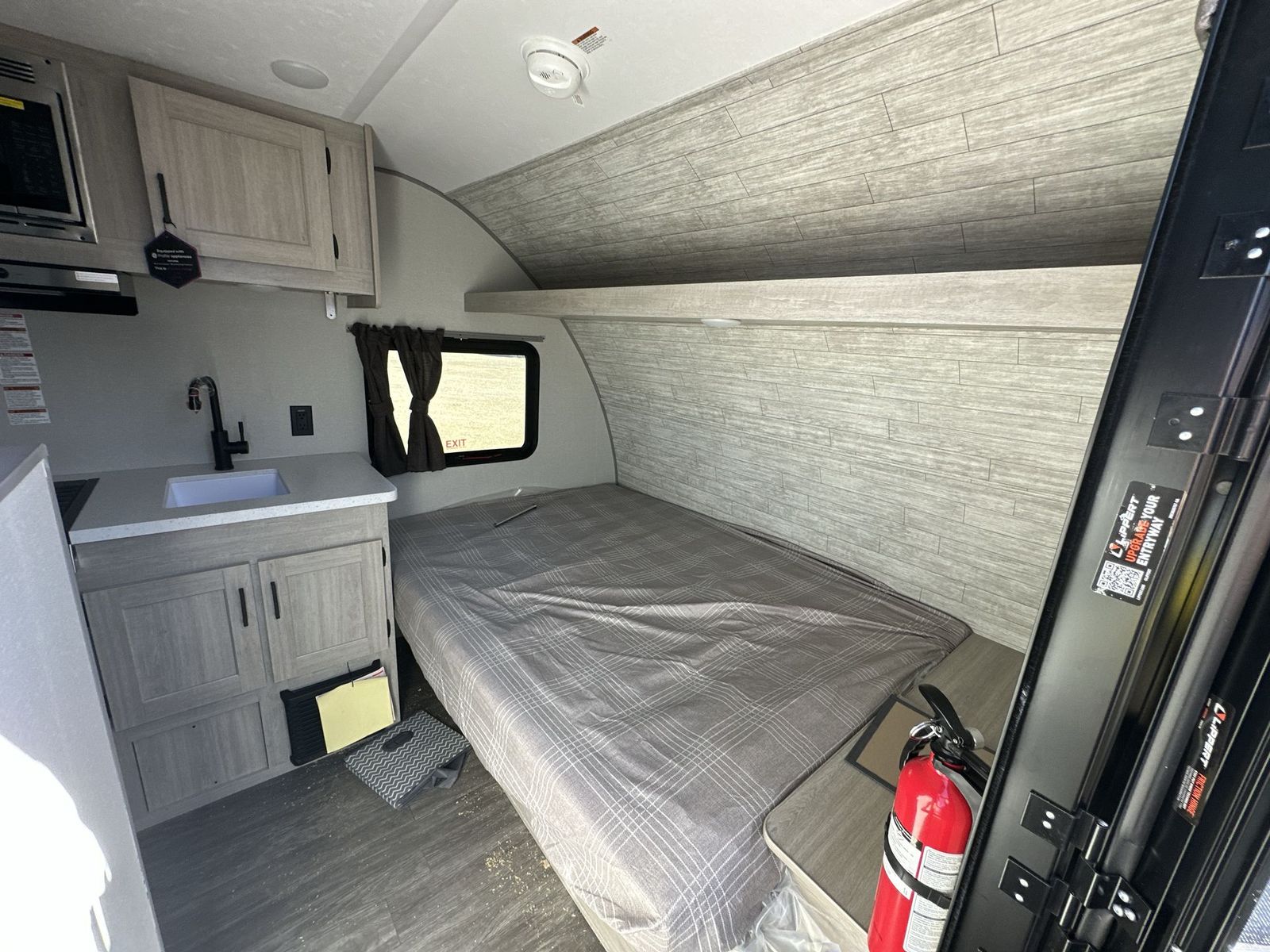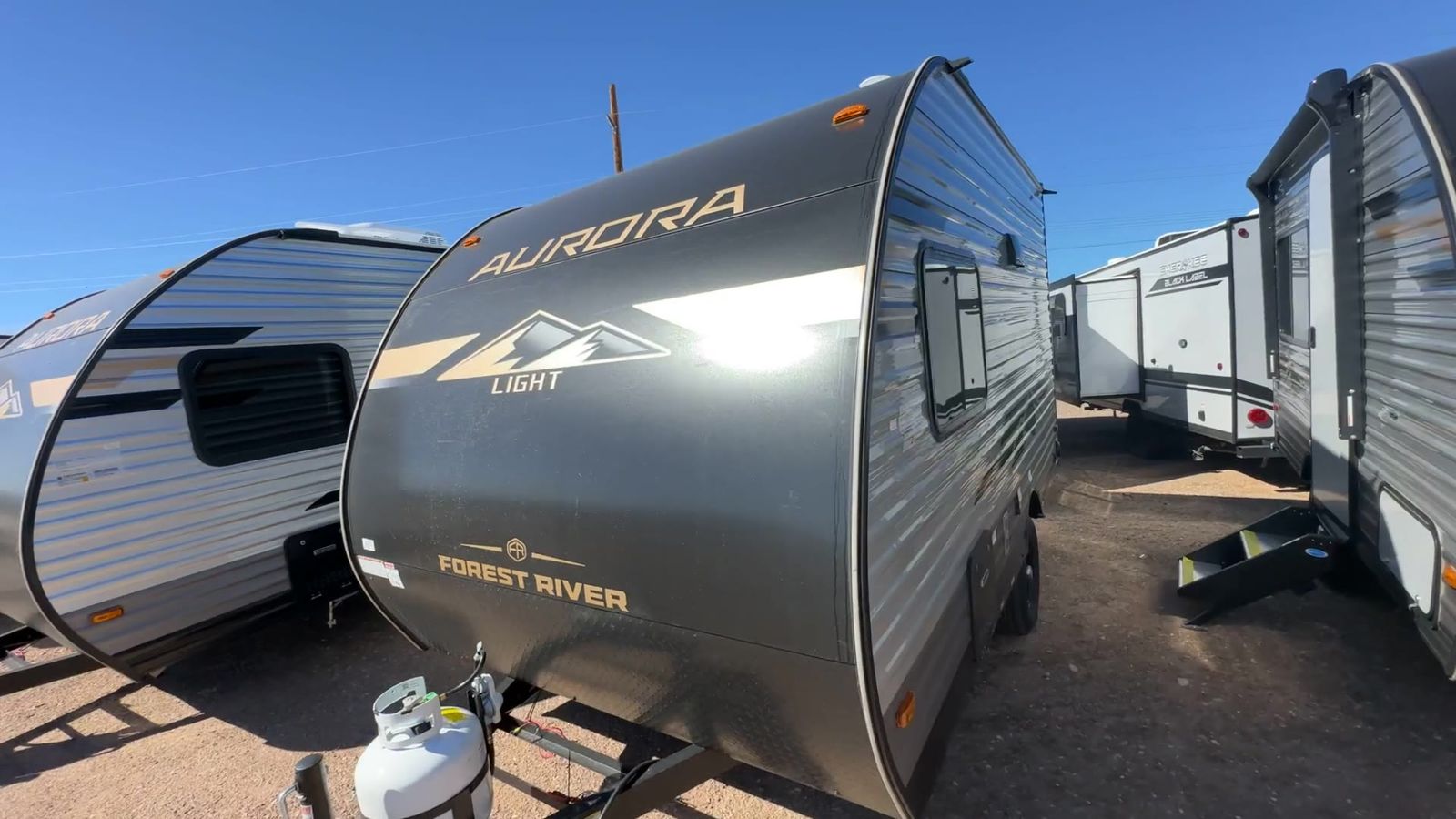 Forest River Aurora Light travel trailer 13BHX highlights: 54" x 74" Queen Bed Two Burner Gas Range Sleeps Four Exterior Storage This lightweight travel trailer includes everything you need for comfortable camping trips at the lake. You can make your meals on the two burner cooktop or in the stainless steel microwave, and a 3.3 cu. ft. 12V refrigerator will keep leftovers fresh. A front queen bed provides a great night's rest, and there are 29" x 70" bunk beds for your guests or little ones. And a private bath with a 24" x 32" shower and toilet will let you easily freshen up without having to use the camp's facilities! Comfortability, usability, and quality is what you will find in each one of these Forest River Aurora Light travel trailers! They are designed with a superior build and packed full with industry leading, functional, and distinctive standard features. The diamond plate rock guard will protect your unit from road debris and the nitrogen filled radial tires, which keep their pressure longer, offer better fuel economy. You will also find upgraded JBL Elite exterior speaker outside, an electric awning with multicolor lights and remote, plus flush mount baggage doors for easy packing. The interiors are beautifully designed with matte black kitchen and bath faucets, black nightshades in the living room, and GE kitchen appliances!