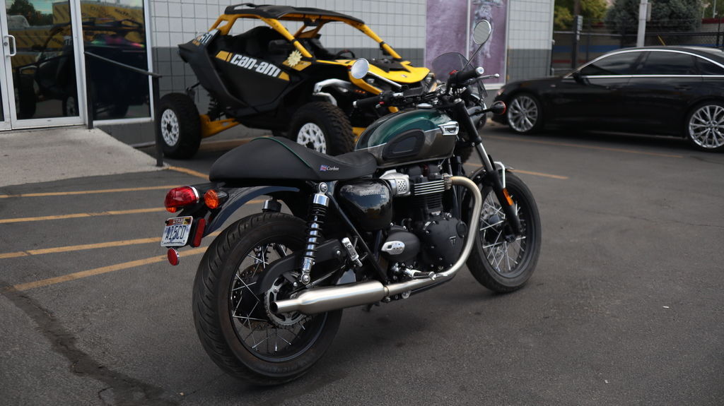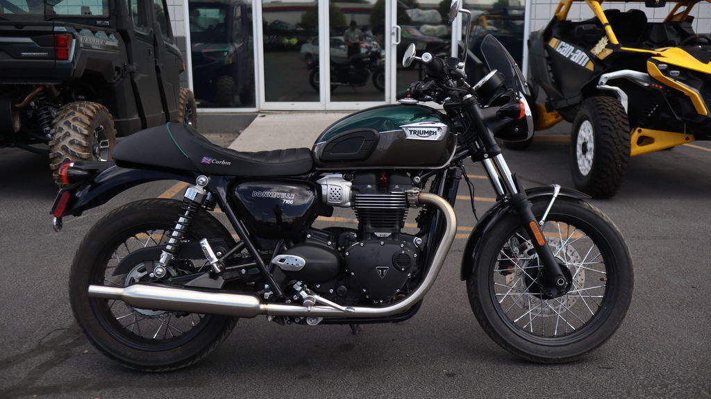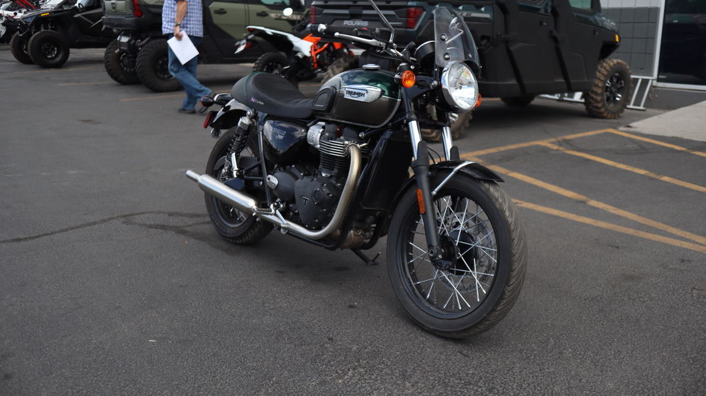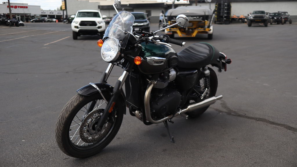 2025 Triumph Bonneville T100 Competition Green / Ironstone The evolution of a genuine motorcycle icon, the Bonneville T100 is now lighter and more powerful, with enhanced style and an even higher level of specification. Features may include: HIGHER POWER & PERFORMANCE The iconic 900cc parallel twin engine is now lighter and more responsive with 10 HP more power, making 64 HP at 7,400 rpm. INTUITIVE HANDLING Weight savings throughout the T100 and higher specification cartridge forks result in a more agile machine with easier handling. Engaging but manageable, neutral yet responsive. HIGHER SPECIFICATION BRAKES Paired with the latest ABS system, the updated 2-piston Brembo caliper gives improved power and feel for confident and safe braking in all conditions. ERGONOMICS AND COMFORT A comfortable dual seat with low 31.1 in height, relaxed riding position, light action torque-assist clutch and simple, ergonomically designed switches make for a confidence-inspiring, stress-free ride. WHEELS & TYRES The classically-styled 32-spoke wheels combine with specially developed Michelin Road Classic tires for confident, assured handling. INTEGRATED TECHNOLOGY Compact, rider-focused technology that includes the latest generation of ABS and switchable traction control, is sensitively incorporated into the T100’s beautiful classic style. BEAUTIFUL STYLE & FINISH Unmistakably iconic Bonneville character in a choice of three classic colors. Hand-painted coach lining on the tank and blacked-out finishes blend tradition with modern style. TWIN DIAL INSTRUMENTS Striking, yet easy-to-read in all light conditions, the premium 3D dial faces deliver all of the key information with precision and clarity. SAFETY A high-visibility LED rear light, quality Brembo brakes with ABS, and switchable traction control provide enhanced rider safety in all riding conditions.