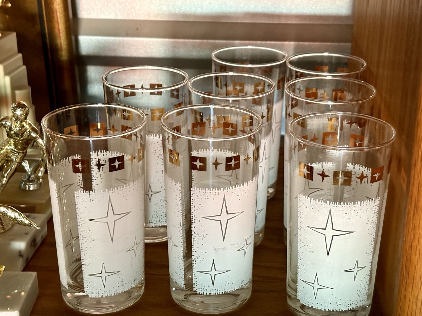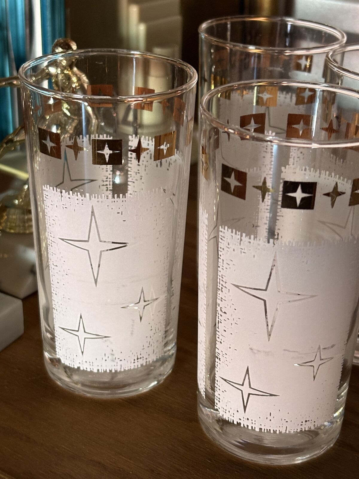 VenmoVintage Atomic Starburst Cosmic Glasses White Gold Star Collins Highball Barware MCM mid century modern set of 8