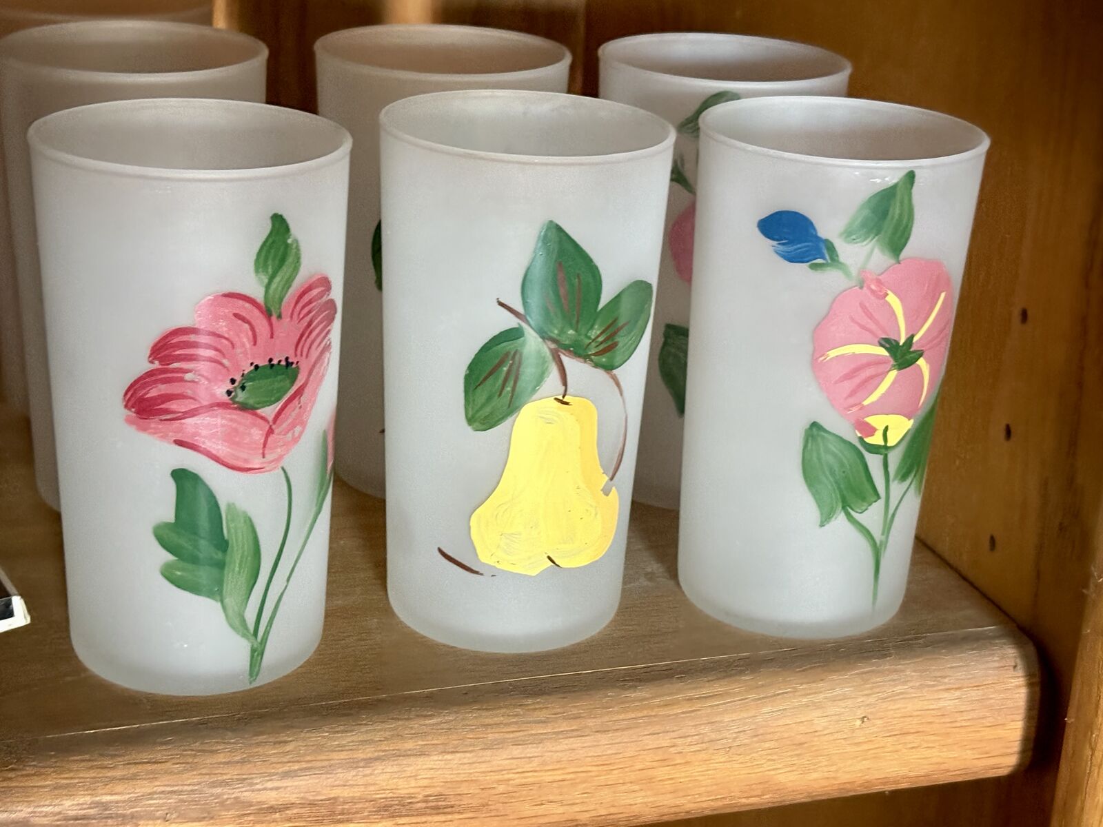 Venmo6 Vintage mid century Federal frosted glasses. Pears, flowers hand painted 4 are painted and 2 are blank