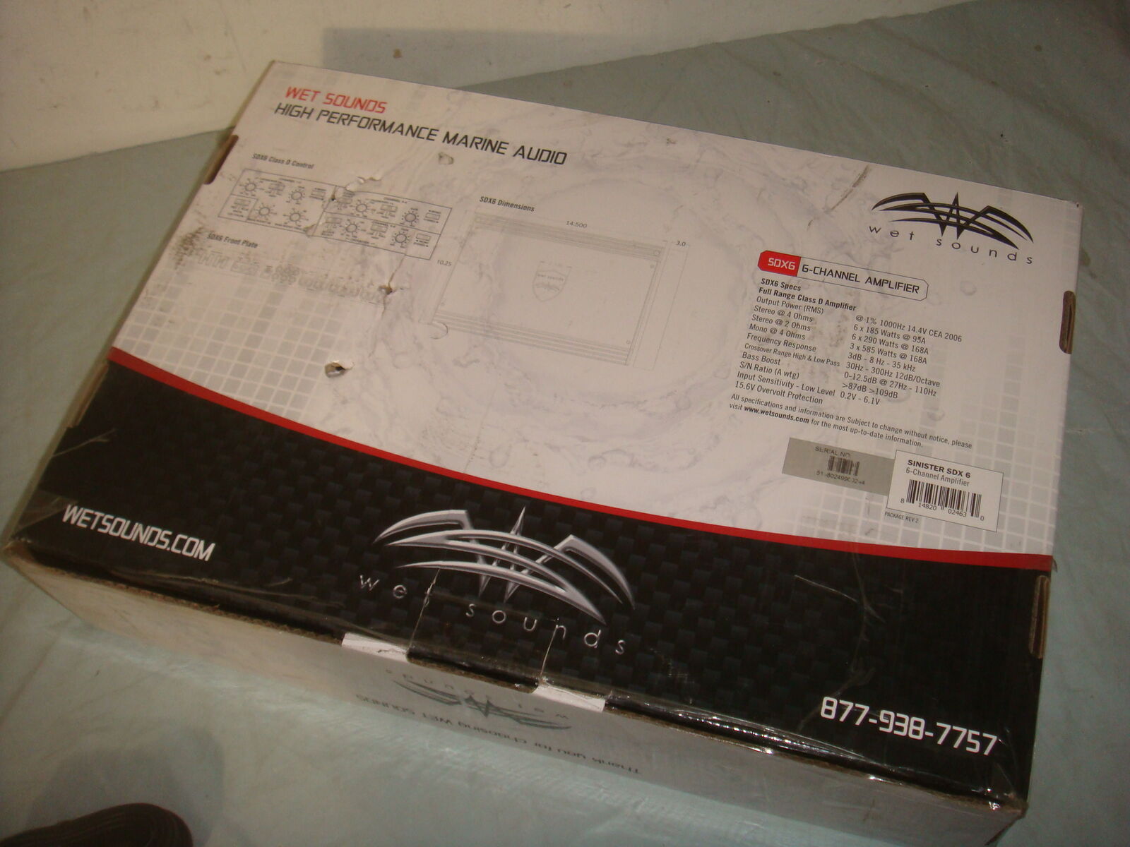 WET SOUNDS SDX6 SINISTER SERIES 6-CHANNEL MARINE AMPLIFIER - 185 WATTS RMS X 6. This is a brand new, never used amplifier. It was only opened for the photos and has never been used. There's a small ding in the original box, but the amp/contents are in new, unharmed, perfect condition! It comes with everything shown. This is your chance to save big-time so don't miss out!!
